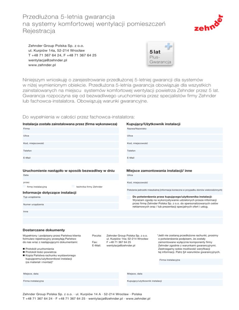 Przedłużona 5-letnia gwarancja na systemy komfortowej wentylacji pomieszczeń Rejestracja Zehnder Group Polska Sp. z o.o. ul. Kurpiów 14a, 52-214 Wrocław T +48 71 367 64 24, F +48 71 367 64 25 [email protected] www.zehnder.pl 5 lat PlusGwarancja Niniejszym wnioskuję o zarejestrowanie przedłużonej 5-letniej gwarancji dla systemów w niżej wymienionym obiekcie. Przedłużona 5-letnia gwarancja obowiązuje dla wszystkich zainstalowanych na miejscu systemów komfortowej wentylacji powietrza Zehnder przez 5 lat. Gwarancja rozpoczyna się od bezwadliwego uruchomienia przez specjalistów firmy Zehnder lub fachowca-instalatora. Obowiązują warunki gwarancyjne. Do wypełnienia w całości przez fachowca-instalatora: Instalacja została zainstalowana przez (firma wykonawcza) Kupujący/Użytkownik instalacji Firma Nazwa/Nazwisko Ulica Ulica Kod, miejscowość Kod, miejscowość Telefon Telefon E-Mail E-Mail Uruchomienie nastąpiło w sposób bezwadliwy w dniu Miejsce zamontowania instalacji/ inne Data Ulica przez firmę instalacyjną Kod, miejscowość technika firmy Zehnder Położenie jednostki mieszkalnej (informacja konieczna w przypadku domów wielorodzinnych) Informacje dotyczące instalacji Do potwierdzenia przez kupującego/użytkownika instalacji: Wyrażam zgodę na wykorzystywanie udzielonych przeze informacji przez firmę Zehnder Polska Sp. z o.o. do spersonalizowanych celów reklamowych oraz / lub prezentacji specjalnych ofert i usług. Typ urządzenia Numer urządzenia Inne Dostarczane dokumenty Wypełniony i podpisany przez Państwa klienta formularz rejestracyjny przesyłają Państwo do nas wraz z następującymi dokumentami: Poczta: Fax: E-Mail: Zehnder Group Polska Sp. z o.o. ul. Kurpiów 14a; 52-214 Wrocław F +48 71 367 64 25 [email protected] Protokół uruchomienia Protokół ilości powietrza Kopia Państwa rachunku wystawionego kupującemu/użytkownikowi instalacji (za materiał i montaż)* 10 *Jeśli nie zostaną przedłożone rachunki, prosimy o potwierdzenie podpisem, że zostały zamontowane wyłącznie komponenty firmy Zehnder zgodnie z warunkami gwarancyjnymi. Zastrzegamy sobie możliwość weryfikacji tej informacji. Patrz §4 warunków gwarancyjnych. Firma instalacyjna Miejsce, data Miejsce, data Firma instalacyjna Kupujący/użytkownik instalacji Zehnder Group Polska Sp. z o.o. · ul. Kurpiów 14 A · 52-214 Wrocław · Polska T +48 71 367 64 24 · F +48 71 367 64 25 · [email protected] · www.zehnder.pl