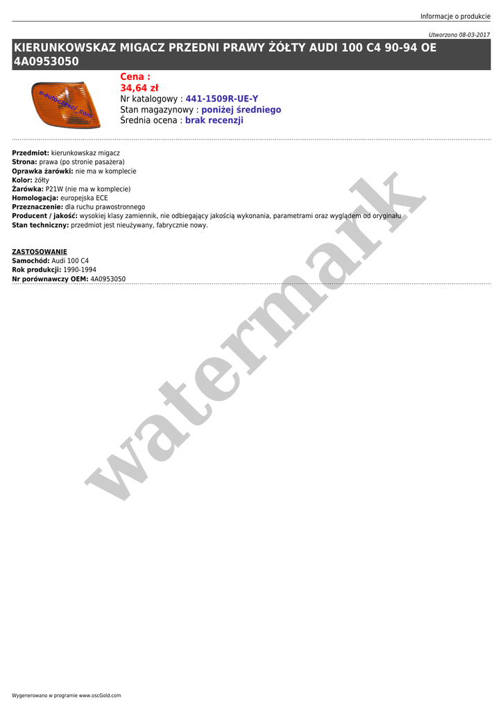 Informacje o produkcie Utworzono 08-03-2017 KIERUNKOWSKAZ MIGACZ PRZEDNI PRAWY ŻÓŁTY AUDI 100 C4 90-94 OE 4A0953050 Cena : 34,64 zł Nr katalogowy : 441-1509R-UE-Y Stan magazynowy : poniżej średniego Średnia ocena : brak recenzji w at ZASTOSOWANIE Samochód: Audi 100 C4 Rok produkcji: 1990-1994 Nr porównawczy OEM: 4A0953050 er m ar k Przedmiot: kierunkowskaz migacz Strona: prawa (po stronie pasażera) Oprawka żarówki: nie ma w komplecie Kolor: żółty Żarówka: P21W (nie ma w komplecie) Homologacja: europejska ECE Przeznaczenie: dla ruchu prawostronnego Producent / jakość: wysokiej klasy zamiennik, nie odbiegający jakością wykonania, parametrami oraz wyglądem od oryginału Stan techniczny: przedmiot jest nieużywany, fabrycznie nowy. Wygenerowano w programie www.oscGold.com