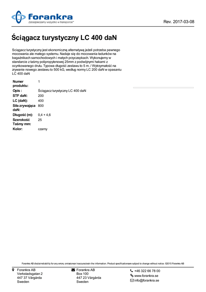 Rev. 2017-03-08 Ściągacz turystyczny LC 400 daN Sciągacz turystyczny jest ekonomiczną alternatywą jeżeli potrzeba pewnego mocowania ale małego systemu. Nadaje się do mocowania ładunków na bagażnikach samochodowych i małych przyczepkach. Wykonujemy w standarcie z taśmy polipropylenowej 25mm z podwójnymi hakami z ocynkowanego drutu. Typowa długość zestawu to 5 m. / Wytrzymałość na zrywanie nowego zestawu to 500 kG, według normy LC 200 daN w opasaniu LC 400 daN Numer produktu: Opis : STF daN: LC (daN): Siła zrywająca daN: Długość (m): Szerokość Taśmy mm: Kolor: 1 Ściągacz turystyczny LC 400 daN 200 400 800 0,4 + 4,6 25 czarny Forankra AB disclaimsliability for any errors, omissionsor inaccuraciesin the information. Product specificationsare subject to change without notice. ©2015 Forankra AB Forankra AB Verkstadsgatan 2 447 37 Vårgårda Sweden Forankra AB Box 100 447 23 Vårgårda Sweden +46 322 66 78 00 www.forankra.se [email protected]
