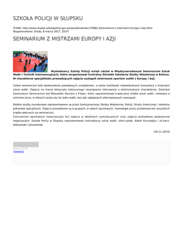 SZKOŁA POLICJI W SŁUPSKU Źródło: http://www.slupsk.szkolapolicji.gov.pl/sps/aktualnosci/70881,Seminarium-z-mistrzami-Europy-i-Azji.html Wygenerowano: Środa, 8 marca 2017, 20:07 SEMINARIUM Z MISTRZAMI EUROPY I AZJI Wykładowcy Szkoły Policji wzięli udział w Międzynarodowym Seminarium Sztuk Walki i Technik Interwencyjnych, które zorganizował Centralny Ośrodek Szkolenia Służby Więziennej w Kaliszu. W charakterze specjalistów prowadzących zajęcia wystąpili mistrzowie sportów waliki z Europy i Azji. Celem seminarium było doskonalenie posiadanych umiejętności, a także możliwość indywidualnych konsultacji z mistrzami sztuk walki. Zajęcia na macie dotyczyły taktycznego rozwiązania interwencji o ekstremalnym charakterze. Gościem honorowym Seminarium był Manuelito Herrera z Filipin, który zaprezentował tradycyjne źródła sztuk walki, mówiące o ochronie życia, w których szuka się nie tylko walki, lecz jak najlepszych alternatywnych rozwiązań. Polskie służby mundurowe reprezentowane są przez funkcjonariuszy Służby Więziennej, Policji, Straży Granicznej i żołnierzy jednostek specjalnych. Zajęcia prowadzone są w grupach, w salach sportowych, równolegle przez przedstawicieli wszystkich krajów obecnych na seminarium. Ćwiczeniom sportowym towarzyszyły też zajęcia w obiektach symulacyjnych oraz zajęcia wykładowe poświęcone negocjacjom. Szkołę Policji w Słupsku reprezentowali instruktorzy sztuk walki: sierż.sztab. Adam Kryszajtys i st.sierż. Aleksander Latuszewski. (16.11.2015) Ocena: 0/5 (0) Tweetnij