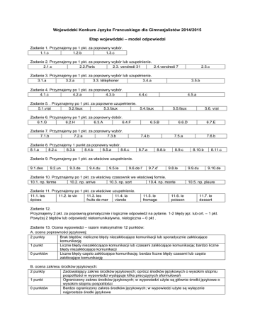 Wojewódzki Konkurs Języka Francuskiego dla Gimnazjalistów 2014/2015 Etap wojewódzki – model odpowiedzi Zadanie 1. Przyznajemy po 1 pkt. za poprawny wybór. 1.1.c 1.2.b 1.3.c Zadanie 2. Przyznajemy po 1 pkt. za poprawny wybór lub uzupełnienie. 2.1.c 2.2.Paris 2.3. vendredi 31 2.4.vendredi 7 2.5.c Zadanie 3. Przyznajemy po 1 pkt. za poprawny wybór lub uzupełnienie. 3.1.a 3.2.a 3.3. téléphoner 3.4.a Zadanie 4. Przyznajemy po 1 pkt. za poprawny wybór. 4.1.c 4.2.a 4.3.b 3.5.b 4.4.c 4.5.a Zadanie 5. . Przyznajemy po 1 pkt. za poprawne uzupełnienie. 5.1.vrai 5.2.faux 5.3.faux 5.4.faux Zadanie 6. Przyznajemy po 1 pkt. za poprawny dobór. 6.1.G 6.2.H 6.3.A 6.4.F Zadanie 7. Przyznajemy po 1 pkt. za poprawny wybór. 7.1.b 7.2.a 7.3.b 5.5.faux 6.5.B 7.4.b Zadanie 8. Przyznajemy 1 punkt za poprawny wybór. 8.1.a 8.2.c 8.3.b 8.4.b 8.5.a 8.6.c 8.7.a 5.6. vrai 6.6.D 6.7.E 7.5.a 8.8.b 8.9.c 7.6.b 8.10.b 8.11.c Zadanie 9. Przyznajemy po 1 pkt. za właściwe uzupełnienie. 9.1.des 9.2.un 9.3.de 9.4.du 9.5.le 9.6.de l’ 9.7.d’ 9.8.le Zadanie 10. Przyznajemy po 1 pkt. za właściwy czasownik we właściwej formie. 10.1. np. ferme 10.2. np. arrive 10.3. np. sort 10.4. np. monte Zadanie 11. Przyznajemy po 1 pkt. za właściwe uzupełnienie. 11.1. les 11.2. le vin 11.3. les 11.4. la épices fruits de mer viande 11.5. le fromage 11.6. le poisson 9.9.du 9.10.de 10.5. np. pleure 11.7. le dessert Zadanie 12. Przyznajemy 2 pkt. za poprawną gramatycznie i logicznie odpowiedź na pytanie. 1-2 błędy jęz. lub ort. – 1 pkt. Powyżej 2 błędów lub odpowiedź niekomunikatywna, nielogiczna – 0 pkt . Zadanie 13. Ocena wypowiedzi – razem maksymalnie 12 punktów: A. ocena poprawności językowej: 2 punkty Brak błędów; nieliczne błędy niezakłócające komunikacji lub sporadycznie zakłócające komunikację 1 punkt Liczne błędy niezakłócające komunikacji lub czasami zakłócające komunikację; bardzo liczne błędy niezakłócające komunikacji 0 punktów Liczne błędy często zakłócające komunikację; bardzo liczne błędy czasami lub często zakłócające komunikację B. ocena zakresu środków językowych: 2 punkty Zadowalający zakres środków językowych; oprócz środków językowych o wysokim stopniu pospolitości w wypowiedzi występuje kilka precyzyjnych sformułowań 1 punkt Ograniczony zakres środków językowych; w wypowiedzi użyte są głównie środki językowe o wysokim stopniu pospolitości 0 punktów Bardzo ograniczony zakres środków językowych; w wypowiedzi użyte są wyłącznie najprostsze środki językowe C. ocena umiejętności przekazywania informacji (realizacja „kropki”): maks. 4 x 2 punkty = 8 punktów Zwracamy na komunikatywność przekazu. Dopuszczamy udzielenie wymijającej odpowiedzi, np. „Nie wiem, kiedy …/ Nie wiem, co…” , jeżeli taka odpowiedź mogłaby być uznana za uzasadnioną, naturalną wypowiedź w danej sytuacji komunikacyjnej. Poinformuj, gdzie byłeś (1 pkt) i dlaczego tam poszliście (1pkt). Jakie dania serwowano (2 pkt)? – minimum dwa dania Co zrobiło na Tobie największe wrażenie? (odniesienie – 1 pkt, rozwinięcie - 2 pkt) Co robiliście po wyjściu z restauracji? (odniesienie – 1 pkt, rozwinięcie - 2 pkt).