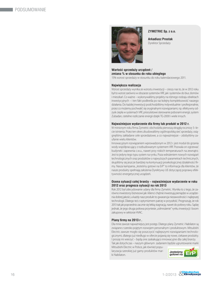 podsumowanie ZYMETRIC Sp. z o.o. Arkadiusz Prostak Dyrektor Sprzedaży Wartość sprzedaży urządzeń / zmiana % w stosunku do roku ubiegłego 15% wzrost sprzedaży w stosunku do roku kalendarzowego 2011. Największa realizacja Wzrost sprzedaży wynika ze wzrostu inwestycji – cieszy nas to, że w 2012 roku był to wzrost zarówno w obszarze systemów VRF, jak i systemów do biur, domów i mieszkań. Co ważne – wykonywaliśmy projekty na różnego rodzaju obiektach inwestycyjnych – i ten fakt podkreśla po raz kolejny kompleksowość naszego działania. Do każdej inwestycji podchodziliśmy indywidualnie i profesjonalnie, przez co możemy pochwalić się oryginalnymi rozwiązaniami, np. efektywny odzysk ciepła w systemach VRF, priorytetowe sterowanie poborami energii, system Zubadan, rzetelne rozliczanie energii dzięki TG-2000 i wiele innych. Najważniejsze wydarzenie dla firmy lub produkt w 2012 r. W minionym roku firma Zymetric obchodziła pierwszą okrągłą rocznicę: 5–lecie istnienia. Przez ten okres zbudowaliśmy ogólnopolską sieć sprzedaży, osiągnęliśmy zakładane cele sprzedażowe, a co najważniejsze – zdobyliśmy zaufanie wielu klientów. Innowacyjnym rozwiązaniem wprowadzonym w 2012 r. jest moduł do grzania wody współpracujący z rozbudowanym systemem VRF. Pozwala on ogrzewać budynek i zapewnia c.w.u., nawet przy niskich temperaturach na zewnątrz. Jest to jedyny tego typu system na rynku. Poza wdrożeniem nowych rozwiązań technologicznych oraz produktów o najwyższych parametrach technicznych, skupiliśmy się jeszcze bardziej na kontynuacji proekologicznej działalności firmy. Nasza kampania „Jesteśmy gotowi na ErP” to informacja dla klientów, że nasze produkty spełniają założenia Dyrektywy UE dotyczącej poprawy efektywności energetycznej urządzeń. Ocena sytuacji całej branży – najważniejsze wydarzenie w roku 2012 oraz prognoza sytuacji na rok 2013 Rok 2012 był zdecydowanie udany dla firmy Zymetric. Wynika to z tego, że zarówno inwestorzy biznesowi jak i klienci chętnie inwestują pieniądze w urządzenia dobrej jakości, a każdy nasz produkt to gwarancja niezawodności i najlepszej technologii. Dlatego też z optymizmem patrzę w przyszłość. Prognozuję, że rok 2013 tak jak poprzednio zacznie się lekką stagnacją, nawet do połowy roku. Sądzę jednak, że jego druga połowa przyniesie „odmrożenie” rynku inwestycji i boom zakupowy w sektorze HVAC. Plany firmy na 2013 r . Dla mnie zawsze najważniejszy jest postęp. Dlatego plany Zymetric i Nabilaton są związane z szeroko pojętym rozwojem personalnym i produktowym. Mitsubishi Electric zawsze mogło się poszczycić najlepszymi rozwiązaniami technologicznymi, dlatego już niedługo w ofercie pojawią się nowe, ciekawe produkty. I proszę mi wierzyć – będą one zaskakująco innowacyjne dla całej branży. Tak jak dotychczas – naszym głównym zadaniem będzie ugruntowanie marki Mitsubishi Electric w Polsce, jak również popularyzacja szerokiej już gamy produktów marki Nabilaton. 16 1-2/2013