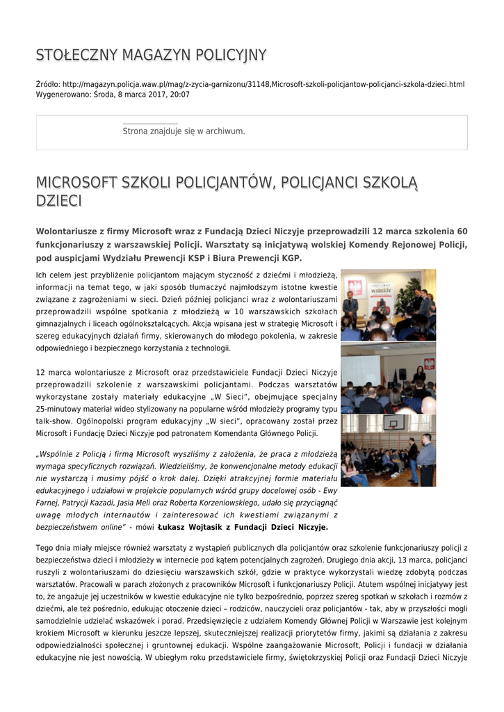 STOŁECZNY MAGAZYN POLICYJNY Źródło: http://magazyn.policja.waw.pl/mag/z-zycia-garnizonu/31148,Microsoft-szkoli-policjantow-policjanci-szkola-dzieci.html Wygenerowano: Środa, 8 marca 2017, 20:07 Strona znajduje się w archiwum. MICROSOFT SZKOLI POLICJANTÓW, POLICJANCI SZKOLĄ DZIECI Wolontariusze z firmy Microsoft wraz z Fundacją Dzieci Niczyje przeprowadzili 12 marca szkolenia 60 funkcjonariuszy z warszawskiej Policji. Warsztaty są inicjatywą wolskiej Komendy Rejonowej Policji, pod auspicjami Wydziału Prewencji KSP i Biura Prewencji KGP. Ich celem jest przybliżenie policjantom mającym styczność z dziećmi i młodzieżą, informacji na temat tego, w jaki sposób tłumaczyć najmłodszym istotne kwestie związane z zagrożeniami w sieci. Dzień później policjanci wraz z wolontariuszami przeprowadzili wspólne spotkania z młodzieżą w 10 warszawskich szkołach gimnazjalnych i liceach ogólnokształcących. Akcja wpisana jest w strategię Microsoft i szereg edukacyjnych działań firmy, skierowanych do młodego pokolenia, w zakresie odpowiedniego i bezpiecznego korzystania z technologii. 12 marca wolontariusze z Microsoft oraz przedstawiciele Fundacji Dzieci Niczyje przeprowadzili szkolenie z warszawskimi policjantami. Podczas warsztatów wykorzystane zostały materiały edukacyjne „W Sieci”, obejmujące specjalny 25-minutowy materiał wideo stylizowany na popularne wśród młodzieży programy typu talk-show. Ogólnopolski program edukacyjny „W sieci”, opracowany został przez Microsoft i Fundację Dzieci Niczyje pod patronatem Komendanta Głównego Policji. „Wspólnie z Policją i firmą Microsoft wyszliśmy z założenia, że praca z młodzieżą wymaga specyficznych rozwiązań. Wiedzieliśmy, że konwencjonalne metody edukacji nie wystarczą i musimy pójść o krok dalej. Dzięki atrakcyjnej formie materiału edukacyjnego i udziałowi w projekcie popularnych wśród grupy docelowej osób - Ewy Farnej, Patrycji Kazadi, Jasia Meli oraz Roberta Korzeniowskiego, udało się przyciągnąć uwagę młodych internautów i zainteresować ich kwestiami związanymi z bezpieczeństwem online” - mówi Łukasz Wojtasik z Fundacji Dzieci Niczyje. Tego dnia miały miejsce również warsztaty z wystąpień publicznych dla policjantów oraz szkolenie funkcjonariuszy policji z bezpieczeństwa dzieci i młodzieży w internecie pod kątem potencjalnych zagrożeń. Drugiego dnia akcji, 13 marca, policjanci ruszyli z wolontariuszami do dziesięciu warszawskich szkół, gdzie w praktyce wykorzystali wiedzę zdobytą podczas warsztatów. Pracowali w parach złożonych z pracowników Microsoft i funkcjonariuszy Policji. Atutem wspólnej inicjatywy jest to, że angażuje jej uczestników w kwestie edukacyjne nie tylko bezpośrednio, poprzez szereg spotkań w szkołach i rozmów z dziećmi, ale też pośrednio, edukując otoczenie dzieci – rodziców, nauczycieli oraz policjantów - tak, aby w przyszłości mogli samodzielnie udzielać wskazówek i porad. Przedsięwzięcie z udziałem Komendy Głównej Policji w Warszawie jest kolejnym krokiem Microsoft w kierunku jeszcze lepszej, skuteczniejszej realizacji priorytetów firmy, jakimi są działania z zakresu odpowiedzialności społecznej i gruntownej edukacji. Wspólne zaangażowanie Microsoft, Policji i fundacji w działania edukacyjne nie jest nowością. W ubiegłym roku przedstawiciele firmy, świętokrzyskiej Policji oraz Fundacji Dzieci Niczyje przeszkolili w ramach podobnego programu edukacyjnego przeszło 1500 uczniów kilku kieleckich placówek oświatowych, a patronat nad akcją objął Marszałek Województwa Świętokrzyskiego oraz Wojewoda Świętokrzyski. Zachęcamy do pobrania materiałów edukacyjnych ze strony www.wsieci.tv oraz portalu Dziecko w Sieci. wyk. mat. KGP ZAŁĄCZNIKI DO STRONY Stołeczny Magazyn Policyjny - nr 03/2012 1.88 MB Ocena: 0/5 (0) Tweetnij