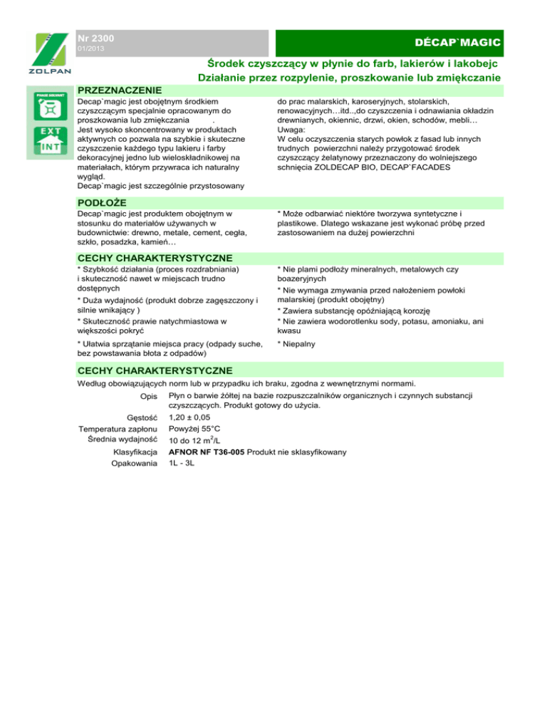Nr 2300 DÉCAP`MAGIC 01/2013 Środek czyszczący w płynie do farb, lakierów i lakobejc Działanie przez rozpylenie, proszkowanie lub zmiękczanie PRZEZNACZENIE Decap`magic jest obojętnym środkiem czyszczącym specjalnie opracowanym do proszkowania lub zmiękczania . Jest wysoko skoncentrowany w produktach aktywnych co pozwala na szybkie i skuteczne czyszczenie każdego typu lakieru i farby dekoracyjnej jedno lub wieloskładnikowej na materiałach, którym przywraca ich naturalny wygląd. Decap`magic jest szczególnie przystosowany do prac malarskich, karoseryjnych, stolarskich, renowacyjnych…itd..,do czyszczenia i odnawiania okładzin drewnianych, okiennic, drzwi, okien, schodów, mebli… Uwaga: W celu oczyszczenia starych powłok z fasad lub innych trudnych powierzchni należy przygotować środek czyszczący żelatynowy przeznaczony do wolniejszego schnięcia ZOLDECAP BIO, DECAP`FACADES PODŁOŻE Decap`magic jest produktem obojętnym w stosunku do materiałów używanych w budownictwie: drewno, metale, cement, cegła, szkło, posadzka, kamień… * Może odbarwiać niektóre tworzywa syntetyczne i plastikowe. Dlatego wskazane jest wykonać próbę przed zastosowaniem na dużej powierzchni CECHY CHARAKTERYSTYCZNE * Szybkość działania (proces rozdrabniania) i skuteczność nawet w miejscach trudno dostępnych * Duża wydajność (produkt dobrze zagęszczony i silnie wnikający ) * Skuteczność prawie natychmiastowa w większości pokryć * Ułatwia sprzątanie miejsca pracy (odpady suche, bez powstawania błota z odpadów) * Nie plami podłoży mineralnych, metalowych czy boazeryjnych * Nie wymaga zmywania przed nałożeniem powłoki malarskiej (produkt obojętny) * Zawiera substancję opóźniającą korozję * Nie zawiera wodorotlenku sody, potasu, amoniaku, ani kwasu * Niepalny CECHY CHARAKTERYSTYCZNE Według obowiązujących norm lub w przypadku ich braku, zgodna z wewnętrznymi normami. Opis Gęstość Temperatura zapłonu Średnia wydajność Klasyfikacja Opakowania Płyn o barwie żółtej na bazie rozpuszczalników organicznych i czynnych substancji czyszczących. Produkt gotowy do użycia. 1,20 ± 0,05 Powyżej 55°C 10 do 12 m2/L AFNOR NF T36-005 Produkt nie sklasyfikowany 1L - 3L Nr 2300 DÉCAP`MAGIC 01/2013 ZASTOSOWANIE Podkłady, przygotowanie i warunki stosowania powinny być zgodne z obowiązującymi normami / DTU Przygotowanie powierzchni Zabezpieczyć powierzchnie, które mogą ulegać odbarwieniu oraz produkty plastikowe, PCV, kauczuk, pilistyren, pleksiglas… Sposób postępowania Nakładać Decap`magic przy pomocy rozpylacza (część przednia i uszczelniająca z teflonu) lub pędzla ze szczeciny. Pozostawić aż do podniesienia się powłoki i powstania pęcherzy powietrznych pokrycia (na kilka sekund lub minut w zależności od rodzaju i grubości błony) UWAGA Likwidowanie wosku z mebli lub graffiti przy pomocy ścierki nasączonej produktem bezpośrednio na zabrudzonym miejscu. Oczyszczanie z powłok malarskich i innych może być wykonane po wyschnięciu produktu. W tym wypadku wystarczy oczyścić zniszczoną powłokę i odkurzyć przed malowaniem. Mycie narzędzi Wodą lub White Spirit, bezpośrednio po użyciu Zlikwidować zniszczone pokrycie przy pomocy szpachelki, noża, cienkiej metalowej szczotki, metalowej siatki. Ponowić czynność jeśli istnieje taka konieczność: upał, wiatr, bardzo gruba warstwa powłoki. Usunąć, zmyć lub odkurzyć wszelkie suche odpady powstałe w wyniku czyszczenia. Nie trzeba zmywać produktu. Podłoże musi być suche i pozbawione odpadów z czyszczenia przed nakładaniem farby. Warunki nakładania * Przy temperaturze otoczenia i powierzchni powyżej 5°C (z zachowaniem środków ostrożności powyżej temperatury 35°C) PRZECHOWYWANIE BEZPIECZEŃSTWO I HIGIENA PRACY * 24 miesiące w oryginalnym zamkniętym opakowaniu Zapoznać się z : * Etykietą informacyjną zasad bezpieczeństwa na opakowaniu * Przechowywać w pomieszczeniu chłodnym i przewiewnym * Przy pogodzie suchej, chroniąc od silnego wiatru i bezpośredniego promieniowania słonecznego * Może zniszczyć niektóre materiały sztuczne i produkty plastikowe * kartą produktu niebezpiecznego zamieszczoną na stronie: www.zolpan.fr UWAGA: Zawarte informacje mają tylko charakter orientacyjny i nie mogą zastąpić instrukcji postępowania dostosowanego do natury oraz stanu konkretnego podłoża. Przedstawiciel ZOLPAN S.A. NIP PL872210886 REGON 691564444 33-100Tarnów, ul.Tuchowska 25 tel. (014) 626 80 20, tel/fax. (014) 626 80 21 www.zolpan-tokato.home.pl, e-mail: [email protected] Sąd Rejonowy dla Krakowa Śródmieścia w Krakowie XII Wydział Gospodarczy KRS Firma wpisana do rejestru KRS pod nr 0000046471, Kapitał zakładowy 165 000