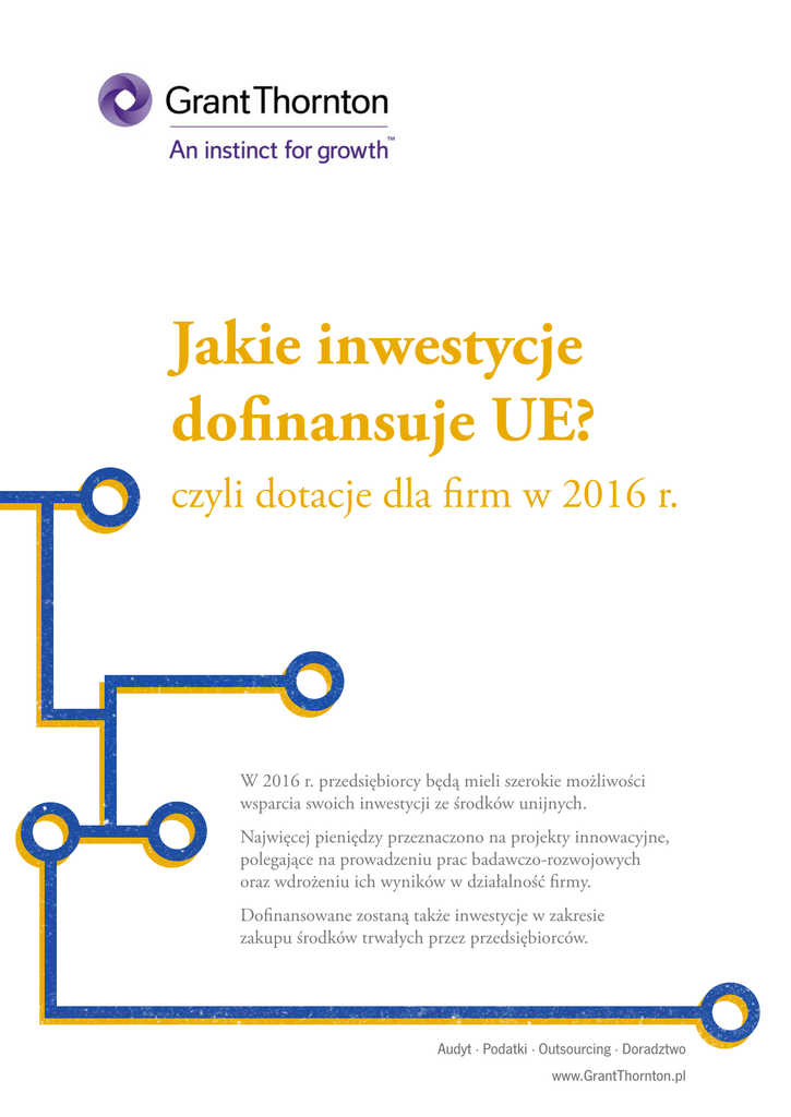 Jakie inwestycje dofinansuje UE? czyli dotacje dla firm w 2016 r. W 2016 r. przedsiębiorcy będą mieli szerokie możliwości wsparcia swoich inwestycji ze środków unijnych. Najwięcej pieniędzy przeznaczono na projekty innowacyjne, polegające na prowadzeniu prac badawczo-rozwojowych oraz wdrożeniu ich wyników w działalność firmy. Dofinansowane zostaną także inwestycje w zakresie zakupu środków trwałych przez przedsiębiorców. Audyt ∙ Podatki ∙ Outsourcing ∙ Doradztwo www.GrantThornton.pl Innowacyjność priorytetem dla UE W perspektywie finansowej 2014-2020 priorytetem dla Unii Europejskiej będzie dofinansowanie projektów innowacyjnych, mających na celu prowadzenie przez przedsiębiorstwa, zarówno te z sektora MŚP jak i duże, prac B+R i wdrażanie ich wyników w działalność firmy. Na początku 2016 r. w ramach Programu Operacyjnego Inteligentny Rozwój zostanie ponownie uruchomiony – znany już firmom – konkurs Szybka ścieżka, poddziałanie 1.1.1 Badania przemysłowe i prace rozwojowe realizowane przez przedsiębiorstwa. Na dofinansowanie projektów realizowanych w tym obszarze tematycznym, Narodowe Centrum Badań i Rozwoju przeznaczyło 2,1 mln zł. Wsparcie otrzymają także firmy planujące utworzyć w swoich strukturach dział badawczo-rozwojowy. W ramach poddziałania 2.1 Wsparcie inwestycji w infrastrukturę B+R przedsiębiorstw, będzie można częściowo sfinansować zakup aparatury badawczo-naukowej, która posłuży tworzeniu innowacyjnych produktów i usług. NCBiR planuje także ponownie uruchomić nabór wniosków w ramach poddziałania 3.2.1 Badania na rynek, dzięki któremu możliwe będzie dofinansowanie wdrożenia wyników prac B+R w działalność przedsiębiorstwa. Dotacje na zakup środków trwałych także możliwe Poza środkami krajowymi dostępnymi za pośrednictwem PO IR, przedsiębiorcy będą mogli otrzymać dotacje z regionalnych programów poszczególnych województw. W ramach konkursów ogłaszanych przez samorządy województw, firmy będą mogły nie tylko uzyskać środki na realizację prac badawczo-rozwojowych (takie konkursy pojawią się na początku 2016 r. w województwie: lubelskim, lubuskim, łódzkim, mazowieckim, podkarpackim, pomorskim i zachodniopomorskim), ale co ważne, otrzymać także dotacje na zakup środków trwałych. Mikro, mali i średni przedsiębiorcy, prowadzący działalność gospodarczą na obszarze województw: lubuskiego, łódzkiego, podkarpackiego, pomorskiego i zachodniopomorskiego, będą mogli ubiegać się już na początku roku o środki na zakup maszyn, urządzeń czy linii produkcyjnych. Poziom dofinansowania inwestycji wynosił będzie od 45% do 70% wartości projektu, w zależności od lokalizacji przedsięwzięcia oraz wielkości przedsiębiorstwa. W pozostałych województwach również planuje się organizację konkursów o podobnej tematyce. Pojawią się one prawdopodobnie w drugiej połowie 2016 r. Środki unijne pomogą zadebiutować MŚP na giełdzie Unia Europejska, podobnie jak w poprzedniej perspektywie finansowej, postanowiła pomóc także i tym razem małym i średnim przedsiębiorcom, finansując część kosztów związanych z wejściem spółki na giełdę. W ramach PO IR, Poddziałanie 3.1.5 Wsparcie MŚP w dostępie do rynku kapitałowego - 4 Stock, firmy będą mogły otrzymać dotacje na przygotowanie niezbędnej dokumentacji do pozyskania zewnętrznych źródeł finansowania o charakterze udziałowym lub dłużnym z rynku GPW, New Connect, zagranicznych rynków regulowanych, rynku obligacji Catalyst. Nabór wniosków przewidziano do końca I kw. 2016 r. 4 10 najciekawszych dotacji według Grant Thornton subiektywny ranking PO IR, Szybka ścieżka Dotacje na zakup środków trwałych Jak sama nazwa wskazuje, zaletą konkursu jest szybki, a zarazem czytelny i przejrzysty schemat ubiegania się o dotacje na prace badawczo-rozwojowe. Ocena wniosku i wydanie decyzji o pozytywnym lub negatywnym jego rozpatrzeniu jest stosunkowo krótka i trwa ok. 60 dni. Umożliwiają przedsiębiorcom realizację prostych projektów inwestycyjnych, polegających na zakupie oraz montażu maszyn i urządzeń. PO IR, 2.1 Wsparcie inwestycji w infrastrukturę B+R przedsiębiorstw W ramach konkursu przewiduje się dotacje na aparaturę, sprzęt, technologie i inną niezbędną infrastrukturę, dzięki której firmy będą mogły tworzyć innowacyjne produkty i usługi. PO IR, 3.2.1 Badania na rynek Wsparciem, w ramach działania, zostaną objęte projekty, w których przewiduje się wdrożenie wyników prac badawczo-rozwojowych przeprowadzonych przez przedsiębiorcę lub nabytych, prowadzących do uruchomienia produkcji nowych wyrobów. PO IR, 2.3.2 Bony na innowacje dla MŚP Celem działania jest wsparcie współpracy sektora nauki z przedsiębiorcami poprzez finansowanie usług świadczonych przez jednostki naukowe na rzecz firm. Poziom dofinansowania projektów jest wysoki i wynosi: do 70% dla średnich przedsiębiorców oraz do 80% dla mikro i małych przedsiębiorców. Dofinansowanie technologii informacyjno-komunikacyjnych Środki unijne pomogą wdrożyć nowoczesne rozwiązania informacyjno-komunikacyjne w procesy biznesowe przedsiębiorstw. Inwestycję w aparaturę B+R Dotacje umożliwią stworzenie działów badawczo-rozwojowych w strukturach przedsiębiorstw, a co za tym idzie pozwolą na rozpoczęcie prac B+R. Dofinansowanie prac B+R oraz wdrożenia ich wyników Umożliwi wprowadzenie innowacji, zarówno produktowej jak i procesowej do działalności przedsiębiorstwa. Dotacje na poprawę efektywności energetycznej w przedsiębiorstwach Środki zostaną przeznaczone na ograniczenie zużycia energii w przedsiębiorstwach, a także na zastosowanie odnawialnych źródeł energii w działalności firmy. PO IR, 3.1.5 Wsparcie MŚP w dostępie do rynku kapitałowego - 4 Stock UE postanowiła pomóc małym i średnim przedsiębiorcom, finansując część kosztów związanych z