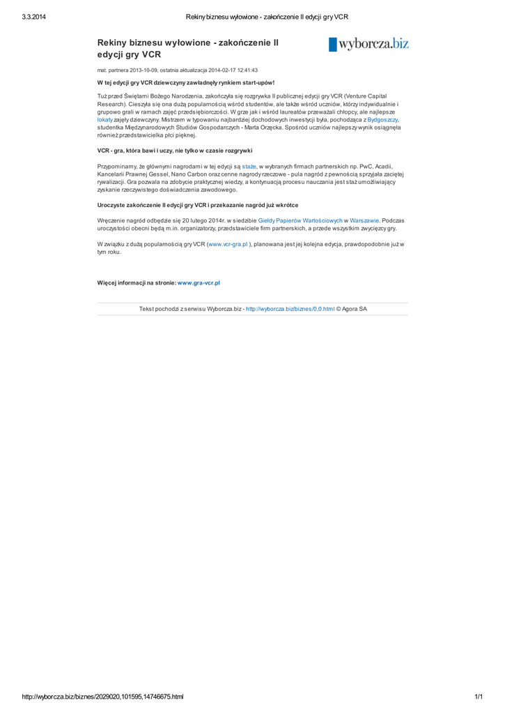 3.3.2014 Rekiny biznesu wyłowione - zakończenie II edycji gry VCR Rekiny biznesu wyłowione - zakończenie II edycji gry VCR mat. partnera 2013-10-09, ostatnia aktualizacja 2014-02-17 12:41:43 W tej edycji gry VCR dziewczyny zawładnęły rynkiem start-upów! Tuż przed Świętami Bożego Narodzenia, zakończyła się rozgrywka II publicznej edycji gry VCR (Venture Capital Research). Cieszyła się ona dużą popularnością wśród studentów, ale także wśród uczniów, którzy indywidualnie i grupowo grali w ramach zajęć przedsiębiorczości. W grze jak i wśród laureatów przeważali chłopcy, ale najlepsze lokaty zajęły dziewczyny. Mistrzem w typowaniu najbardziej dochodowych inwestycji była, pochodząca z Bydgoszczy, studentka Międzynarodowych Studiów Gospodarczych - Marta Orzęcka. Spośród uczniów najlepszy wynik osiągnęła również przedstawicielka płci pięknej. VCR - gra, która bawi i uczy, nie tylko w czasie rozgrywki Przypominamy, że głównymi nagrodami w tej edycji są staże, w wybranych firmach partnerskich np. PwC, Acadii, Kancelarii Prawnej Gessel, Nano Carbon oraz cenne nagrody rzeczowe - pula nagród z pewnością sprzyjała zaciętej rywalizacji. Gra pozwala na zdobycie praktycznej wiedzy, a kontynuacją procesu nauczania jest staż umożliwiający zyskanie rzeczywistego doświadczenia zawodowego. Uroczyste zakończenie II edycji gry VCR i przekazanie nagród już wkrótce Wręczenie nagród odbędzie się 20 lutego 2014r. w siedzibie Giełdy Papierów Wartościowych w Warszawie. Podczas uroczystości obecni będą m.in. organizatorzy, przedstawiciele firm partnerskich, a przede wszystkim zwycięzcy gry. W związku z dużą popularnością gry VCR (www.vcr-gra.pl ), planowana jest jej kolejna edycja, prawdopodobnie już w tym roku. Więcej informacji na stronie: www.gra-vcr.pl Tekst pochodzi z serwisu Wyborcza.biz - http://wyborcza.biz/biznes/0,0.html © Agora SA http://wyborcza.biz/biznes/2029020,101595,14746675.html 1/1