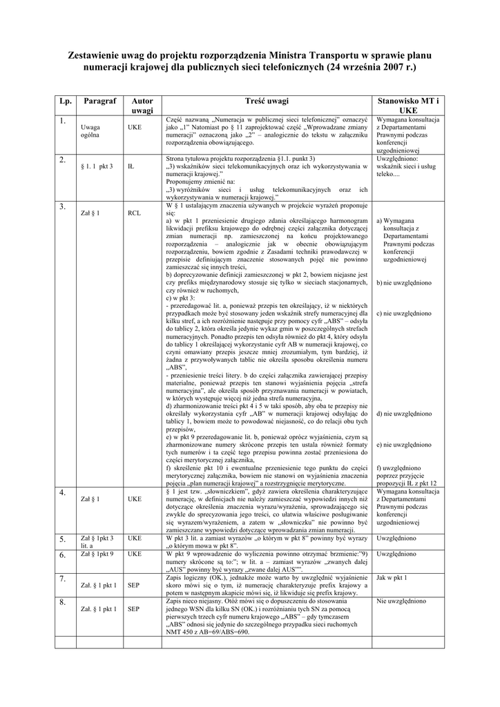 Zestawienie uwag do projektu rozporządzenia Ministra Transportu w sprawie planu numeracji krajowej dla publicznych sieci telefonicznych (24 września 2007 r.) Lp. 1. 2. 3. 4. 5. 6. 7. 8. Paragraf Autor uwagi Uwaga ogólna UKE § 1. 1 pkt 3 IŁ Zał § 1 RCL Zał § 1 UKE Zał § 1pkt 3 lit. a Zał § 1pkt 9 UKE UKE Zał. § 1 pkt 1 SEP Zał. § 1 pkt 1 SEP Treść uwagi Stanowisko MT i UKE Część nazwaną „Numeracja w publicznej sieci telefonicznej” oznaczyć jako „1” Natomiast po § 11 zaprojektować część „Wprowadzane zmiany numeracji” oznaczoną jako „2” – analogicznie do tekstu w załączniku rozporządzenia obowiązującego. Wymagana konsultacja z Departamentami Prawnymi podczas konferencji uzgodnieniowej Uwzględniono: wskaźnik sieci i usług teleko.... Strona tytułowa projektu rozporządzenia §1.1. punkt 3) „3) wskaźników sieci telekomunikacyjnych oraz ich wykorzystywania w numeracji krajowej.” Proponujemy zmienić na: „3) wyróżników sieci i usług telekomunikacyjnych oraz ich wykorzystywania w numeracji krajowej.” W § 1 ustalającym znaczenia używanych w projekcie wyrażeń proponuje się: a) w pkt 1 przeniesienie drugiego zdania określającego harmonogram likwidacji prefiksu krajowego do odrębnej części załącznika dotyczącej zmian numeracji np. zamieszczonej na końcu projektowanego rozporządzenia – analogicznie jak w obecnie obowiązującym rozporządzeniu, bowiem zgodnie z Zasadami techniki prawodawczej w przepisie definiującym znaczenie stosowanych pojęć nie powinno zamieszczać się innych treści, b) doprecyzowanie definicji zamieszczonej w pkt 2, bowiem niejasne jest czy prefiks międzynarodowy stosuje się tylko w sieciach stacjonarnych, czy również w ruchomych, c) w pkt 3: - przeredagować lit. a, ponieważ przepis ten określający, iż w niektórych przypadkach może być stosowany jeden wskaźnik strefy numeracyjnej dla kilku stref, a ich rozróżnienie następuje przy pomocy cyfr „ABS” – odsyła do tablicy 2, która określa jedynie wykaz gmin w poszczególnych strefach numeracyjnych. Ponadto przepis ten odsyła również do pkt 4, który odsyła do tablicy 1 określającej wykorzystanie cyfr AB w numeracji krajowej, co czyni omawiany przepis jeszcze mniej zrozumiałym, tym bardziej, iż żadna z przywoływanych tablic nie określa sposobu określenia numeru „ABS”, - przeniesienie treści litery. b do części załącznika zawierającej przepisy materialne, ponieważ przepis ten stanowi wyjaśnienia pojęcia „strefa numeracyjna”, ale określa sposób przyznawania numeracji w powiatach, w których występuje więcej niż jedna strefa numeracyjna, d) zharmonizowanie treści pkt 4 i 5 w taki sposób, aby oba te przepisy nie określały wykorzystania cyfr „AB” w numeracji krajowej odsyłając do tablicy 1, bowiem może to powodować niejasność, co do relacji obu tych przepisów, e) w pkt 9 przeredagowanie lit. b, ponieważ oprócz wyjaśnienia, czym są zharmonizowane numery skrócone przepis ten ustala również formaty tych numerów i ta część tego przepisu powinna zostać przeniesiona do części merytorycznej załącznika, f) skreślenie pkt 10 i ewentualne przeniesienie tego punktu do części merytorycznej załącznika, bowiem nie stanowi on wyjaśnienia znaczenia pojęcia „plan numeracji krajowej” a rozstrzygnięcie merytoryczne. § 1 jest tzw. „słowniczkiem”, gdyż zawiera określenia charakteryzujące numerację, w definicjach nie należy zamieszczać wypowiedzi innych niż dotyczące określenia znaczenia wyrazu/wyrażenia, sprowadzającego się zwykle do sprecyzowania jego treści, co ułatwia właściwe posługiwanie się wyrazem/wyrażeniem, a zatem w „słowniczku” nie powinno być zamieszczane wypowiedzi dotyczące wprowadzania zmian numeracji. W pkt 3 lit. a zamiast wyrazów „o którym w pkt 8” powinny być wyrazy „o którym mowa w pkt 8”. W pkt 9 wprowadzenie do wyliczenia powinno otrzymać brzmienie:”9) numery skrócone są to:”; w lit. a – zamiast wyrazów „zwanych dalej „AUS” powinny być wyrazy „zwane dalej AUS””. Zapis logiczny (OK.), jednakże może warto by uwzględnić wyjaśnienie skoro mówi się o tym, iż numerację charakteryzuje prefix krajowy a potem w następnym akapicie mówi się, iż likwiduje się prefix krajowy. Zapis nieco niejasny. Otóż mówi się o dopuszczeniu do stosowania jednego WSN dla kilku SN (OK.) i rozróżnianiu tych SN za pomocą pierwszych trzech cyfr numeru krajowego „ABS” – gdy tymczasem „ABS” odnosi się jedynie do szczególnego przypadku sieci ruchomych NMT 450 z AB=69/ABS=690. a) Wymagana konsultacja z Departamentami Prawnymi podczas konferencji uzgodnieniowej b) nie uwzględniono c) nie uwzględniono d) nie uwzględniono e) nie uwzględniono f) uwzględniono poprzez przyjęcie propozycji IŁ z pkt 12 Wymagana konsultacja z Departamentami Prawnymi podczas konferencji uzgodnieniowej Uwzględniono Uwzględniono Jak w pkt 1 Nie uwzględniono 9. 10. Zał.§ 1 pkt 3 IŁ Zał.§ 1 pkt 4 IŁ PIIT -PTC 11. Zał. § 1 pkt 9 ppkt a IŁ 12. Zał. § 1 pkt 9 ppkt a 13. Zał.§ 1 pkt 10 IŁ 14. Zał.§ 2 RCL Zał. § 2 UKE 15. § 1 pkt 3 proponujemy zamienić na następujący tekst: „3) Numeracyjny obszar geograficzny, zwany dalej „NOG”, jest to część obszaru kraju obejmująca publiczną sieć telefoniczną stosującą numerację geograficzną, charakteryzującą się tym, że: a) każdemu obszarowi NOG przyporządkowany jest jeden wskaźnik obszaru geograficznego (WOG), o którym mowa w pkt 4., identyfikujący dany NOG w przypadkach uzasadnionych potrzebami wynikającymi z wprowadzenia wybierania numeru krajowego (KNA), o którym w pkt 8, dopuszcza się stosowanie jednego WOG dla kilku NOG i rozróżnianie tych NOG za pomoc pierwszych trzech cyfr numeru krajowego oznaczonych symbolicznie „ABS” przyporządkowanie określa Tablica 2. b) na obszarach powiatów podzielonych granicami numer