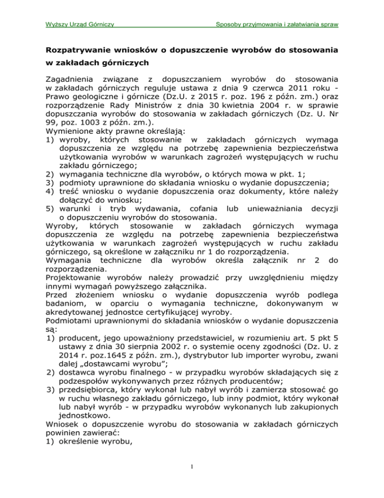 Wyższy Urząd Górniczy Sposoby przyjmowania i załatwiania spraw Rozpatrywanie wniosków o dopuszczenie wyrobów do stosowania w zakładach górniczych Zagadnienia związane z dopuszczaniem wyrobów do stosowania w zakładach górniczych reguluje ustawa z dnia 9 czerwca 2011 roku Prawo geologiczne i górnicze (Dz.U. z 2015 r. poz. 196 z późn. zm.) oraz rozporządzenie Rady Ministrów z dnia 30 kwietnia 2004 r. w sprawie dopuszczania wyrobów do stosowania w zakładach górniczych (Dz. U. Nr 99, poz. 1003 z późn. zm.). Wymienione akty prawne określają: 1) wyroby, których stosowanie w zakładach górniczych wymaga dopuszczenia ze względu na potrzebę zapewnienia bezpieczeństwa użytkowania wyrobów w warunkach zagrożeń występujących w ruchu zakładu górniczego; 2) wymagania techniczne dla wyrobów, o których mowa w pkt. 1; 3) podmioty uprawnione do składania wniosku o wydanie dopuszczenia; 4) treść wniosku o wydanie dopuszczenia oraz dokumenty, które należy dołączyć do wniosku; 5) warunki i tryb wydawania, cofania lub unieważniania decyzji o dopuszczeniu wyrobów do stosowania. Wyroby, których stosowanie w zakładach górniczych wymaga dopuszczenia ze względu na potrzebę zapewnienia bezpieczeństwa użytkowania w warunkach zagrożeń występujących w ruchu zakładu górniczego, są określone w załączniku nr 1 do rozporządzenia. Wymagania techniczne dla wyrobów określa załącznik nr 2 do rozporządzenia. Projektowanie wyrobów należy prowadzić przy uwzględnieniu między innymi wymagań powyższego załącznika. Przed złożeniem wniosku o wydanie dopuszczenia wyrób podlega badaniom, w oparciu o wymagania techniczne, dokonywanym w akredytowanej jednostce certyfikującej wyroby. Podmiotami uprawnionymi do składania wniosków o wydanie dopuszczenia są: 1) producent, jego upoważniony przedstawiciel, w rozumieniu art. 5 pkt 5 ustawy z dnia 30 sierpnia 2002 r. o systemie oceny zgodności (Dz. U. z 2014 r. poz.1645 z późn. zm.), dystrybutor lub importer wyrobu, zwani dalej „dostawcami wyrobu”; 2) dostawca wyrobu finalnego - w przypadku wyrobów składających się z podzespołów wykonywanych przez różnych producentów; 3) przedsiębiorca, który wykonał lub nabył wyrób i zamierza stosować go w ruchu własnego zakładu górniczego, lub inny podmiot, który wykonał lub nabył wyrób - w przypadku wyrobów wykonanych lub zakupionych jednostkowo. Wniosek o dopuszczenie wyrobu do stosowania w zakładach górniczych powinien zawierać: 1) określenie wyrobu, 1 Wyższy Urząd Górniczy Sposoby przyjmowania i załatwiania spraw 2) oznaczenie podmiotu ubiegającego się o wydanie dopuszczenia przez wskazanie jego formy prawnej oraz dowodu jego istnienia, w szczególności wypisu ze stosownego rejestru oraz jego siedziby, a także osób upoważnionych do działania w jego imieniu, przez podanie ich imienia i nazwiska oraz stanowiska służbowego, 3) określenie producenta wyrobu, jego siedziby i miejsca produkowania wyrobu. Do wniosku o dopuszczenie wyrobu do stosowania w zakładach górniczych należy dołączyć dokumentację sporządzoną w języku polskim, zawierającą: 1) ogólny opis wyrobu wraz ze wskazaniem proponowanego miejsca umieszczania znaku dopuszczenia; 2) niezbędne obliczenia projektowe parametrów mających wpływ na bezpieczeństwo użytkowania wyrobu w warunkach zagrożeń występujących w ruchu zakładu górniczego; 3) rysunki lub schematy dotyczące wyrobu, jego układów oraz podzespołów, od których zależy bezpieczeństwo i higiena pracy oraz bezpieczeństwo pożarowe; 4) wyniki badań wyrobu; 5) deklarację producenta albo przedsiębiorcy, który wykonał lub nabył wyrób i zamierza stosować go w ruchu własnego zakładu górniczego, lub innego podmiotu, który wykonał lub nabył wyrób w przypadku wykonania wyrobu jednostkowo, dotyczącą spełniania przez wyrób wymagań technicznych, albo deklarację dotyczącą spełniania przez wyrób wymagań bezpieczeństwa w stopniu odpowiadającym temu, jaki zapewniają wymagania techniczne - w przypadku wyrobów: a) zgodnie z prawem wyprodukowany lub dopuszczony do obrotu w innym państwie członkowskim Unii Europejskiej lub w Republice Turcji, b) zgodnie z prawem wyprodukowany w państwie członkowskim Europejskiego Porozumienia o Wolnym Handlu (EFTA) będącym stroną umowy o Europejskim Obszarze Gospodarczym; 6) dokumenty potwierdzające dokonanie oceny zgodności, jeżeli są wymagane przez odrębne przepisy, w tym wydane na podstawie ustawy z dnia 30 sierpnia 2002 r. o systemie oceny zgodności; 7) certyfikat systemu zarządzania jakością lub informację o innym sposobie udokumentowania powtarzalności cech wyrobu - w przypadku produkcji więcej niż 1 egzemplarza wyrobu; 8) dokumentację techniczno-ruchową wyrobu zawierającą następujące informacje wymagane do jego prawidłowego i bezpiecznego stosowania: a) dane techniczne, b) identyfikację zagrożeń powodowanych przez wyrób w czasie jego stosowania, c) instrukcje bezpiecznego stosowania wyrobu oraz informację o konieczności podejmowania szczególnych środków bezpieczeństwa, d) warunki stosowania wyrobu, uwzględniające sposób przeprowadzania przeglądów, konserwacji, napraw i regulacji. 2 Wyższy Urząd Górniczy Sposoby przyjmowania i załatwiania spraw Wyrób dopuszczony do stosowania w zakładach górniczych powinien być oznaczony znakiem dopuszczenia, jego numerem i rokiem wydania. Znak dopuszczenia, jego numer i rok wydania powinny być umieszczone w sposób trwały i czytelny na każdej jednostce wyrobu, z wyjątkiem wyrobów, których właściwości fizyczne nie zezwalają na takie oznaczenie – w takim przypadku znak dopuszczenia umieszcza się na opakowaniu tego wyrobu. W rozporządzeniu Rady Ministrów określono następujące oznaczenia literowe dopuszczenia: 1) GX - dla systemów budowy przeciwwybuchowej; 2) GE - dla systemów w wykonaniu normalnym oraz maszyn i urządzeń elektrycznyc