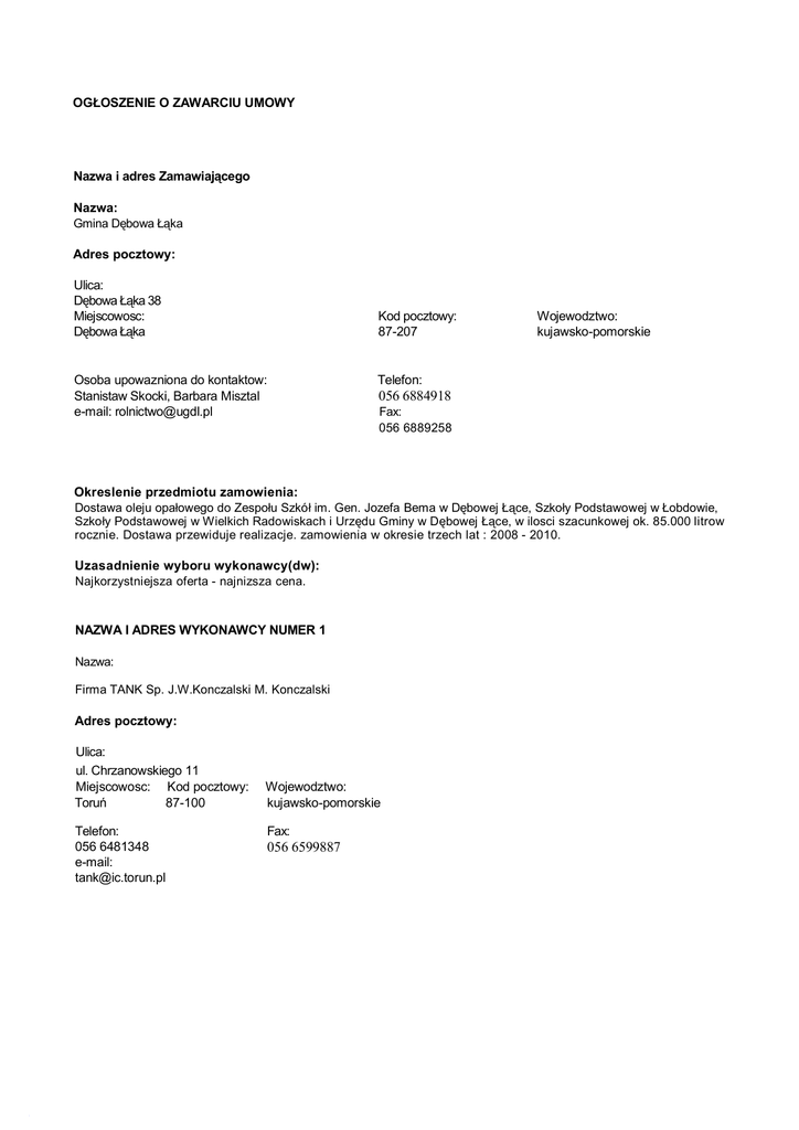 OGŁOSZENIE O ZAWARCIU UMOWY Nazwa i adres Zamawiającego Nazwa: Gmina Dębowa Łąka Adres pocztowy: Ulica: Dębowa Łąka 38 Miejscowosc: Dębowa Łąka Kod pocztowy: 87-207 Osoba upowazniona do kontaktow: Stanistaw Skocki, Barbara Misztal e-mail: [email protected] Wojewodztwo: kujawsko-pomorskie Telefon: 056 6884918 Fax: 056 6889258 Okreslenie przedmiotu zamowienia: Dostawa oleju opałowego do Zespołu Szkół im. Gen. Jozefa Bema w Dębowej Łące, Szkoły Podstawowej w Łobdowie, Szkoły Podstawowej w Wielkich Radowiskach i Urzędu Gminy w Dębowej Łące, w ilosci szacunkowej ok. 85.000 litrow rocznie. Dostawa przewiduje realizacje. zamowienia w okresie trzech lat : 2008 - 2010. Uzasadnienie wyboru wykonawcy(dw): Najkorzystniejsza oferta - najnizsza cena. NAZWA I ADRES WYKONAWCY NUMER 1 Nazwa: Firma TANK Sp. J.W.Konczalski M. Konczalski Adres pocztowy: Ulica: ul. Chrzanowskiego 11 Miejscowosc: Kod pocztowy: Toruń 87-100 Telefon: 056 6481348 e-mail: [email protected] Wojewodztwo: kujawsko-pomorskie Fax: 056 6599887