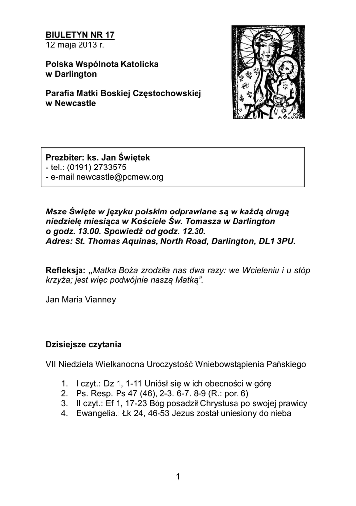 1 BIULETYN NR 17 12 maja 2013 r. Polska Wspólnota Katolicka w