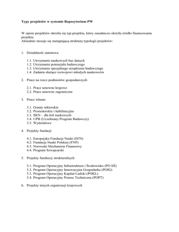 Typy projektów w systemie Repozytorium PW W opisie projektów określa się typ projektu, który zasadniczo określa źródło finansowania projektu. Aktualnie stosuje się następującą strukturę typologii projektów: 1. Działalność statutowa 1.1. Utrzymanie naukowych baz danych 1.2. Utrzymanie potencjału badawczego 1.3. Utrzymanie specjalnego urządzenia badawczego 1.4. Zadania służące rozwojowi młodych naukowców 2. Prace na rzecz podmiotów gospodarczych 2.1. Prace umowne krajowe 2.2. Prace umowne zagraniczne 3. Prace własne 3.1. Granty rektorskie 3.2. Promotorskie i habilitacyjne 3.3. SKN – dla kół naukowych 3.4. UPB (Uczelniany Program Badawczy) 3.5. Wydziałowe 4. Projekty fundacji 4.1. Europejska Fundacja Nauki (EFN) 4.2. Fundacja Nauki Polskiej (FNP) 4.3. Norweski Mechanizm Finansowy 4.4. Program Szwajcarski 5. Projekty funduszy strukturalnych 5.1. Program Operacyjny Infrastruktura i Środowisko (PO IiŚ) 5.2. Program Operacyjny Innowacyjna Gospodarka (POIG) 5.3. Program Operacyjny Kapitał Ludzki (POKL) 5.4. Program Operacyjny Pomoc Techniczna (POPT) 6. Projekty innych organizacji krajowych 7. Projekty międzynarodowe 7.1. Projekty Unii Europejskiej 7.1.1. 6 Program Ramowy (6 PR) 1.1.1.1. 1.1.1.2. 1.1.1.3. 1.1.1.4. 1.1.1.5. Projekty Craft Projekty IP Projekty NoE (Sieci Doskonałości) Projekty Sektorowe Projekty STREP (Specjale Projekty Badawczo-Rozwojowe) 7.1.2. 7 Program Ramowy (7 PR) 7.1.2.1. 7.1.2.2. 7.1.2.3. EURATOM Joint Research Centre (JCR) Ludzie Projekty Curie 7.1.2.4. Możliwości 7.1.2.5. Pomysły 7.1.2.6. Projekty CP 7.1.2.7. Projekty CSA Projekty CA Projekty SA 7.1.2.8. Współpraca Projekty NoE (Sieci Doskonałości) 7PR 7.1.3. Inne Unii Europejskiej 7.2. Projekty ONZ 7.2.1. Projekty FAO 7.2.2. Projekty UNEP 7.2.3. Projekty UNIDO 7.3. Inne międzynarodowe 7.3.1. 7.3.2. 7.3.3. 7.3.4. 7.3.5. 7.3.6. 7.3.7. Projekty COST Projekty European Defence Agency (EDA) Projekty European Research Council Projekty National Science Foundation (NSF) Projekty NATO Projekty Singapur Projekty Welcome Trust International Research Fellowship 2 8. Projekty MNiSW 8.1. badawcze rozwojowe 8.2. celowe 8.3. grant na grant 8.4. habilitacyjne 8.5. międzynarodowe niewspółfinansowane 8.6. międzynarodowe współfinansowane 8.7. Programy Plus 8.7.1. Ideas Plus 8.7.2. Index Plus 8.7.3. Iuventus Plus 8.7.4. Mobilność Plus 8.7.5. Patent PLUS 8.8. promotorskie 8.9. specjalne 8.10. własne 8.11. zamawiane 9. Projekty NCBiR 9.1. BroTech 9.2. EUREKA 9.2.1. Celtic-Plus 9.2.2. EURYPIDES 9.3. GRAPH-TECH 9.4. Inicjatywa Technologiczna I 9.5. IniTech 9.6. INNOTECH 9.7. KadTech 9.8. LIDER 9.9. Program Badań Stosowanych (PBS) 9.10. Program BRIdge 9.11. Program Kreator innowacyjności 9.12. Program PATENT PLUS 9.13. Program POLLUX 9.14. Program Strategiczny 9.15. Program Wspólny AAL 9.16. Projekty ERA-NET / Projekty ERA-NET+ 9.16.1. CHIST-ERA II 10. Projekty NCN 10.1. 10.2. 10.3. 10.4. 10.5. 10.6. HARMONIA MAESTRO OPUS PRELUDIUM SONATA SONATA BIS 3 11. Projekty NFOŚiGW 11.1. Projekty LIFE+ 4