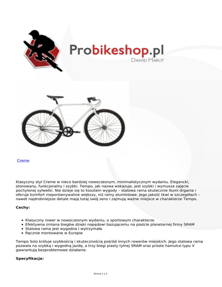 Creme Klasyczny styl Creme w nieco bardziej nowoczesnym, minimalistycznym wydaniu. Elegancki, stonowany, funkcjonalny i szybki. Tempo, jak nazwa wskazuje, jest szybki i wymusza zajęcie pochylonej sylwetki. Nie dzieje się to kosztem wygody – stalowa rama skutecznie tłumi drgania i oferuje komfort nieporównywalnie większy, niż ramy aluminiowe. Jego jakość tkwi w szczegółach – nawet najdrobniejsze detale mają tutaj swój sens i zajmują ważne miejsce w charakterze Tempo. Cechy: Klasyczny rower w nowoczesnym wydaniu, o sportowym charakterze Efektywna zmiana biegów dzięki napędowi bazującemu na piaście planetarnej firmy SRAM Stalowa rama jest wygodna i wytrzymała Ręcznie montowane w Europie Tempo Solo króluje szybkością i skutecznością pośród innych rowerów miejskich. Jego stalowa rama pozwala na szybką i wygodną jazdę, a trzy biegi piasty tylnej SRAM oraz proste hamulce typu V gwarantują bezproblemowe działanie. Specyfikacja: Strona 1 z 2 Wkład suportu: kwadrat, mufa 68 mm Hamulec przedni: V-brake Hamulec tylny: V-brake Bagażnik / Koszyk: aluminium, tylny bagażnik Łańcuch: KMC 1/2" x 1/8" Korby: aluminium odkuwany na zimno, 170 mm, zębatka z osłoną 44 z. Błotniki: SKS CAB z systemem ASR Widelec: Hi-Ten, 1,1/8" Rama: stal Hi-Ten Chwyty: Velo Kierownica: gięta, łukowata, aluminium, szerokość: 580 mm Stery: 1,1/8” Piasta przednia: Joytech Piasta tylna: SRAM I-Motion 3, 3-biegowa, zębatka 21 z. Pedały: VP-615 Obręcze: aluminium dwukomorowe 700 C Siodło: Velo Sztyca: aluminium, 26,0 mm Manetki: obrotowa, 3-biegowa Szprychy: stal nierdzewna Podpórka: aluminium Wspornik kierownicy: aluminiowy, odkuwany 3D, długość 100 mm Opony: Kenda Kwick, 32-622, 700 x 32 C Waga: 13 kg Rozmiary: S (dedykowany dla wzrostu 158 – 170 cm) Rura podsiodłowa: 495 mm Górna rura: 546 mm Dolne widełki: 430 mm Kąt główki ramy: 69,5o Kąt rury podsiodłowej: 73o M (dedykowany dla wzrostu 168 – 178 cm) Rura podsiodłowa: 550 mm Górna rura: 561 mm Dolne widełki: 430 mm Kąt główki ramy: 70o Kąt rury podsiodłowej: 73o L (dedykowany dla wzrostu 177 – 192 cm) Rura podsiodłowa: 605 mm Górna rura: 586 mm Dolne widełki: 430 mm Kąt główki ramy: 71o Kąt rury podsiodłowej: 73o Strona 2 z 2
