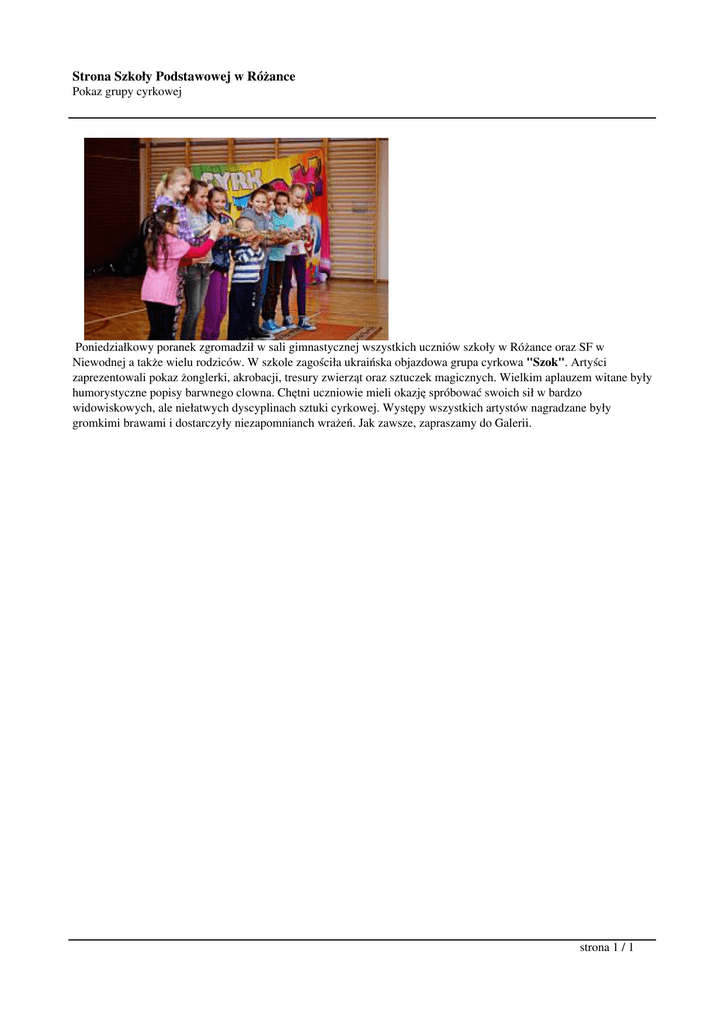 Strona Szkoły Podstawowej w Różance Pokaz grupy cyrkowej Poniedziałkowy poranek zgromadził w sali gimnastycznej wszystkich uczniów szkoły w Różance oraz SF w Niewodnej a także wielu rodziców. W szkole zagościła ukraińska objazdowa grupa cyrkowa "Szok". Artyści zaprezentowali pokaz żonglerki, akrobacji, tresury zwierząt oraz sztuczek magicznych. Wielkim aplauzem witane były humorystyczne popisy barwnego clowna. Chętni uczniowie mieli okazję spróbować swoich sił w bardzo widowiskowych, ale niełatwych dyscyplinach sztuki cyrkowej. Występy wszystkich artystów nagradzane były gromkimi brawami i dostarczyły niezapomnianch wrażeń. Jak zawsze, zapraszamy do Galerii. strona 1 / 1