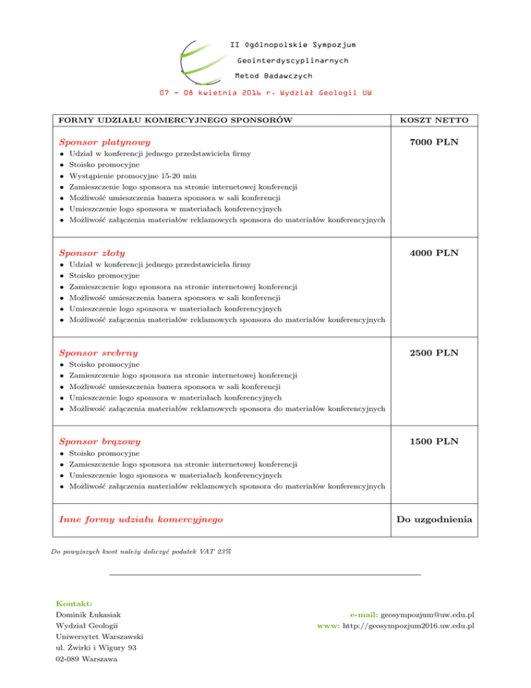 FORMY UDZIAŁU KOMERCYJNEGO SPONSORÓW KOSZT NETTO Sponsor platynowy 7000 PLN • Udział w konferencji jednego przedstawiciela firmy • Stoisko promocyjne • Wystąpienie promocyjne 15-20 min • Zamieszczenie logo sponsora na stronie internetowej konferencji • Możliwość umieszczenia banera sponsora w sali konferencji • Umieszczenie logo sponsora w materiałach konferencyjnych • Możliwość załączenia materiałów reklamowych sponsora do materiałów konferencyjnych Sponsor złoty 4000 PLN • Udział w konferencji jednego przedstawiciela firmy • Stoisko promocyjne • Zamieszczenie logo sponsora na stronie internetowej konferencji • Możliwość umieszczenia banera sponsora w sali konferencji • Umieszczenie logo sponsora w materiałach konferencyjnych • Możliwość załączenia materiałów reklamowych sponsora do materiałów konferencyjnych Sponsor srebrny 2500 PLN • Stoisko promocyjne • Zamieszczenie logo sponsora na stronie internetowej konferencji • Możliwość umieszczenia banera sponsora w sali konferencji • Umieszczenie logo sponsora w materiałach konferencyjnych • Możliwość załączenia materiałów reklamowych sponsora do materiałów konferencyjnych Sponsor brązowy 1500 PLN • Stoisko promocyjne • Zamieszczenie logo sponsora na stronie internetowej konferencji • Umieszczenie logo sponsora w materiałach konferencyjnych • Możliwość załączenia materiałów reklamowych sponsora do materiałów konferencyjnych Inne formy udziału komercyjnego Do uzgodnienia Do powyższych kwot należy doliczyć podatek VAT 23% Kontakt: Dominik Łukasiak Wydział Geologii Uniwersytet Warszawski ul. Żwirki i Wigury 93 02-089 Warszawa e-mail: [email protected] www: http://geosympozjum2016.uw.edu.pl