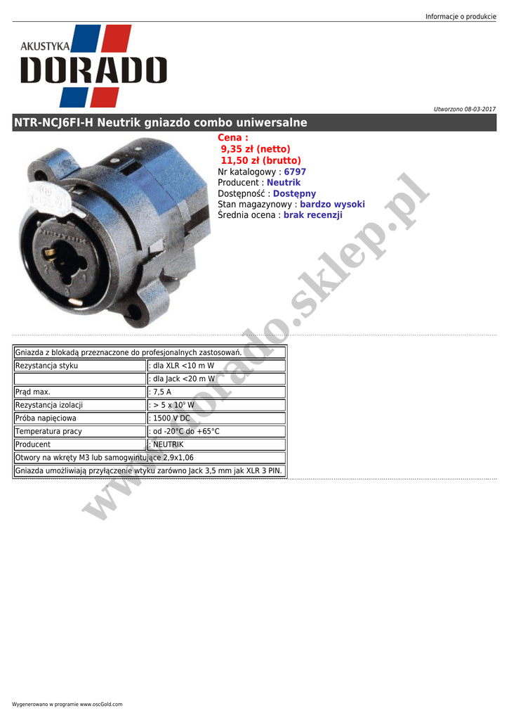 Informacje o produkcie Utworzono 08-03-2017 NTR-NCJ6FI-H Neutrik gniazdo combo uniwersalne o. sk le p. p Nr katalogowy : 6797 Producent : Neutrik Dostępność : Dostępny Stan magazynowy : bardzo wysoki Średnia ocena : brak recenzji l Cena : 9,35 zł (netto) 11,50 zł (brutto) .d or ad Gniazda z blokadą przeznaczone do profesjonalnych zastosowań. Rezystancja styku : dla XLR <10 m W : dla Jack <20 m W Prąd max. : 7,5 A Rezystancja izolacji : > 5 x 109 W Próba napięciowa : 1500 V DC Temperatura pracy : od -20°C do +65°C : NEUTRIK w Producent Otwory na wkręty M3 lub samogwintujące 2,9x1,06 w w Gniazda umożliwiają przyłączenie wtyku zarówno Jack 3,5 mm jak XLR 3 PIN. Wygenerowano w programie www.oscGold.com