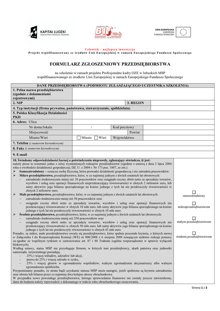 Człow iek – najlepsza inwest ycj a P r o j e kt w s p ó ł f i n a n s o w a n y z e ś r o d kó w U n i i E u r o p e j s ki e j w r a m a c h E u r o p e j s ki e g o F u n d u s z u S p o ł e c z n e g o FORMULARZ ZGŁOSZENIOWY PRZEDSIĘBIORSTWA na szkolenie w ramach projektu Profesjonalne kadry OZE w lubuskich MSP współfinansowanego ze środków Unii Europejskiej w ramach Europejskiego Funduszu Społecznego DANE PRZEDSIĘBIORSTWA (PODMIOTU ZGŁASZAJĄCEGO UCZESTNIKA SZKOLENIA) 1. Pełna nazwa przedsiębiorstwa (zgodnie z dokumentami rejestrowymi) 2. NIP 3. REGON 4. Typ instytucji (firma prywatna, państwowa, stowarzyszenie, spółdzielnia) 5. Polska Klasyfikacja Działalności PKD 6. Adres: Ulica Nr domu/lokalu / Kod pocztowy Miejscowość Powiat Miasto/Wieś Miasto Wieś Województwo 7. Telefon (z numerem kierunkowym) 8. Faks (z numerem kierunkowym) 9. E-mail 10. Świadomy odpowiedzialności karnej o poświadczeniu nieprawdy, zgłaszający oświadcza, iŜ jest: naleŜy przez to rozumieć jedno z niŜej wymienionych rodzajów przedsiębiorstw (zgodnie z ustawą z dnia 2 lipca 2004 roku o swobodzie działalności gospodarczej; DZ. U. z 2004 r. Nr 173 poz. 1807, ze zm.): Samozatrudniony – oznacza osobę fizyczną, która prowadzi działalność gospodarczą i nie zatrudnia pracowników. Mikro przedsiębiorstwo, przedsiębiorstwo, które, w co najmniej jednym z dwóch ostatnich lat obrotowych: − zatrudniało średniorocznie mniej niŜ 10 pracowników oraz osiągnęło roczny obrót netto ze sprzedaŜy towarów, wyrobów i usług oraz operacji finansowych nieprzekraczający równowartości w złotych 2 milionów euro, lub sumy aktywów jego bilansu sporządzonego na koniec jednego z tych lat nie przekroczyły równowartości w złotych 2 milionów euro. Małe przedsiębiorstwo, przedsiębiorstwo, które, w co najmniej jednym z dwóch ostatnich lat obrotowych: − zatrudniało średniorocznie mniej niŜ 50 pracowników oraz − osiągnęło roczny obrót netto ze sprzedaŜy towarów, wyrobów i usług oraz operacji finansowych nie przekraczający równowartości w złotych 10 mln euro, lub sumy aktywów jego bilansu sporządzonego na koniec jednego z tych lat nie przekroczyły równowartości w złotych 10 mln euro. Średnie przedsiębiorstwo, przedsiębiorstwo, które, w co najmniej jednym z dwóch ostatnich lat obrotowych: − zatrudniało średniorocznie mniej niŜ 250 pracowników oraz − osiągnęło roczny obrót netto ze sprzedaŜy towarów, wyrobów i usług oraz operacji finansowych nie przekraczający równowartości w złotych 50 mln euro, lub sumy aktywów jego bilansu sporządzonego na koniec jednego z tych lat nie przekroczyły równowartości w złotych 43 mln euro. Ponadto, za mikro, małe przedsiębiorstwo uwaŜa się przedsiębiorstwo, które spełnia pozostałe kryteria, o których mowa w Załączniku I do Rozporządzenia Komisji (WE) nr 800/2008 z 6 sierpnia 2008 uznającym niektóre rodzaje pomocy za zgodne ze wspólnym rynkiem w zastosowaniu art. 87 i 88 Traktatu (ogólne rozporządzenie w sprawie wyłączeń blokowych). Według ustawy, status MŚP nie przysługuje firmom, w których inni przedsiębiorcy, skarb państwa oraz jednostki samorządu terytorialnego posiadają: − 25% i więcej wkładów, udziałów lub akcji, − prawa do 25% i więcej udziału w zysku, − 25% i więcej głosów w zgromadzeniu wspólników, walnym zgromadzeniu akcjonariuszy albo walnym zgromadzeniu spółdzielni. Przypominamy ponadto, Ŝe utrata bądź uzyskanie statusu MŚP moŜe nastąpić, jeŜeli spełnione są kryteria zatrudnienia oraz obrotu lub bilansu przez co najmniej dwa kolejne okresy obrachunkowe. W przypadku nowo powstałego przedsiębiorstwa, którego sprawozdania finansowe nie zostały jeszcze zatwierdzone, dane do badania naleŜy wprowadzić z dokonanego w trakcie roku obrachunkowego oszacowania. samozatrudniony mikroprzedsiębiorstwem małym przedsiębiorstwem średnim przedsiębiorstwem Strona 1 z 3 Człow iek – najlepsza inwest ycj a P r o j e kt w s p ó ł f i n a n s o w a n y z e ś r o d kó w U n i i E u r o p e j s ki e j w r a m a c h E u r o p e j s ki e g o F u n d u s z u S p o ł e c z n e g o Ponadto oświadczam, Ŝe nie jestem w trudnej sytuacji ekonomicznej tzn.: - w przypadku spółki z ograniczoną odpowiedzialnością – jeŜeli ponad połowa jej zarejestrowanego kapitału została utracona, w tym ponad jedna czwarta w okresie poprzedzających 12 miesięcy, - w przypadku spółki, której przynajmniej niektórzy członkowie są w sposób nieograniczony odpowiedzialni za długi spółki - jeŜeli ponad połowa jej kapitału według sprawozdania finansowego została utracona, w tym ponad jedna czwarta w okresie poprzedzającym 12 miesięcy, - bez względu na rodzaj spółki, jeŜeli zgodnie z prawodawstwem krajowym podlega zbiorowemu postępowaniu w sprawie niewypłacalności, - objęty postępowaniem upadłościowym (zgodnie z ustawą z dnia 28.02.2003 roku – Prawo upadłościowe i naprawcze), - UWAGA: MŚP, które działają krócej niŜ trzy lata nie uwaŜa się za zagroŜone odnośnie tego okresu, chyba, Ŝe MŚP jest objęte postępowaniem upadłościowym. Jako pomoc w stwierdzeniu, do której kategorii zalicza się Państwa przedsiębiorstwo posłuŜyć moŜe kwalifikator MŚP na stronach PARP: http://www.parp.gov.pl/index/index/72 Niniejszym zgłaszam do udziału w szkoleniu następujące osoby: Imię i nazwisko Stanowisko Tytuł szkolenia Telefon i e-mail pracownika Oświadczam, Ŝe w/w dane są prawdziwe a w/w osoby stawią się na szkoleniu. W przypadku rezygnacji w terminie krótszym niŜ 7 dni przed rozpoczęciem kursu zobowiązujemy się pokryć pełne koszty uczestnictwa w kursie. Oświadczam, iŜ zapoznałem/am się z Regulaminem Szkoleń i akceptuję jego treść. Strona 2 z 3 Człow iek – najlepsza inwest ycj a P r o j e kt w s p ó ł f i n a n s o w a n y z e ś r o d kó w U n i i E u r o p e j s ki e j w r a m 