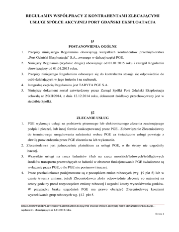 REGULAMIN WSPÓŁPRACY Z KONTRAHENTAMI ZLECAJĄCYMI USŁUGI SPÓŁCE AKCYJNEJ PORT GDAŃSKI EKSPLOATACJA §1 POSTANOWIENIA OGÓLNE 1. Przepisy niniejszego Regulaminu obowiązują wszystkich kontrahentów przedsiębiorstwa „Port Gdański Eksploatacja” S.A., zwanego w dalszej części PGE. 2. Niniejszy Regulamin (wydanie drugie) obowiązuje od 01.01.2015 roku i zastąpił Regulamin obowiązujący od 01.01.2013 roku. 3. Przepisy niniejszego Regulaminu odnoszące się do kontrahenta stosuje się odpowiednio do osób działających w jego imieniu i na rachunek. 4. Integralną częścią Regulaminu jest TARYFA PGE S.A. 5. Niniejszy dokument został zatwierdzony przez Zarząd Spółki Port Gdański Eksploatacja uchwałą nr 2/XII/2014, z dnia 12.12.2014 roku, dokument źródłowy przechowywany jest w siedzibie Spółki. §2 ZLECANIE USŁUG 1. PGE wykonuje usługi na podstawie pisemnego lub elektronicznego zlecenia zawierającego podpis i pieczęć, lub innej formie zaakceptowanej przez PGE.. Zobowiązanie Zleceniodawcy do terminowego uregulowania należności wobec PGE za świadczone usługi powstaje z chwilą potwierdzenia przez PGE zlecenia na ich wykonanie. 2. Zleceniodawca jest jednocześnie płatnikiem za usługi PGE, o ile strony nie uzgodniły inaczej. 3. Wszystkie usługi na rzecz ładunków i/lub na rzecz morskich/lądowych/śródlądowych środków transportu przewożących te ładunki w obszarze funkcjonowania PGE świadczone są wyłącznie przez PGE, o ile PGE nie postanowi inaczej. 4. Prace przeładunkowe podejmowane są z początkiem zmian roboczych (wg. §9 pkt 5) lub w czasie trwania zmiany, jeżeli Zleceniodawca złoży odpowiednie zlecenie co najmniej na cztery godziny przed rozpoczęciem zmiany roboczej i uzgodni koszty wyczekiwania ganków. W przypadku braku uzgodnień PGE ma prawo obciążyć Zleceniodawcę kosztami wyczekiwania grup roboczych wg. §12 pkt 5. REGULAMINWSPÓŁPRACYZKONTRAHENTAMIZLECAJĄCYMIUSŁUGISPÓŁCEAKCYJNEJPORTGDAŃSKIEKSPLOATACJA‐ wydanie2–obowiązująceod1.01.2015roku. Strona1 5. Przyjęcie zlecenia bez zastrzeżeń jest równoznaczne z zawarciem umowy o wykonanie usług określonych w zleceniu. W razie wniesienia zastrzeżeń Strony powinny niezwłocznie uzgodnić ostateczną treść zlecenia. 6. Przyjęcie zlecenia odbywa się, jeżeli strony nie umówiły się inaczej, przez umieszczenie pieczątki, podpisu, daty i godziny przez przyjmującego zlecenie na kopii zlecenia przeznaczonego dla Zleceniodawcy. 7. Jeżeli w toku wykonywania zlecenia wynikną przeszkody lub trudności, o których jedna lub obie strony nie wiedziały w chwili zawierania umowy, obie strony zobowiązane są wówczas ustalić dalszy tok postępowania. 8. Zmiany lub uzupełnienia do zleceń powinny być zgłaszane przez Zleceniodawcę na piśmie, w trybie podanym dla zleceń z powołaniem się na datę i numer zlecenia zasadniczego. 9. PGE obowiązana jest wykonać zlecone czynności w ustalonych terminach. W przypadku niewykonania zlecenia na załadunek gotowych do wysyłki ładunków z braku możliwości technicznych lub pracowników, PGE nie nalicza opłat składowych za okres od uzgodnionego terminu rozpoczęcia obsługi do rzeczywistego rozpoczęcia obsługi. 10. Zlecenie na obsługę statku (zgłoszenie wejścia/wyjścia) winno zawierać: - nazwę statku, jego flagę i kod wywoławczy, - rodzaj statku i jego parametry (długość całkowita, szerokość maksymalna, maksymalne zanurzenie w wodzie słodkiej), zanurzenie statku na wejściu do portu i na wyjściu z portu, - pojemność brutto statku (GT), - nazwę portu, z którego statek przypłynął i/ lub nazwę portu, do którego się udaje, - ilość i rodzaj ładunku do wyładowania/ załadowania przez PGE, - nazwę i adres armatora lub czarterującego oraz agenta – ze wskazaniem płatnika za zlecone usługi. 11. PGE przyjmuje statki do obsługi na zasadach „no despatch/ no demurrage”, o ile strony nie uzgodnią inaczej. 12. Ostatecznie o przyjęciu w określonym terminie i miejscu statku do obsługi decyduje Główny Koordynator PGE. 13. W przypadku stwierdzenia niezgodności w zgłoszonych parametrach technicznych statku w stosunku do stanu rzeczywistego, PGE ma prawo odmówić przyjęcia zlecenia na obsługę. 14. Agent statku winien posiadać pisemne pełnomocnictwo do działania w imieniu armatora lub czarterującego oraz zabezpieczyć wszelkie należności PGE związane z obsługą statku, przed wyjściem statku z portu. 15. Zleceniodawca usługi obowiązany jest podać w zleceniu wszelkie informacje na temat ładunku (nazwę, wagę, pojemność, liczbę sztuk, rodzaj i cechy opakowania, specyfikację REGULAMINWSPÓŁPRACYZKONTRAHENTAMIZLECAJĄCYMIUSŁUGISPÓŁCEAKCYJNEJPORTGDAŃSKIEKSPLOATACJA‐ wydanie2–obowiązująceod1.01.2015roku. Strona2 sztuk ciężkich i przestrzennych wraz z podaniem wymiarów, klasę IMO o ile ładunek posiada oraz w przypadku klasy IMO kartę charakterystyki ładunku oraz kraj pochodzenia ładunku, kraj przeznaczenia ładunku, nazwę statku, port przeznaczenia – dotyczy to zleceń A, C i kwitów B – opisanych w Załączniku nr 2 do Regulaminu). 16. Przy wyładunku ze statku, Zleceniodawca usługi powinien uzupełnić zlecenie na wyładunek manifestem w języku polskim, w trzech egzemplarzach. Przy załadunku na statek Zleceniodawca usługi powinien uzupełnić zlecenie na załadunek listą ładunkową w trzech egzemplarzach, w języku polskim. Manifest przy wyładunku i lista ładunkowa przy załadunku są częścią składową zlecenia. Listy ładunkowe powinny zawierać numery kwitów składowych oraz wymieniać miejsca złożenia ładunku. 17. Jeżeli ładunek został zadeklarowany bez podania cech, PGE składuje go bez uwzględniania cech. Przy podjęciu ładunku Zleceniodawca żądając wydania według cech, powinien uprzednio zlecić sortowanie ładunku w składach portowych. Przeprowadzenie sortowania, ważenia i innych prac manipulacyjnych w trakcie przeł