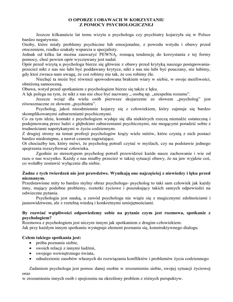 O OPORZE I OBAWACH W KORZYSTANIU Z POMOCY PSYCHOLOGICZNEJ Jeszcze kilkanaście lat temu wizyta u psychologa czy psychiatry kojarzyła się w Polsce bardzo negatywnie. Osoby, które miały problemy psychiczne lub emocjonalne, z powodu wstydu i obawy przed otoczeniem, rzadko szukały wsparcia u specjalisty. Jednak od kilku lat można zauważyć PEWNĄ, rosnącą tendencję do korzystania z tej formy pomocy, choć pewien opór wyczuwany jest nadal. Opór przed wizytą u psychologa bierze się głównie z obawy przed krytyką naszego postępowaniaprzecież nikt z nas nie lubi być poddawany krytyce, nikt z nas nie lubi być pouczany, nie lubimy, gdy ktoś zwraca nam uwagę, że coś robimy nie tak, że cos robimy źle. Niechęć ta może być również spowodowana brakiem wiary w siebie, w swoje możliwości, obniżoną samooceną. Obawa, wstyd przed spotkaniem z psychologiem bierze się także z lęku. A lęk polega na tym, że nikt z nas nie chce być nazwany „ osobą np. „niespełna rozumu”. Jeszcze wciąż dla wielu osób pierwsze skojarzenie ze słowem „psycholog” jest równoznaczne ze słowem „psychiatra”. Psycholog, jakoś nieodmiennie kojarzy się z człowiekiem, który zajmuje się bardzo skomplikowanymi zaburzeniami psychicznymi. Co za tym idzie, kontakt z psychologiem wydaje się dla niektórych rzeczą niemalże ostateczną i podejmowaną przez ludzi z głębokimi zaburzeniami psychicznymi, nie mogącymi poradzić sobie z trudnościami napotykanymi w życiu codziennym. Z drugiej strony na temat profesji psychologów krąży wiele mitów, które czynią z nich postaci bardzo niedostępne, a nawet czasem zagrażające. Ot chociażby ten, który mówi, że psycholog potrafi czytać w myślach, czy na podstawie jednego spojrzenia rozszyfrować człowieka. Zgodnie ze stereotypem psycholog potrafi przewidzieć każde nasze zachowanie i wie od razu o nas wszystko. Każdy z nas miałby przecież w takiej sytuacji obawy, że na jaw wyjdzie coś, co wolałby zostawić wyłącznie dla siebie. Żadne z tych twierdzeń nie jest prawdziwe. Wynikają one najczęściej z niewiedzy i lęku przed nieznanym. Przedstawione mity to bardzo mylny obraz psychologa- psycholog to taki sam człowiek jak każdy inny, mający podobne problemy, rozterki życiowe i poszukujący takich samych odpowiedzi na odwieczne pytania. Psychologia jest nauką, a zawód psychologa nie wiąże się z magicznymi zdolnościami i jasnowidztwem, ale z rzetelną wiedzą i konkretnymi umiejętnościami. By rozwiać wątpliwości odpowiedzmy sobie na pytanie czym jest rozmowa, spotkanie z psychologiem? Rozmowa z psychologiem jest niczym innym jak spotkaniem z drugim człowiekiem. Jak przy każdym innym spotkaniu występuje element poznania się, konstruktywnego dialogu. Celem takiego spotkania jest: próba poznania siebie, swoich relacji z innymi ludźmi, swojego wewnętrznego świata, odnalezienie zasobów własnych do rozwiązania konfliktów i problemów życia codziennego Zadaniem psychologa jest pomoc danej osobie w zrozumieniu siebie, swojej sytuacji życiowej oraz w zrozumieniu innych osób i spojrzeniu na określony problem z różnych perspektyw. Będzie to możliwe tylko wtedy, gdy wspólnie stworzy atmosferę bezpieczeństwa, akceptacji i zaufania. Wbrew przyjętym opiniom, psycholog nie da nikomu gotowej recepty na zażegnanie kłopotliwej sytuacji. Będzie on jedynie postępował w taki sposób, aby klient sam odkrył najlepsze dla siebie rozwiązanie, bo w końcu to on decyduje o swoim życiu. Zatem do psychologa idziemy wtedy kiedy jest nam źle, kiedy czujemy, że mamy jakiś problem, coś nas dręczy. Może to być, np.: dokuczliwy smutek - depresja, łatwe denerwowanie się, lęki, wybuchy złości, agresji, poczucie osamotnienia lub braku poczucia bezpieczeństwa lub wiele innych problemów, które nie sposób tu wszystkich wymienić. Idziemy wówczas po poradę lub tylko po to, by nas ktoś po prostu wysłuchał. Czasem pomoc, która przybiera formę jedynie wysłuchania drugiego człowieka jest już wystarczająca, by samopoczucie uległo poprawie. Ważne jest to, iż psycholog nie nawiązuje kontaktów towarzyskich ani bliskich więzi. Aby móc skutecznie pomagać musi pozostać osobą neutralną. Ma przewagę nad przyjacielem czy członkami rodziny, gdyż nie jest obciążony emocjami związanymi z osobą, jest przez to bardziej obiektywny. To właśnie ten obiektywizm pozwala mu rozsądniej oglądnąć nasze problemy i rozsądniej doradzić. Psycholog, wykorzystując swoją specjalistyczną wiedzę i doświadczenie, pomaga zobaczyć problem w szerszym kontekście, mobilizuje do samodzielnego poszukiwania rozwiązań oraz towarzyszy w podejmowaniu decyzji i dokonywaniu zmian. Pójście do psychologa jest posunięciem bardzo rozsądnym. Kiedy boli nas ząb, idziemy do dentysty. Gdy złamiemy sobie rękę, musi zająć się nami chirurg. Gdy boli nas serce- korzystamy z pomocy kardiologa. A kiedy mamy złe samopoczucie czy sprawę, która nas dręczy – idziemy do psychologa. Tak jak nie mamy oporów w korzystaniu z pomocy specjalistów innych dziedzin, tak nie powinniśmy mieć obaw przed korzystaniem z pomocy psychologicznej. Dlaczego tak ważna sfera, jaką jest psychika, miałaby zostać pozbawiona właściwej opieki ??? Wiadomym jest, że aby być zdrowym i sprawnym należy pamiętać nie tylko o właściwym odżywianiu, aktywności fizycznej czy odpoczynku, ale też o wewnętrznej równowadze. Dlatego właśnie pójście do psychologa nie jest wstydliwe, ale rozsądne - świadczy o właściwej trosce o siebie. Zamiast cierpieć w ukryciu czy próbować sobie radzić samemu, dręczyć siebie, dręczyć wszystkich wokół- to lepiej skorzystać z pomocy psychologicznej… zapytać: „co mi jest?”, „co mogę zrobić, żeby było mi lepiej”??? Ważna też jest wewnętrzna motywacja - trzeba czuć potrzebę zmian, by je w sobie przeprowadzać. Dzisiejsze rozważania na temat obaw w korzy