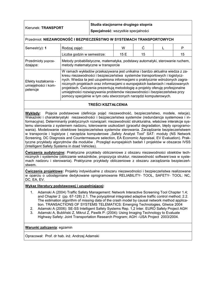 Kierunek: TRANSPORT Studia stacjonarne drugiego stopnia Specjalność: wszystkie specjalności Przedmiot: NIEZAWODNOŚĆ I BEZPIECZEŃSTWO W SYSTEMACH TRANSPORTOWYCH Semestr(y): 1 Rodzaj zajęć: Liczba godzin w semestrze: W Ć 15 E 15 L P 15 Przedmioty poprzedzające: Metody probabilistyczne, matematyka, podstawy automatyki, sterowanie ruchem, metody matematyczne w transporcie Efekty kształcenia umiejętności i kompetencje W ramach wykładów przekazywana jest unikalna i bardzo aktualna wiedza z zakresu niezawodności i bezpieczeństwa systemów transportowych i logistycznych. Wiedza ta jest uzupełniona informacjami o praktycznie wdrożonych zagranicznych projektach oraz informacjami o europejskich badaniach i realizowanych projektach. Ćwiczenia prezentują metodologię a projekty oferuję profesjonalne umiejętności rozwiązywania problemów niezawodności i bezpieczeństwa przy pomocy specjalnie w tym celu stworzonych narzędzi komputerowych. TREŚCI KSZTAŁCENIA Wykłady: Pojęcia podstawowe (definicja pojęć niezawodność, bezpieczeństwo, modele, relacje). Wskaźniki i charakterystyki niezawodności i bezpieczeństwa systemów (redundancja systemowa i informacyjna). Determinanty praktycznych rozwiązań: niezawodność strukturalna, właściwe interakcje systemu sterowania z systemem nadzoru, tolerowanie uszkodzeń (graceful degradation, błędy oprogramowania). Modelowanie obiektowe bezpieczeństwa systemów sterowania. Zarządzanie bezpieczeństwem w transporcie i logistyce ( narzędzia komputerowe „Safety Analyst Tool” SAT: moduły (NS Network Screening, DC Diagnosis and Countermeasure selection, EA Economic Appraisal, EV Evaluation). Praktyczne przykłady algorytmów dla modułów . Przegląd europejskich badań I projektów w obszarze IVSS (Intelligent Safety Systems in doad Vehicles). Ćwiczenia audytoryjne: Praktyczne przykłady obliczeniowe z obszaru niezawodności obiektów technicznych i systemów (obliczanie wskaźników, propozycja struktur, niezawodność software’owa w systemach nadzoru i sterowania). Praktyczne przykłady obliczeniowe z obszaru zarządzania bezpieczeństwem. Ćwiczenia projektowe: Projekty indywidualne z obszaru niezawodności i bezpieczeństwa realizowane w oparciu o udostępniane dedykowane oprogramowanie RELIABILITY- TOOL, SAFETY- TOOL: NC, DC, EA, EV. Wykaz literatury podstawowej i uzupełniającej: 1. 2. 3. Adamski A (2004) Traffic Safety Management: Network Interactive Screening Tool Chapter 1.4; and Chapter 2 (pp. 67-128) 2.1. The polyoptimal integrated adaptive traffic control method; 2.2. The estimation algorithm of missing data of the crash model by causal network method application. TRANSACTIONS OF SYSTEMS TELEMATICS: Emerging Technologies, Gliwice 2004 Adamski A (2006): SE-SS Intelligent Safety Systems Rep. 1,2 Inter. EURO Safety Project AGH Adamski A, Bubliński Z, Mikrut Z, Pawlik P: (2004): Using Imaging Technology to Evaluate Highway Safety: Joint Transportation Research Program; AGH –USA Project 2003/2004. Warunki zaliczenia: egzamin Opracował: Prof. dr hab. inż. Andrzej Adamski