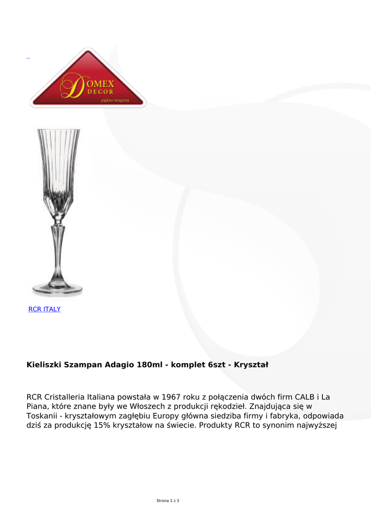 RCR ITALY Kieliszki Szampan Adagio 180ml - komplet 6szt - Kryształ RCR Cristalleria Italiana powstała w 1967 roku z połączenia dwóch firm CALB i La Piana, które znane były we Włoszech z produkcji rękodzieł. Znajdująca się w Toskanii - kryształowym zagłębiu Europy główna siedziba firmy i fabryka, odpowiada dziś za produkcję 15% kryształow na świecie. Produkty RCR to synonim najwyższej Strona 1 z 3 jakości i przykład połączenia tradycyjnynego rękodzieła z nowoczesna technologią produkcji kryształów. W 2008 roku firma opracowała unikalny w skali światowej materiał szklany Luxor o niezwykłej wytrzymałości. Dodatkowe informacje Kolekcja RCR Cristalleria Italiana - ADAGIO Kieliszki wykonane z opatentowanego przez RCR kryształu Luxion. Pojemność 180 ml Strona 2 z 3 Kieliszki są zapakowane w fabrycznym ładnym kartoniku, idealne na prezent lub do własnego użytku. Najwyższej jakości szkło kryształowe. Komplet 6 kieliszków do szampana. Import z Włoch Strona 3 z 3