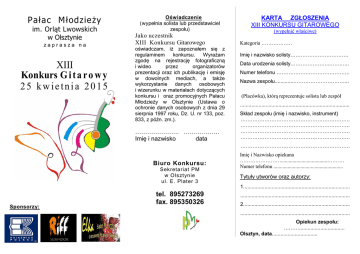Pałac Młodzieży im. Orląt Lwowskich w Olsztynie zaprasza na XIII Konkurs G i t a r o w y 25 kwietnia 2015 Oświadczenie (wypełnia solista lub przedstawiciel zespołu) Jako uczestnik XIII Konkursu Gitarowego oświadczam, iż zapoznałem się z regulaminem konkursu. Wyrażam zgodę na rejestrację fotograficzną i wideo przez organizatorów prezentacji oraz ich publikację i emisję w dowolnych mediach, a także wykorzystanie danych osobowych i wizerunku w materiałach dotyczących konkursu i oraz promocyjnych Pałacu Młodzieży w Olsztynie (Ustawa o ochronie danych osobowych z dnia 29 sierpnia 1997 roku, Dz. U. nr 133, poz. 833, z późn. zm.). …………………. ……………… Imię i nazwisko data KARTA ZGŁOSZENIA XIII KONKURSU GITAROWEGO (wypełnić właściwe) Kategoria ……………… Imię i nazwisko solisty……………………………. Data urodzenia solisty…………………..…….….. Numer telefonu ………………………………….… Nazwa zespołu.............…………………………... (Placówka), którą reprezentuje solista lub zespół ............................................................................. Skład zespołu (imię i nazwisko, instrument) ………………………………………………………. ………………………………………………………. ………………………………………………………. ………………………………………………………. ………………………………………………………. Biuro Konkursu: Sekretariat PM w Olsztynie ul. E. Plater 3 Imię i Nazwisko opiekuna ……………………....................................………. Numer telefonu ...................................................... Tytuły utworów oraz autorzy: 1........................................................................... Sponsorzy: tel. 895273269 fax. 895350326 ............................................................................. 2........................................................................... ............................................................................. Opiekun zespołu: ………................................ Olsztyn, data................................ REGULAMIN XIII KONKURSU GITAROWEGO 1. Adresaci: - Uczniowie szkół podstawowych i ponadpodstawowych grający amatorsko na gitarze klasycznej lub akustycznej. 2.Cele: - prezentacja umiejętności w dziedzinie gry na gitarze oraz muzykowania w zespole; - popularyzacja muzyki gitarowej; - kształtowanie wrażliwości artystycznej i kulturalnej; - odkrywanie i promocja talentów. 3. Kategorie: I kategoria — soliści do lat 13 II kategoria – soliści w wieku 14lat i więcej III kategoria - zespoły kameralne z udziałem gitary klasycznej 4. Warunki uczestnictwa: -czas prezentacji nie powinien przekroczyć 8 minut -zgłoszenie należy przesłać na maila [email protected] lub pocztą na adres Pałacu Młodzieży w Olsztynie z dopiskiem konkurs gitarowy, w terminie do 18.04.2015r. 5. Dla laureatów przewidziane są atrakcyjne nagrody rzeczowe za I,II,III miejsce. Jedną z nagród jest udział w koncercie Orkiestry Gitarowej Pałacu Młodzieży Jury ma prawo nie przyznać w/w nagrody. Wszyscy uczestnicy konkursu otrzymają dyplom za udział. Jury ma prawo do innego podziału nagród oraz łączenia kategorii. 6. Oceny występów dokona jury powołane przez organizatora. 7. Jury będzie oceniało: - dobór repertuaru, - technikę wykonania, - walory artystyczne wykonania, - umiejętność autoprezentacji. 8. Decyzje jury są ostateczne. 9. Wyniki konkursu zostaną umieszczone na stronie internetowej: www.palac.olsztyn.pl 10. Organizatorzy konkursu nie pokrywają kosztów dojazdu ani wyżywienia uczestników i ich opiekunów. 11. Pytania odnośnie konkursu prosimy kierować na adres mailowy lub telefoniczny do organizatorów konkursu: [email protected] tel. 601-983-854. [email protected] tel. 661-854-691. Organizator konkursu: Pałac Młodzieży im. Orląt Lwowskich 10-562 Olsztyn ul. Emilii Plater 3 Telefon: 89 527 32 69 www.palac.olsztyn.pl Informacje konkursowe Doświadczenie solisty/zespołu ……..……………...................................……….. ……………………………………………………… ……………………………………………………… ……………………………………………………… ……………………………………………………… ……………………………………………………… ……………………………..................................... .........................................………………………… ........………………………………………………… 12. Przebieg konkursu: ……………………………………………………… 9.00 - 10.15 potwierdzenie udziału, oraz próby akustyczne. ……………………………………………………… 10.30 otwarcie konkursu ……………………………………………………… - prezentacje w kategorii I - prezentacje w kategorii II - prezentacje w kategorii III ……………………………………………………… …………………………......................................... ....................................……………………………. (proszę wymienić osiągnięcia, sukcesy, pasje i zainteresowania, cel udziału, itp.)