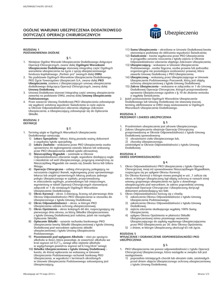 UG/OWUD/144/05-2014/C OGÓLNE WARUNKI UBEZPIECZENIA DODATKOWEGO DOTYCZĄCE OPERACJI CHIRURGICZNYCH ROZDZIAŁ 1 POSTANOWIENIA OGÓLNE 1. 2. 3. 4. § 1. Niniejsze Ogólne Warunki Ubezpieczenia Dodatkowego dotyczące Operacji Chirurgicznych, zwane dalej Ogólnymi Warunkami Ubezpieczenia Dodatkowego stanowią integralną część Ogólnych warunków ubezpieczenia na życie z opcją ubezpieczeniowego funduszu kapitałowego „Partner pro” zwanych dalej OWU. Na podstawie Ogólnych Warunków Ubezpieczenia Dodatkowego, PKO Życie Towarzystwo Ubezpieczeń S.A., zwana dalej PKO Ubezpieczenia, zawiera z Ubezpieczającym umowę ubezpieczenia dodatkowego dotyczącą Operacji Chirurgicznych, zwaną dalej Umową Dodatkową. Umowa Dodatkowa stanowi integralną część umowy ubezpieczenia zawartej na podstawie OWU, zwanej dalej Umową Ubezpieczenia Podstawowego. Przez zawarcie Umowy Dodatkowej PKO Ubezpieczenia zobowiązuje się wypłacić ustaloną wysokość Świadczenia w razie zajścia w Okresie Odpowiedzialności zdarzenia objętego Zakresem Ubezpieczenia, a Ubezpieczający zobowiązuje się do Opłacania Składki. 2. ROZDZIAŁ 3 PRZEDMIOT I ZAKRES UBEZPIECZENIA ROZDZIAŁ 2 DEFINICJE 1. § 2. Terminy użyte w Ogólnych Warunkach Ubezpieczenia Dodatkowego oznaczają: 1) Lekarz Specjalista – lekarz, który posiada ważny dokument o uzyskaniu tytułu specjalisty; 2) Lekarz Zaufania – wskazana przez PKO Ubezpieczenia osoba uprawniona do wykonywania zawodu lekarza lub wskazany przez PKO Ubezpieczenia zakład opieki zdrowotnej; 3) Nieszczęśliwy Wypadek – zaistniałe w Okresie Odpowiedzialności zdarzenie nagłe, wywołane działającą nagle i niezależnie od woli Ubezpieczonego, przyczyną zewnętrzną; za Nieszczęśliwy Wypadek nie uważa się Zawału Serca lub Udaru Mózgu; 4) Operacja Chirurgiczna – zabieg chirurgiczny polegający na naruszeniu ciągłości tkanek, wykonywany przez uprawnionego lekarza lub zespół uprawnionych lekarzy podczas jednego pobytu Ubezpieczonego w szpitalu, przeprowadzony w znieczuleniu ogólnym, przewodowym lub miejscowym, wymieniony w tabeli Operacji Chirurgicznych stanowiącej załącznik nr 1 do niniejszych Ogólnych Warunków Ubezpieczenia Dodatkowego; 5) Okres Karencji – okres 3 miesięcy, liczony od pierwszego dnia Okresu Odpowiedzialności PKO Ubezpieczenia w stosunku do Ubezpieczonego z tytułu Umowy Dodatkowej. 6) Okres Odpowiedzialności – okres, w którym PKO Ubezpieczenia udziela ochrony ubezpieczeniowej; 7) Okres Opóźnienia – okres kolejnych 60 dni, rozpoczynający się pierwszego dnia okresu, za który Składka Ubezpieczeniowa z tytułu Umowy Dodatkowej jest należna, jeżeli nie nastąpiło Opłacenie Składki; 8) Opłacenie Składki – uznanie rachunku bankowego PKO Ubezpieczenia kwotą Składki Ubezpieczeniowej z tytułu Umowy Dodatkowej pod warunkiem opłacenia składki ubezpieczeniowej z tytułu Umowy Ubezpieczenia Podstawowego; 9) Pozostawanie pod wpływem Alkoholu – stan po spożyciu alkoholu w ilości, która powoduje, że zawartość alkoholu we krwi wynosi od 0,2o/oo wzwyż albo stężenie alkoholu w wydychanym powietrzu wynosi od 0,1mg/dcm3 wzwyż; 10) Składka Ubezpieczeniowa z tytułu Umowy Dodatkowej – kwota, do której wpłacania na wskazany w Umowie Ubezpieczenia Podstawowego rachunek bankowy PKO Ubezpieczenia, w wysokości i terminach określonych w Umowie Ubezpieczenia Podstawowego zobowiązany jest Ubezpieczający; Obowiązuje od 19 maja 2014 r. 11) Suma Ubezpieczenia – określona w Umowie Dodatkowej kwota stanowiąca podstawę do obliczenia wysokości Świadczenia; 12) Świadczenie – kwota wypłacana przez PKO Ubezpieczenia w przypadku uznania roszczenia z tytułu zajścia w Okresie Odpowiedzialności zdarzenia objętego Zakresem Ubezpieczenia; 13) Ubezpieczający – wskazana w Umowie Ubezpieczenia Podstawowego , osoba fizyczna, osoba prawna lub jednostka organizacyjna nie posiadająca osobowości prawnej, która zawarła Umowę Dodatkową z PKO Ubezpieczenia; 14) Ubezpieczony – wskazany przez Ubezpieczającego w Umowie Ubezpieczenia Podstawowego Pracownik, który jest objęty ochroną ubezpieczeniową z tytułu Umowy Dodatkowej; 15) Zakres Ubezpieczenia – wskazane w załączniku nr 1 do Umowy Dodatkowej Operacje Chirurgiczne, których przeprowadzenie uprawnia Ubezpieczonego zgodnie z § 10 do złożenia wniosku o wypłatę Świadczenia. Jeżeli postanowienia Ogólnych Warunków Ubezpieczenia Dodatkowego lub Umowy Dodatkowej nie stanowią inaczej, terminy zdefiniowane w OWU mają zastosowanie w Ogólnych Warunkach Ubezpieczenia Dodatkowego. 1. 2. § 3. Przedmiotem ubezpieczenia jest zdrowie Ubezpieczonego. Zakres Ubezpieczenia obejmuje Operację Chirurgiczną przeprowadzoną w Okresie Odpowiedzialności z tytułu Umowy Dodatkowej spowodowaną: 1) obrażeniami ciała Ubezpieczonego lub, 2) chorobą Ubezpieczonego, zaistniałymi w Okresie Odpowiedzialności z tytułu Umowy Dodatkowej. ROZDZIAŁ 4 OKRES ODPOWIEDZIALNOŚCI 1. 2. 3. § 4. Okres Odpowiedzialności PKO Ubezpieczenia z tytułu Operacji Chirurgicznej, innej niż spowodowana Nieszczęśliwym Wypadkiem, rozpoczyna się po upływie Okresu Karencji. Do Okresu Karencji o którym mowa powyżej w ust. ,1 zalicza się okres, w którym Ubezpieczony był objęty ochroną w ramach innej umowy grupowego ubezpieczenia na życie u dowolnego ubezpieczyciela pod warunkiem, że zakres poprzedniej umowy obejmował Operacje Chirurgiczne i Ubezpieczony doręczył dokument potwierdzający ten fakt. Okres Odpowiedzialności kończy się z chwilą: 1) zakończenia Okresu Odpowiedzialności z tytułu Umowy Ubezpieczenia Podstawowego; 2) zakończenia Okresu Odpowiedzialności z tytułu Umowy Dodatkowej; 3) zajścia zdarzenia skutkującego wypłatą 100% Sumy Ubezpieczenia; 4) upływu Okresu Opóźnienia w płatności Składki Ubezpieczeniowej mimo pisemnego wezwania Ubezpieczającego do zapłaty wysłanego Ubezpieczającemu przez PKO Ubezpieczenia po 30. dniu Okresu Opó