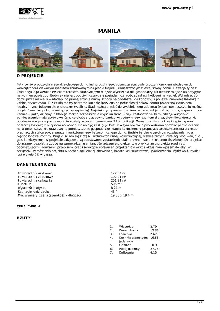 www.pro-arte.pl MANILA O PROJEKCIE MANILA to propozycja niezwykle ciepłego domu jednorodzinnego, odznaczającego się uroczym gankiem wiodącym do wewnątrz oraz ciekawym ryzalitem zbudowanym na planie trapezu, umieszczonym z lewej strony domu. Elewacja tylna z kolei przyciąga wzrok niewielkim tarasem, stanowiącym miejsce wyciszenia dla gospodarzy lub idealne miejsce na przyjęcie na wolnym powietrzu. Budynek nie jest podpiwniczony, ale posiada możliwość adaptacji kotłowni na węgiel. Wchodząc do domu przez niewielki wiatrołap, po prawej stronie mamy schody na poddasze i do kotłowni, a po lewej niewielką łazienkę z kabiną prysznicową. Tuż za nią mamy obszerną kuchnię (przylega do południowej ściany domu) połączoną z aneksem jadalnym, znajdującym się w uroczym ryzalicie. Stąd można przejść do wydzielonego gabinetu (w tym pomieszczeniu można urządzić również pokój telewizyjny czy sypialnię). Największym pomieszczeniem parteru jest jednak ogromny, wyposażony w kominek, pokój dzienny, z którego można bezpośrednio wyjść na taras. Dzięki zastosowaniu komunikacji, wszystkie pomieszczenia mają osobne wejścia, co okaże się zapewne bardzo wygodnym rozwiązaniem dla użytkowników domu. Na poddaszu wszystkie pomieszczenia zostały skoncentrowane wokół komunikacji. Mamy tutaj dwa pokoje i sypialnię oraz obszerną łazienkę z miejscem na wannę. Na uwagę zasługuje fakt, iż w tym projekcie przewidziano odrębne pomieszczenie na pralnię i suszarnię oraz osobne pomieszczenie gospodarcze. Manila to doskonała propozycja architektoniczna dla osób pragnących stylowego, a zarazem funkcjonalnego i ekonomicznego domu. Będzie bardzo wygodnym rozwiązaniem dla pięcioosobowej rodziny. Projekt składa się z części architektonicznej, konstrukcyjnej, wewnętrznych instalacji wod.-kan, c. o. , gaz. i elektrycznej. W projekcie załączone są podstawowe zestawienie stali, drewna i stolarki okienno-drzwiowej. Do projektu dołączamy bezpłatną zgodę na wprowadzenie zmian, oświadczenie projektantów o wykonaniu projektu zgodnie z obowiązującymi normami i przepisami oraz kserokopie uprawnień projektantów wraz z aktualnym wpisem do izby. W przypadku zamówienia projektu w technologii lekkiej, drewnianej konstrukcji szkieletowej, powierzchnia użytkowa budynku jest o około 7% większa. DANE TECHNICZNE Powierzchnia użytkowa Powierzchnia zabudowy Powierzchnia całkowita Kubatura Wysokość budynku Kąt nachylenia dachu Min. wymiary działki (szerokość x długość) 127.33 m² 102.24 m² 201.84 m² 595 m³ 8.21 m 43 ° 19.35 x 19.4 m CENA: 2400 zł RZUTY 1. 2. 3. 4. 5. 6. 7. Wiatrołap Komunikacja Łazienka Kuchnia z aneksem jadalnym Gabinet Pokój dzienny Kotłownia 2.79 12.36 2.67 16.56 10.9 27.73 6.15 1/4 www.pro-arte.pl 1. 2. 3. 4. 5 6. 7. Komunikacja Pokój Sypialnia Pokój Łazienka Pralnia+suszarnia Pom. gospodarcze 11.36 6.98 10.53 9.24 6.98 2.02 1.06 2/4 www.pro-arte.pl 3/4 www.pro-arte.pl tel. (32) 43-50-829, 502 575 920, [email protected], www.pro-arte.pl 4/4 Powered by TCPDF (www.tcpdf.org)
