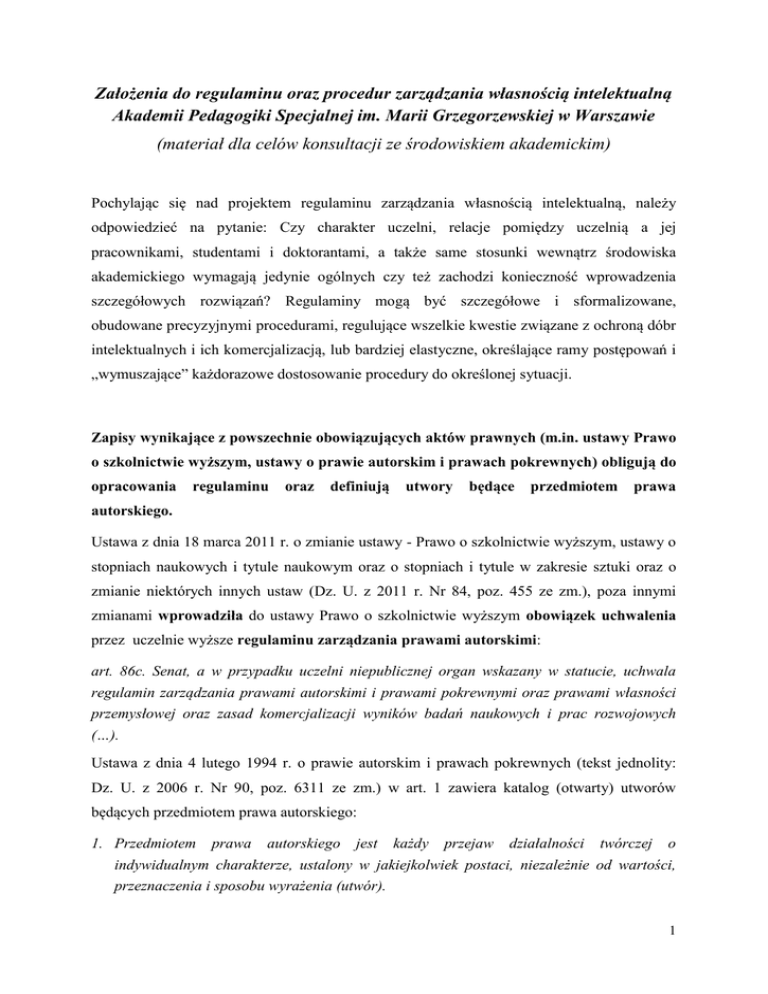 Założenia do regulaminu oraz procedur zarządzania własnością intelektualną Akademii Pedagogiki Specjalnej im. Marii Grzegorzewskiej w Warszawie (materiał dla celów konsultacji ze środowiskiem akademickim) Pochylając się nad projektem regulaminu zarządzania własnością intelektualną, należy odpowiedzieć na pytanie: Czy charakter uczelni, relacje pomiędzy uczelnią a jej pracownikami, studentami i doktorantami, a także same stosunki wewnątrz środowiska akademickiego wymagają jedynie ogólnych czy też zachodzi konieczność wprowadzenia szczegółowych rozwiązań? Regulaminy mogą być szczegółowe i sformalizowane, obudowane precyzyjnymi procedurami, regulujące wszelkie kwestie związane z ochroną dóbr intelektualnych i ich komercjalizacją, lub bardziej elastyczne, określające ramy postępowań i „wymuszające” każdorazowe dostosowanie procedury do określonej sytuacji. Zapisy wynikające z powszechnie obowiązujących aktów prawnych (m.in. ustawy Prawo o szkolnictwie wyższym, ustawy o prawie autorskim i prawach pokrewnych) obligują do opracowania regulaminu oraz definiują utwory będące przedmiotem prawa autorskiego. Ustawa z dnia 18 marca 2011 r. o zmianie ustawy - Prawo o szkolnictwie wyższym, ustawy o stopniach naukowych i tytule naukowym oraz o stopniach i tytule w zakresie sztuki oraz o zmianie niektórych innych ustaw (Dz. U. z 2011 r. Nr 84, poz. 455 ze zm.), poza innymi zmianami wprowadziła do ustawy Prawo o szkolnictwie wyższym obowiązek uchwalenia przez uczelnie wyższe regulaminu zarządzania prawami autorskimi: art. 86c. Senat, a w przypadku uczelni niepublicznej organ wskazany w statucie, uchwala regulamin zarządzania prawami autorskimi i prawami pokrewnymi oraz prawami własności przemysłowej oraz zasad komercjalizacji wyników badań naukowych i prac rozwojowych (…). Ustawa z dnia 4 lutego 1994 r. o prawie autorskim i prawach pokrewnych (tekst jednolity: Dz. U. z 2006 r. Nr 90, poz. 6311 ze zm.) w art. 1 zawiera katalog (otwarty) utworów będących przedmiotem prawa autorskiego: 1. Przedmiotem prawa autorskiego jest każdy przejaw działalności twórczej o indywidualnym charakterze, ustalony w jakiejkolwiek postaci, niezależnie od wartości, przeznaczenia i sposobu wyrażenia (utwór). 1 2. W szczególności przedmiotem prawa autorskiego są utwory: 1) wyrażone słowem, symbolami matematycznymi, znakami graficznymi (literackie, publicystyczne, naukowe, kartograficzne oraz programy komputerowe); 2) plastyczne; 3) fotograficzne; 4) lutnicze; 5) wzornictwa przemysłowego; 6) architektoniczne, architektoniczno-urbanistyczne i urbanistyczne; 7) muzyczne i słowno-muzyczne; 8) sceniczne, sceniczno-muzyczne, choreograficzne i pantomimiczne; 9) audiowizualne (w tym filmowe). 21 Ochroną objęty może być wyłącznie sposób wyrażenia; nie są objęte ochroną odkrycia, idee, procedury, metody i zasady działania oraz koncepcje matematyczne. Zasady ochrony praw autorskich i pokrewnych oraz praw własności przemysłowej. Zgodnie z art. 1 ust. 3 i 4 ustawy o prawie autorskim i prawach pokrewnych: 3. Utwór jest przedmiotem prawa autorskiego od chwili ustalenia, chociażby miał postać nieukończoną. 4. Ochrona przysługuje twórcy niezależnie od spełnienia jakichkolwiek formalności. Zasady dotyczące nabywania praw do wytworów intelektualnych stworzonych w ramach stosunku pracy oraz poza nim. W przypadku braku wyraźnie określonych zasad, z mocy ustaw prawa do wyników prac wykonanych przez pracownika uczelni w ramach stosunku pracy lub realizacji innej umowy z uczelnią, przysługują uczelni. Zapis określający powyższą prawidłowość znajduje się w ustawie z dnia 30 czerwca 2000 r. Prawo własności przemysłowej (tekst jednolity Dz. U. z 2003 r. Nr 119, poz. 1117 ze zm.) w art. 11 ust. 3, w powiązaniu z ust. 1: W razie dokonania wynalazku, wzoru użytkowego albo wzoru przemysłowego w wyniku wykonywania przez twórcę obowiązków ze stosunku pracy albo z realizacji innej umowy, 2 prawo, do uzyskania patentu na wynalazek albo prawa ochronnego na wzór użytkowy, jak również prawa z rejestracji wzoru przemysłowego, przysługuje pracodawcy lub zamawiającemu (Uczelni), chyba że strony ustaliły inaczej. Podobny zapis znajduje się w ustawie o prawie autorskim i prawach pokrewnych, której art. 12 ust. 1 stanowi: Jeżeli ustawa lub umowa o pracę nie stanowią inaczej, pracodawca, którego pracownik stworzył utwór w wyniku wykonywania obowiązków ze stosunku pracy, nabywa z chwilą przyjęcia utworu autorskie prawa majątkowe w granicach wynikających z celu umowy o pracę i zgodnego zamiaru stron. Dlatego niezmiernie istotne z punktu widzenia twórców (środowiska akademickiego) jest ustalenie zasad na jakich autorskie prawa majątkowe, czy też prawo do uzyskania patentu na wynalazek, prawa ochronne na wzór użytkowy, albo prawo z rejestracji wzoru przemysłowego, będą przysługiwały pracownikowi (zleceniobiorcy), a na jakich i w jakim zakresie uczelni. Regulamin zarządzania własnością intelektualną musi określać (co jest explicite przedstawione w art. 86c pkt 1-4 ustawy Prawo o szkolnictwie wyższym): 1) prawa i obowiązki uczelni, pracowników oraz studentów i doktorantów w zakresie ochrony i korzystania z praw autorskich i praw pokrewnych oraz praw własności przemysłowej; 2) zasady wynagradzania twórców; 3) zasady i procedury komercjalizacji wyników badań naukowych i prac rozwojowych; 4) zasady korzystania z majątku uczelni wykorzystywanego do komercjalizacji wyników badań naukowych i prac rozwojowych oraz świadczenia usług naukowo-badawczych. Ze względu na dopuszczoną przez ustawodawcę możliwość ustalenia relacji pomiędzy twórcą (wynalazcą) a uczelnią, konieczne jest ustalenie optymalnych zasad które, przy poszanowaniu ekonomicznego interesu stron, będą jednocześnie atrakcyjne dla środowiska akademickiego. W trakcie konsultacji nad kształtem regulaminu zarzą