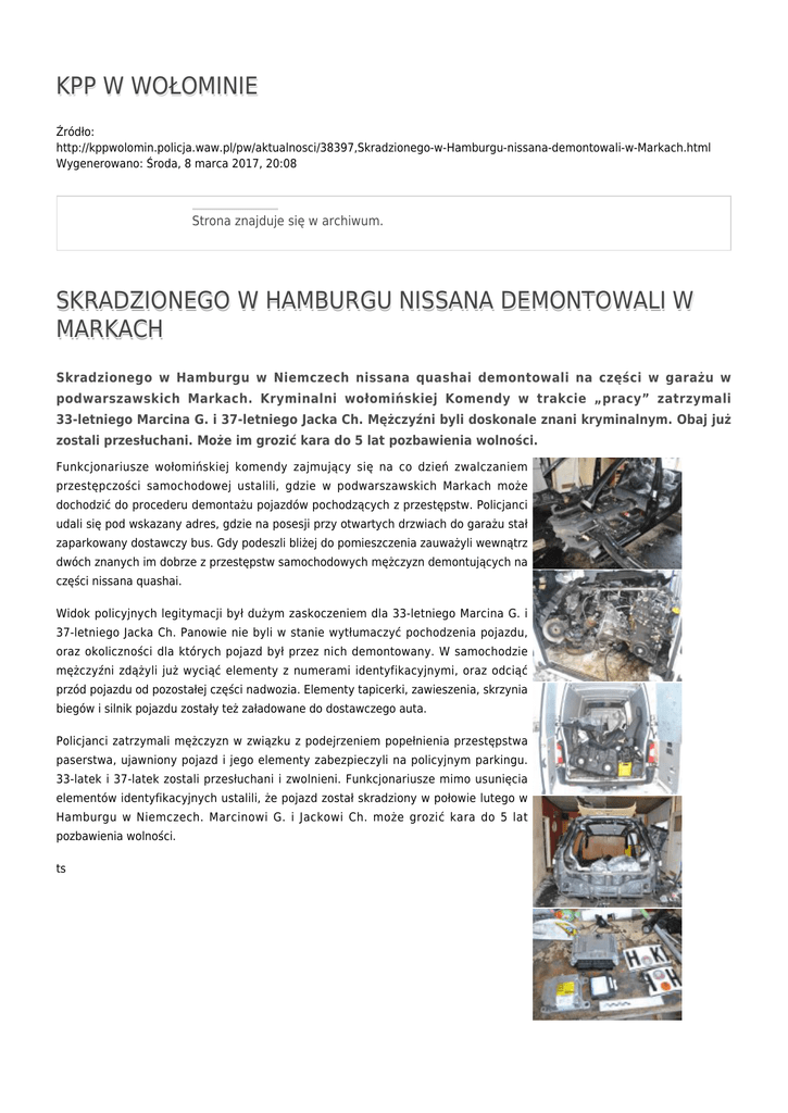 KPP W WOŁOMINIE Źródło: http://kppwolomin.policja.waw.pl/pw/aktualnosci/38397,Skradzionego-w-Hamburgu-nissana-demontowali-w-Markach.html Wygenerowano: Środa, 8 marca 2017, 20:08 Strona znajduje się w archiwum. SKRADZIONEGO W HAMBURGU NISSANA DEMONTOWALI W MARKACH Skradzionego w Hamburgu w Niemczech nissana quashai demontowali na części w garażu w podwarszawskich Markach. Kryminalni wołomińskiej Komendy w trakcie „pracy” zatrzymali 33-letniego Marcina G. i 37-letniego Jacka Ch. Mężczyźni byli doskonale znani kryminalnym. Obaj już zostali przesłuchani. Może im grozić kara do 5 lat pozbawienia wolności. Funkcjonariusze wołomińskiej komendy zajmujący się na co dzień zwalczaniem przestępczości samochodowej ustalili, gdzie w podwarszawskich Markach może dochodzić do procederu demontażu pojazdów pochodzących z przestępstw. Policjanci udali się pod wskazany adres, gdzie na posesji przy otwartych drzwiach do garażu stał zaparkowany dostawczy bus. Gdy podeszli bliżej do pomieszczenia zauważyli wewnątrz dwóch znanych im dobrze z przestępstw samochodowych mężczyzn demontujących na części nissana quashai. Widok policyjnych legitymacji był dużym zaskoczeniem dla 33-letniego Marcina G. i 37-letniego Jacka Ch. Panowie nie byli w stanie wytłumaczyć pochodzenia pojazdu, oraz okoliczności dla których pojazd był przez nich demontowany. W samochodzie mężczyźni zdążyli już wyciąć elementy z numerami identyfikacyjnymi, oraz odciąć przód pojazdu od pozostałej części nadwozia. Elementy tapicerki, zawieszenia, skrzynia biegów i silnik pojazdu zostały też załadowane do dostawczego auta. Policjanci zatrzymali mężczyzn w związku z podejrzeniem popełnienia przestępstwa paserstwa, ujawniony pojazd i jego elementy zabezpieczyli na policyjnym parkingu. 33-latek i 37-latek zostali przesłuchani i zwolnieni. Funkcjonariusze mimo usunięcia elementów identyfikacyjnych ustalili, że pojazd został skradziony w połowie lutego w Hamburgu w Niemczech. Marcinowi G. i Jackowi Ch. może grozić kara do 5 lat pozbawienia wolności. ts Ocena: 0/5 (0) Tweetnij