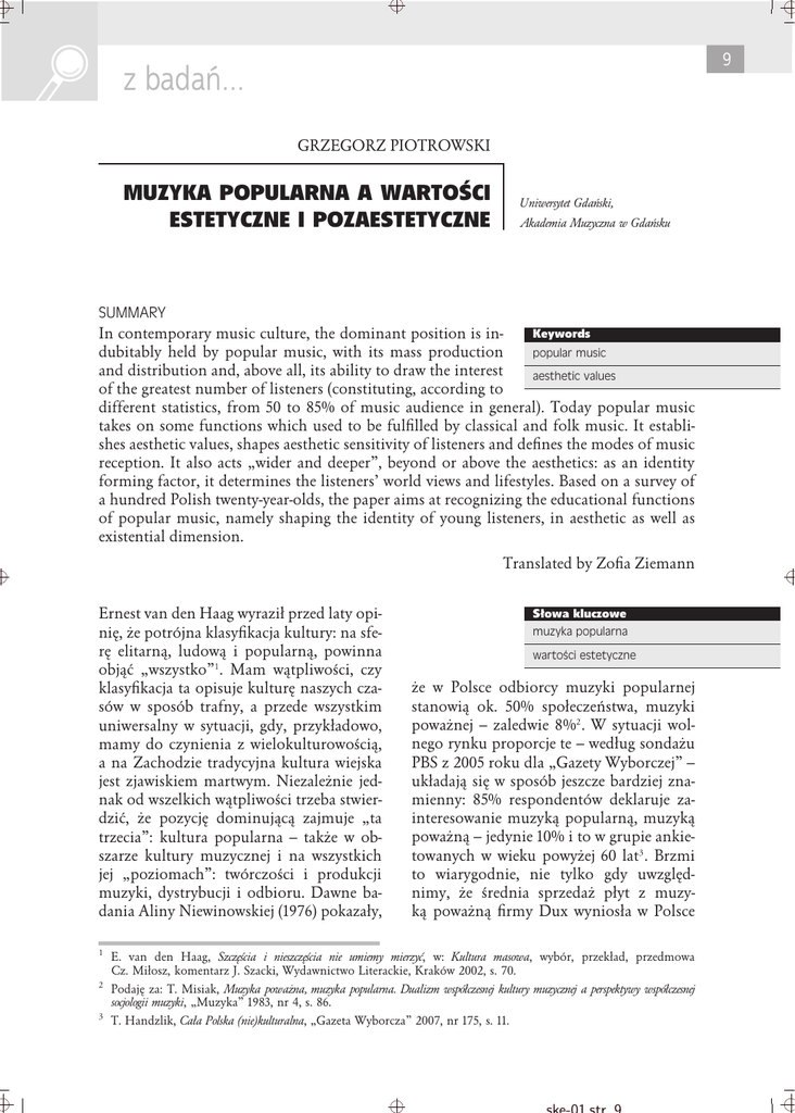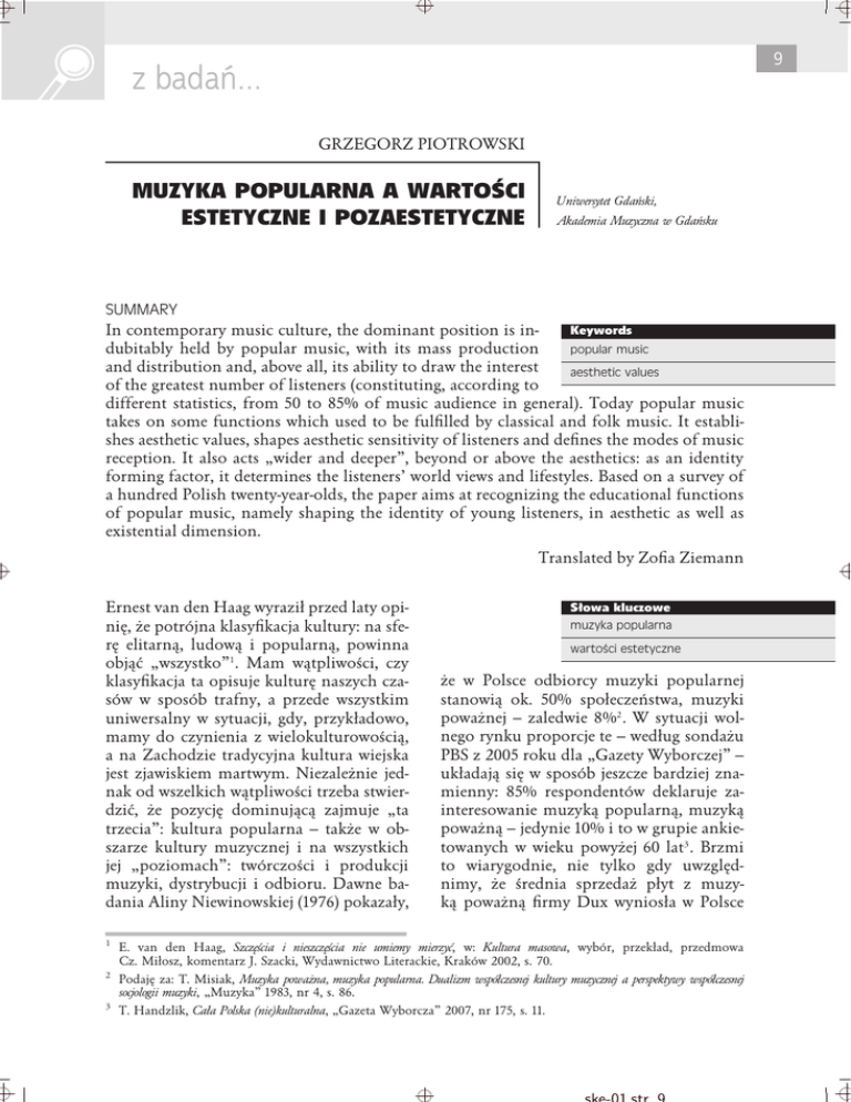 9 z badań... GRZEGORZ PIOTROWSKI MUZYKA POPULARNA A WARTOŚCI ESTETYCZNE I POZAESTETYCZNE Uniwersytet Gdański, Akademia Muzyczna w Gdańsku SUMMARY Keywords In contemporary music culture, the dominant position is inpopular music dubitably held by popular music, with its mass production and distribution and, above all, its ability to draw the interest aesthetic values of the greatest number of listeners (constituting, according to different statistics, from 50 to 85% of music audience in general). Today popular music takes on some functions which used to be fulfilled by classical and folk music. It establishes aesthetic values, shapes aesthetic sensitivity of listeners and defines the modes of music reception. It also acts „wider and deeper”, beyond or above the aesthetics: as an identity forming factor, it determines the listeners’ world views and lifestyles. Based on a survey of a hundred Polish twenty-year-olds, the paper aims at recognizing the educational functions of popular music, namely shaping the identity of young listeners, in aesthetic as well as existential dimension. Translated by Zofia Ziemann Ernest van den Haag wyraził przed laty opinię, że potrójna klasyfikacja kultury: na sferę elitarną, ludową i popularną, powinna objąć „wszystko”1. Mam wątpliwości, czy klasyfikacja ta opisuje kulturę naszych czasów w sposób trafny, a przede wszystkim uniwersalny w sytuacji, gdy, przykładowo, mamy do czynienia z wielokulturowością, a na Zachodzie tradycyjna kultura wiejska jest zjawiskiem martwym. Niezależnie jednak od wszelkich wątpliwości trzeba stwierdzić, że pozycję dominującą zajmuje „ta trzecia”: kultura popularna – także w obszarze kultury muzycznej i na wszystkich jej „poziomach”: twórczości i produkcji muzyki, dystrybucji i odbioru. Dawne badania Aliny Niewinowskiej (1976) pokazały, 1 2 3 Słowa kluczowe muzyka popularna wartości estetyczne że w Polsce odbiorcy muzyki popularnej stanowią ok. 50% społeczeństwa, muzyki poważnej – zaledwie 8%2 . W sytuacji wolnego rynku proporcje te – według sondażu PBS z 2005 roku dla „Gazety Wyborczej” – układają się w sposób jeszcze bardziej znamienny: 85% respondentów deklaruje zainteresowanie muzyką popularną, muzyką poważną – jedynie 10% i to w grupie ankietowanych w wieku powyżej 60 lat3 . Brzmi to wiarygodnie, nie tylko gdy uwzględnimy, że średnia sprzedaż płyt z muzyką poważną firmy Dux wyniosła w Polsce E. van den Haag, Szczęścia i nieszczęścia nie umiemy mierzyć, w: Kultura masowa, wybór, przekład, przedmowa Cz. Miłosz, komentarz J. Szacki, Wydawnictwo Literackie, Kraków 2002, s. 70. Podaję za: T. Misiak, Muzyka poważna, muzyka popularna. Dualizm współczesnej kultury muzycznej a perspektywy współczesnej socjologii muzyki, „Muzyka” 1983, nr 4, s. 86. T. Handzlik, Cała Polska (nie)kulturalna, „Gazeta Wyborcza” 2007, nr 175, s. 11.
