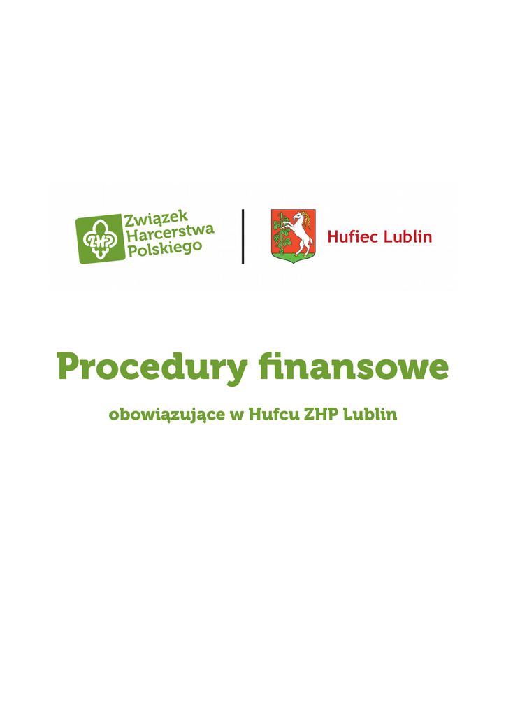 Procedury finansowe obowiązujące w Hufcu ZHP Lublin Spis treści Wstęp................................................................................................................................................................................3 1. Informacje ogólne................................................................................................................................................4 2. Finanse drużyny.....................................................................................................................................................5 Przychody.................................................................................................................................................................5 Rozchody..................................................................................................................................................................5 Dokumentacja finansowa................................................................................................................................5 3. Składki członkowskie...........................................................................................................................................6 Podstawowa składka członkowska.............................................................................................................6 Dodatkowe składki członkowskie zadaniowe.......................................................................................6 Opłacanie składki członkowskiej..................................................................................................................7 Składka członkowska zadaniowa z konta drużyny.............................................................................7 Zwrot wpłaty...........................................................................................................................................................7 4. Akcje zarobkowe...................................................................................................................................................8 Zbiórka publiczna.................................................................................................................................................8 Działalność gospodarcza.................................................................................................................................8 5. Dokumenty księgowe.........................................................................................................................................9 Co może być dokumentem księgowym?...............................................................................................9 Jakie dane musi zawierać?..............................................................................................................................9 Jak opisać dokument?.....................................................................................................................................11 Towary szczególne............................................................................................................................................13 6. Zaliczki......................................................................................................................................................................14 Pobranie zaliczki.................................................................................................................................................14 Rozliczenie.............................................................................................................................................................14 7. Zakupy bez zaliczki.............................................................................................................................................15 8. Dokumenty płatne przelewem....................................................................................................................16 9. Faktury za udział w przedsięwzięciach...................................................................................................17 10. Zakupy w sklepiku Hufca..............................................................................................................................18 Zamówienia..........................................................................................................................................................18 11. Finanse podczas HALiZ..................................................................................................................................19 Wpłaty na HAL i HAZ........................................................................................................................................19 Zaliczki na działania jednostek podczas HALiZ.................................................................................19 Faktury bez zaliczek..........................................................................................................................................19 Komendanci form HALiZ...............................................................................................................................19 Historia zmian...........................................................................................................................................................21 Procedury finansowe Hufca ZHP Lublin Strona 2 z 21 Wstęp Druhny i Druhowie! Przedstawiamy wam zbiór procedur dotyczących kwestii finansowych obowiązujących w naszym Hufcu. Mamy nadzieję, że zebrane w jednym miejscu zasady ułatwią naszą wspólną pracę i pomogą Wam w codziennych zmaganiach z harcerskimi finansami. Nie wahajcie się zadawać pytań do procedur oraz proponować ich uzupełnienie o kolejne, nurtujące was tematy. Mamy nadzieję, że ten dokument będzie naturalnie ewoluował, coraz lepiej odpowiadając na wasze p