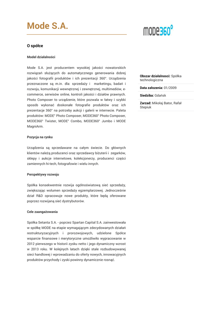 Mode S.A. O spółce Model działalności Mode S.A. jest producentem wysokiej jakości nowatorskich rozwiązań służących do automatycznego generowania dobrej jakości fotografii produktów i ich prezentacji 360°. Urządzenia przeznaczone są m.in. dla: sprzedaży i marketingu, badań i rozwoju, komunikacji wewnętrznej i zewnętrznej, multimediów, e- Data załozenia: 01/2009 commerce, serwisów online, kontroli jakości i działów prawnych. Siedziba: Gdańsk Photo Composer to urządzenie, które pozwala w łatwy i szybki sposób wykonać doskonałe fotografie produktów oraz ich prezentacje 360° na potrzeby aukcji i galerii w internecie. Paleta produktów: MODE° Photo Composer, MODE360° Photo Composer, MODE360° Twister, MODE° Combo, MODE360° Jumbo i MODE MagniArm. Pozycja na rynku Urządzenia są sprzedawane na całym świecie. Do głównych klientów należą producenci oraz sprzedawcy biżuterii i zegarków, sklepy i aukcje internetowe, kolekcjonerzy, producenci części zamiennych hi-tech, fotografowie i wielu innych. Perspektywy rozwoju Spółka konsekwentnie rozwija ogólnoświatową sieć sprzedaży, zwiększając wolumen sprzedaży egzemplarzowej. Jednocześnie dział R&D opracowuje nowe produkty, które będą oferowane poprzez rozwijaną sieć dystrybutorów. Cele zaangażowania Spółka Setanta S.A. - poprzez Spartan Capital S.A. zainwestowała w spółkę MODE na etapie wymagającym zdecydowanych działań restrukturyzacyjnych i prorozwojowych, udzielone Spółce wsparcie finansowe i merytoryczne umożliwiło wypracowanie w 2012 pierwszego w historii zysku netto i jego dynamiczny wzrost w 2013 roku. W kolejnych latach dzięki stale rozbudowywanej sieci handlowej i wprowadzaniu do oferty nowych, innowacyjnych produktów przychody i zyski powinny dynamicznie rosnąć. Powered by TCPDF (www.tcpdf.org) Obszar działalnosci: Spółka technologiczna Zarzad: Mikołaj Bator, Rafał Stepiuk