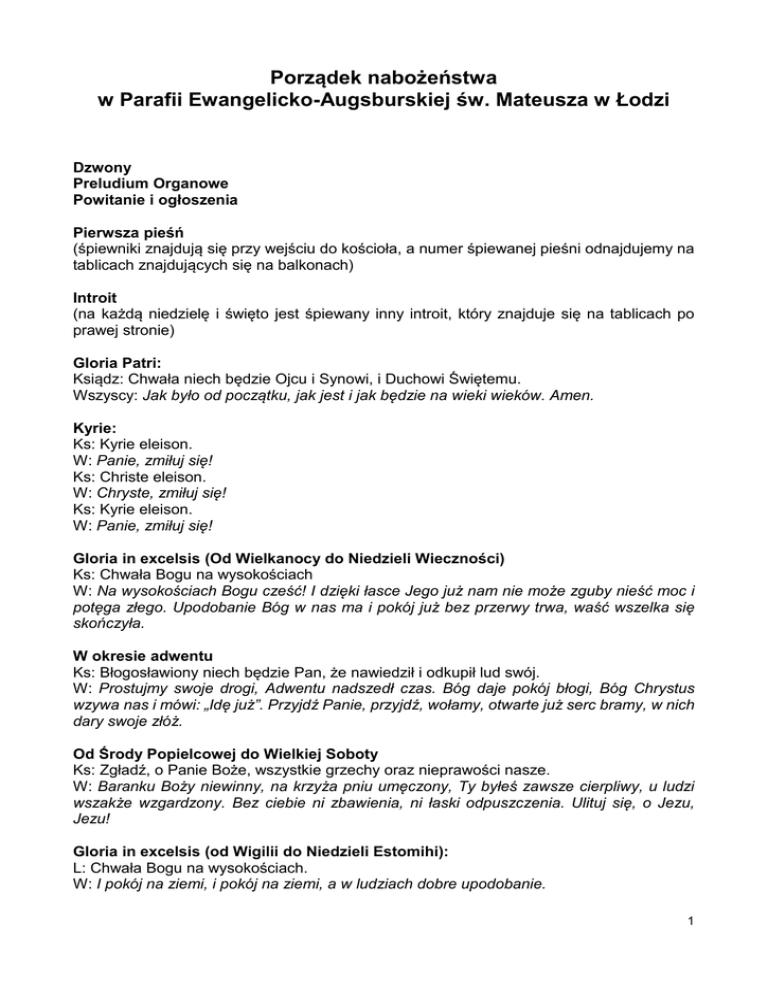 Porządek nabożeństwa w Parafii Ewangelicko-Augsburskiej św. Mateusza w Łodzi Dzwony Preludium Organowe Powitanie i ogłoszenia Pierwsza pieśń (śpiewniki znajdują się przy wejściu do kościoła, a numer śpiewanej pieśni odnajdujemy na tablicach znajdujących się na balkonach) Introit (na każdą niedzielę i święto jest śpiewany inny introit, który znajduje się na tablicach po prawej stronie) Gloria Patri: Ksiądz: Chwała niech będzie Ojcu i Synowi, i Duchowi Świętemu. Wszyscy: Jak było od początku, jak jest i jak będzie na wieki wieków. Amen. Kyrie: Ks: Kyrie eleison. W: Panie, zmiłuj się! Ks: Christe eleison. W: Chryste, zmiłuj się! Ks: Kyrie eleison. W: Panie, zmiłuj się! Gloria in excelsis (Od Wielkanocy do Niedzieli Wieczności) Ks: Chwała Bogu na wysokościach W: Na wysokościach Bogu cześć! I dzięki łasce Jego już nam nie może zguby nieść moc i potęga złego. Upodobanie Bóg w nas ma i pokój już bez przerwy trwa, waść wszelka się skończyła. W okresie adwentu Ks: Błogosławiony niech będzie Pan, że nawiedził i odkupił lud swój. W: Prostujmy swoje drogi, Adwentu nadszedł czas. Bóg daje pokój błogi, Bóg Chrystus wzywa nas i mówi: „Idę już”. Przyjdź Panie, przyjdź, wołamy, otwarte już serc bramy, w nich dary swoje złóż. Od Środy Popielcowej do Wielkiej Soboty Ks: Zgładź, o Panie Boże, wszystkie grzechy oraz nieprawości nasze. W: Baranku Boży niewinny, na krzyża pniu umęczony, Ty byłeś zawsze cierpliwy, u ludzi wszakże wzgardzony. Bez ciebie ni zbawienia, ni łaski odpuszczenia. Ulituj się, o Jezu, Jezu! Gloria in excelsis (od Wigilii do Niedzieli Estomihi): L: Chwała Bogu na wysokościach. W: I pokój na ziemi, i pokój na ziemi, a w ludziach dobre upodobanie. 1 Kolekta (modlitwa księdza) Salutatio: L: Pan niech będzie z wami! W: I z duchem twoim! Czytania Pisma Świętego Nicejsko-Konstantynopolitańskie Wyznanie Wiary (w Święta i nabożeństwa ze Spowiedzią i Komunią Św. W pozostałe niedziele zmawiamy Apostolskie Wyznanie Wiary): Wierzę w jedynego Boga, Ojca wszechmogącego, Stworzyciela nieba i ziemi, wszystkich rzeczy widzialnych i nie widzialnych. I w jedynego Pana Jezusa Chrystusa, Syna Bożego Jednorodzonego, który z Ojca jest zrodzony przed wszystkimi wiekami. Bóg z Boga, Światłość ze Światłości. Bóg prawdziwy z Boga prawdziwego. Zrodzony, a nie stworzony, współistotny Ojcu, a przez Niego wszystko się stało. On to dla nas ludzi i dla naszego zbawienia zstąpił z nieba. I za sprawą Ducha Świętego przyjął ciało z Marii Panny i stał się człowiekiem. Ukrzyżowany również za nas, pod Poncjuszem Piłatem został umęczony i pogrzebany. I zmartwychwstał dnia trzeciego, jak oznajmia Pismo. I wstąpił do nieba; siedzi po prawicy Ojca. I powtórnie przyjdzie w chwale sądzić żywych i umarłych, a Królestwu Jego nie będzie końca. Wierzę w Ducha Świętego, Pana i Ożywiciela, Który od Ojca i Syna pochodzi. Który z Ojcem i Synem wspólnie odbiera uwielbienie i chwałę; Który mówił przez Proroków. Wierzę w jeden święty, powszechny i apostolski Kościół. Wyznaję jeden chrzest na odpuszczenie grzechów. I oczekuję wskrzeszenia umarłych. I życia wiecznego w przyszłym świecie. Amen. Pieśń Kazanie Pieśń Spowiedź Ks. Spowiadajmy się Panu Bogu naszemu tak się modląc: Wszechmogący Boże, miłosierny Ojcze! Ja biedny, nędzny, grzeszny człowiek wyznaję przed Tobą wszystkie grzechy i przewinienia moje, popełnione myślą, mową i uczynkiem, którymi zasłużyłem na Twe doczesne i wieczne kary. Żałuję za nie szczerze i z całego serca i proszę Cię dla niezgłębionego miłosierdzia Twego i dla niewinnej i gorzkiej męki i śmierci umiłowanego Syna Twego Jezusa Chrystusa, bądź mnie niegodnemu grzesznemu człowiekowi łaskaw i miłościw, odpuść mi wszystkie grzechy moje i dopomóż łaskawie przez moc Ducha Twego Świętego do poprawy życia mego. AMEN Ks: Przed obliczem wszechmogącego Boga pytam się każdego z was: czy żałujesz za grzechy swoje? Odpowiedz: żałuję. Ks: Czy wierzysz w odpuszczenie grzechów i pojednanie z Bogiem przez Jezusa Chrystusa? Odpowiedz: wierzę. Ks: Czy pragniesz z pomocą Ducha Świętego poprawić życie swoje? Odpowiedz: pragnę. 2 Ks: Tak rzekł Pan nasz Jezus Chrystus do swoich apostołów: Którymkolwiek grzechy odpuścicie, są im odpuszczone, którymkolwiek zatrzymacie, są im zatrzymane. Przeto jako powołany i ustanowiony sługa Jezusa Chrystusa i Jego świętej Ewangelii zwiastuję wszystkim pokutującym łaskę Bożą i odpuszczam wam w miejsce Chrystusa grzechy wasze w imię Ojca i Syna i Ducha Świętego. Błogosław duszo moja Panu i wszystko co jest we mnie imieniu Jego świętemu, błogosław duszo moja Panu a nie zapominaj wszystkich dobrodziejstw Jego. AMEN Boży Pokój niech będzie z wami wszystkimi. AMEN Liturgia Komunijna Ks: Módlmy się: Boże Ojcze, który dałeś nam Jezusa Chrystusa i chcesz, abyśmy z Nim cierpieli i umarli i z Nim do chwały wzniesieni zostali, - oto my, z prochu wzięci i grzechowi podlegli, przynosimy dary Twoje, chleb i wino, i prosimy Cię, poświęć je i poświęć serca nasze. Spraw abyśmy prawdziwie ukorzyli się, w tych oto darach Twoich ciało i krew Syna Twego, Baranka niewinnego, spożyli, z Jego śmiercią i zmartwychwstaniem zespolili się i wstali do nowego życia. W: Święty Boże! Święty Mocny! Święty a Nieśmiertelny! Zmiłuj się nad nami. Ks. Pan niech będzie z nami! W: I z duchem Twoim! Ks. Wznieście swe serca! W: Wznosimy je do Pana. Ks. Dziękujmy Panu, Bogu naszemu. W: Słuszną to i sprawiedliwą jest rzeczą. Ks. Zaprawdę godną i słuszną, sprawiedliwą i zbawienną jest rzeczą, abyśmy Tobie, święty Ojcze, wszechmogący Panie, wiekuisty Boże, zawsze i na każdym miejscu dziękowali przez Jezusa Chrystusa Pana naszego, dla którego jesteś nam łaskawy, odpuszczasz grzechy i udzielasz zbawienia wiecznego. Dlatego 