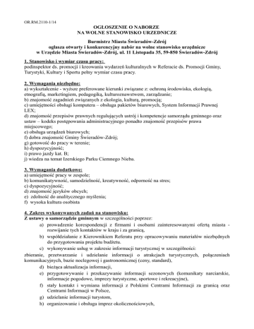 OR.RM.2110-1/14 OGŁOSZENIE O NABORZE NA WOLNE STANOWISKO URZEDNICZE Burmistrz Miasta Świeradów-Zdrój ogłasza otwarty i konkurencyjny nabór na wolne stanowisko urzędnicze w Urzędzie Miasta Świeradów-Zdrój, ul. 11 Listopada 35, 59-850 Świeradów-Zdrój 1. Stanowisko i wymiar czasu pracy: podinspektor ds. promocji i kreowania wydarzeń kulturalnych w Referacie ds. Promocji Gminy, Turystyki, Kultury i Sportu pełny wymiar czasu pracy. 2. Wymagania niezbędne: a) wykształcenie - wyższe preferowane kierunki związane z: ochroną środowiska, ekologią, etnografią, marketingiem, pedagogiką, kulturoznawstwem, zarządzanie; b) znajomość zagadnień związanych z ekologia, kulturą, promocją; c) umiejętności obsługi komputera – obsługa pakietów biurowych, System Informacji Prawnej LEX; d) znajomość przepisów prawnych regulujących ustrój i kompetencje samorządu gminnego oraz ustaw – kodeks postępowania administracyjnego ponadto znajomość przepisów prawa miejscowego; e) obsługa urządzeń biurowych; f) dobra znajomość Gminy Świeradów-Zdrój; g) gotowość do pracy w terenie; h) dyspozycyjność; i) prawo jazdy kat. B; j) wiedza na temat Izerskiego Parku Ciemnego Nieba. 3. Wymagania dodatkowe: a) umiejętność pracy w zespole; b) komunikatywność, samodzielność, kreatywność, odporność na stres; c) dyspozycyjność; d) znajomość języków obcych; e) zdolność do analitycznego myślenia; f) wysoka kultura osobista 4. Zakres wykonywanych zadań na stanowisku: Z ustawy o samorządzie gminnym w szczególności poprzez: a) prowadzenie korespondencji z firmami i osobami zainteresowanymi ofertą miasta rozwijanie tych kontaktów w kraju i za granicą, b) współdziałanie z Kierownikiem Referatu przy opracowywaniu materiałów niezbędnych do przygotowania projektu budżetu. c) wykonywanie usług w zakresie informacji turystycznej w szczególności: zbieranie, przetwarzanie i udzielanie informacji o atrakcjach turystycznych, połączeniach komunikacyjnych, bazie noclegowej i gastronomicznej (ceny, standard), d) bieżąca aktualizacja informacji, e) przygotowywanie i przekazywanie informacji sezonowych (komunikaty narciarskie, informacje pogodowe, imprezy turystyczne, sportowe i rekreacyjne), f) stały kontakt i wymiana informacji z Polskimi Centrami Informacji za granicą oraz Centrami Informacji w Polsce, g) udzielanie informacji turystom, h) organizowanie i obsługa imprez okolicznościowych, i) przygotowywanie i opracowywanie materiałów promocyjnych, w tym: wydawnictwa własne polskie i zagraniczne, materiały miejscowe tj. teksty, zdjęcia, wydawnictwa zewnętrzne – przygotowanie i nadzór merytoryczny, j) opracowywanie i druk informatorów praktycznych, ulotek reklamowych, wysyłanie materiałów promocyjnych zainteresowanym osobom i firmom, k) współtworzenie i obsługa oficjalnej strony internetowej miasta, l) sporządzanie projektów wynikających z zakresu zajmowanego stanowiska: Zarządzeń Burmistrza Miasta, Uchwał Rady Miasta, Kart Informacyjnych itp., m) w ciągu 3 dni roboczych po odbyciu szkolenia, upowszechnienie zdobytej wiedzy w formie instruktażu pozostałym pracownikom Referatu. n) pozyskiwanie środków zewnętrznych na wszelkie działania, prowadzenie projektów nieinwestycyjnych, sporządzanie i nadzór nad sporządzaniem projektów aplikujących o dofinansowanie z budżetu UE i innych źródeł z zakresu działania Referatu, o) współpracę z prasą , radiem i TV: - przygotowanie i wysyłanie serwisów informacyjnych oraz innych zamówionych przez media materiałów niezbędnych do konkretnych publikacji, artykułów czy relacji, - opracowywanie programu pobytów i scenariuszy dla ekip radiowych i telewizyjnych realizujących materiały o Świeradowie-Zdroju, - koordynowanie tych działań poprzez zdobywanie sponsorów i załatwianie formalności z różnorodnymi instytucjami i służbami miejskimi, p) administrowanie pomieszczeniami, terenem i sprzętami powierzonymi do obsługi (zabezpieczenie mienia, wnioskowanie o drobne naprawy i remonty, oznakowanie itp.), q) promocja działalności Centrum Edukacji Ekologicznej Natura 2000 "Izerska Łąka", ze szczególnym uwzględnieniem szkół podstawowych, gimnazjalnych i ponadgimnazjalnych, r) organizowanie i przeprowadzanie zajęć, szkoleń, spotkań, konferencji, warsztatów, jarmarków - związanych z działalnością Centrum Edukacji Ekologicznej Natura 2000 "Izerska Łąka", s) współpraca ze środowiskami naukowymi, instytucjami, organizacjami i osobami zajmującymi się tematyką związaną z działalnością Centrum Edukacji Ekologicznej Natura 2000 "Izerska Łąka", Z ustawy kodeks postępowania administracyjnego w szczególności poprzez udzielanie wyjaśnień w ramach skarg i wniosków wpływających do Burmistrza, a wynikających z zakresu czynności na zajmowanym stanowisku. Z ustawy o dostępie do informacji publicznej w szczególności poprzez: a) publikację informacji publicznej w Biuletynie Informacji Publicznej Urzędu Miasta Świeradów-Zdrój w zakresie zajmowanego stanowiska pracy, w szczególności: • „Ogłoszeń”, • „Poradnika klienta (jak załatwić sprawę?) itp., b) sporządzanie projektu odpowiedzi na wnioski wpływające do Burmistrza Miasta w sprawach wynikających z zakresu czynności. Z Instrukcji Kancelaryjnej w szczególności poprzez: c) prowadzenie spraw w systemie informatycznym, d) przechowywanie akt i archiwizację dokumentów wytworzonych na danym stanowisku pracy, e) obsługa poczty elektronicznej. Z ustawy o rachunkowości w szczególności poprzez kontrolę dokumentów księgowych (faktur, rachunków) pod względem merytorycznym poprzez stwierdzenie rzetelności ich danych. Z ustawy o finansach publicznych, w szczególności poprzez sporządzanie umów i nadzór nad ich realizacją, zgodnie z zasadami wynikającymi z ww. przepisów i uregulowaniami wewnętrznymi Urzędu. Z ustawy o Narodowym Planie Rozwoju, w szczególności 