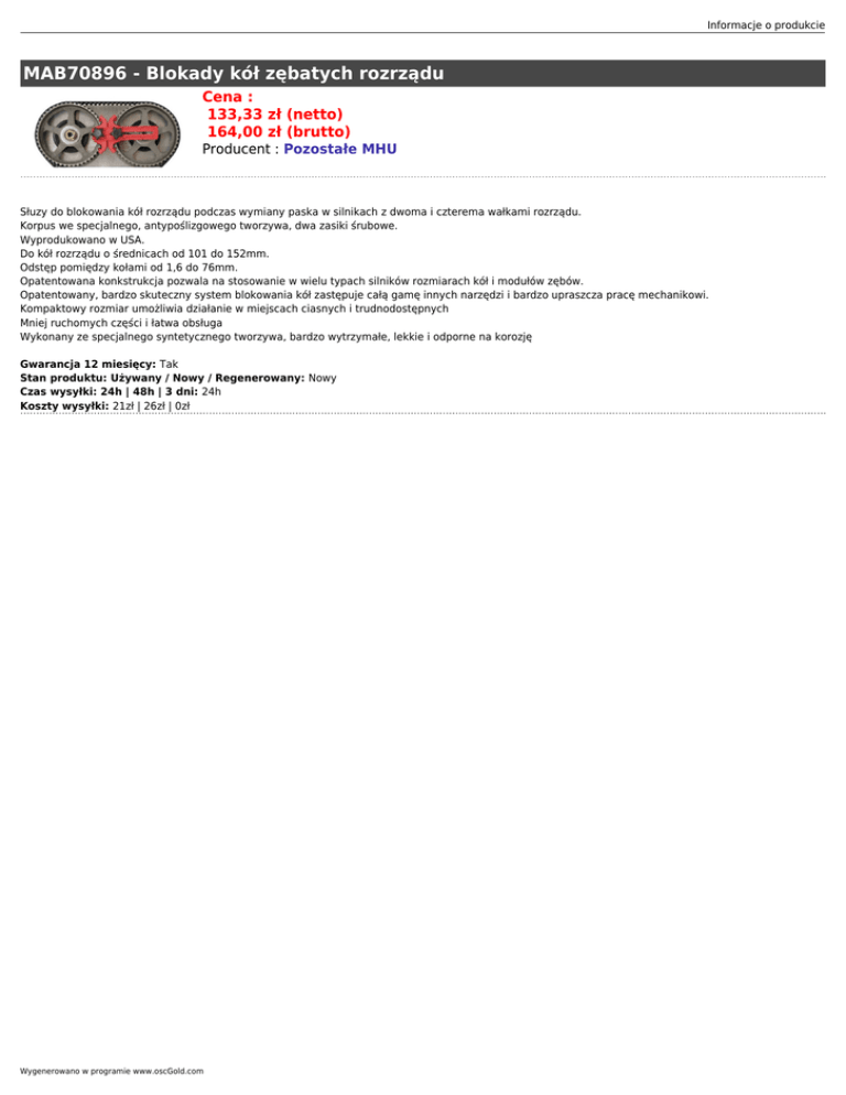 Informacje o produkcie MAB70896 - Blokady kół zębatych rozrządu Cena : 133,33 zł (netto) 164,00 zł (brutto) Producent : Pozostałe MHU Słuzy do blokowania kół rozrządu podczas wymiany paska w silnikach z dwoma i czterema wałkami rozrządu. Korpus we specjalnego, antypoślizgowego tworzywa, dwa zasiki śrubowe. Wyprodukowano w USA. Do kół rozrządu o średnicach od 101 do 152mm. Odstęp pomiędzy kołami od 1,6 do 76mm. Opatentowana konkstrukcja pozwala na stosowanie w wielu typach silników rozmiarach kół i modułów zębów. Opatentowany, bardzo skuteczny system blokowania kół zastępuje całą gamę innych narzędzi i bardzo upraszcza pracę mechanikowi. Kompaktowy rozmiar umożliwia działanie w miejscach ciasnych i trudnodostępnych Mniej ruchomych części i łatwa obsługa Wykonany ze specjalnego syntetycznego tworzywa, bardzo wytrzymałe, lekkie i odporne na korozję Gwarancja 12 miesięcy: Tak Stan produktu: Używany / Nowy / Regenerowany: Nowy Czas wysyłki: 24h | 48h | 3 dni: 24h Koszty wysyłki: 21zł | 26zł | 0zł Wygenerowano w programie www.oscGold.com