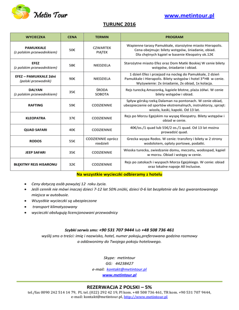 Metin Tour www.metintour.pl TURUNC 2016 WYCIECZKA CENA TERMIN PROGRAM PAMUKKALE (z polskim przewodnikiem) 50€ CZWARTEK PIĄTEK Wapienne tarasy Pamukkale, starożytne miasto Hierapolis. Cena obejmuje: bilety wstępów, śniadanie, obiad. Dla chętnych kąpiel w basenie Kleopatry ok.12€ EFEZ (z polskim przewodnikiem) 58€ NIEDZIELA Starożytne miasto Efez oraz Dom Matki Boskiej W cenie bilety wstępów, śniadanie i obiad. EFEZ – PAMUKKALE 2dni (polski przewodnik) 90€ NIEDZIELA 1 dzień Efez i przejazd na nocleg do Pamukkale, 2 dzień Pamukkale i Hierapolis. Bilety wstępów i hotel 3*HB w cenie. Wyżywienie: 2x śniadanie, 2x obiad, 1x kolacja. DALYAN (z polskim przewodnikiem) 35€ ŚRODA SOBOTA Rejs turecką Amazonką, kąpiele błotne, plaża żółwi. W cenie bilety wstępów i obiad. RAFTING 59€ CODZIENNIE Spływ górską rzeką Dalaman na pontonach. W cenie obiad, ubezpieczenie od sportów ekstremalnych, instruktorzy, sprzęt: wiosła, kaski, kapoki. Od 13 lat. KLEOPATRA 37€ CODZIENNIE Rejs po Morzu Egejskim na wyspę Kleopatry. Bilety wstępów i obiad w cenie. QUAD SAFARI 40€ CODZIENNIE 40€/os./1 quad lub 55€/2 os./1 quad. Od 13 lat można prowadzić quad. RODOS 55€ CODZIENNIE oprócz niedzieli Grecka wyspa Rodos. W cenie: transfery i bilety w 2 strony wodolotem, opłaty portowe, podatki. JEEP SAFARI 35€ CODZIENNIE Wioska turecka, zwiedzanie domu, meczetu, wodospad, kąpiel w morzu. Obiad i wstępy w cenie. BŁĘKITNY REJS HISARONU 32€ CODZIENNIE Rejs po zatokach i wyspach Morza Egejskiego. W cenie: obiad oraz lokalne napoje All Inclusive. Na wszystkie wycieczki odbieramy z hotelu Ceny dotyczą osób powyżej 12 roku życia. Jeśli cennik nie mówi inaczej dzieci 7-12 lat 50% zniżki, dzieci 0-6 lat bezpłatnie ale bez gwarantowanego miejsca w autobusie. Wszystkie wycieczki są ubezpieczone transport klimatyzowany wycieczki obsługują licencjonowani przewodnicy Szybki serwis sms: +90 531 707 9444 lub +48 508 736 461 wyślij sms o treści: imię i nazwisko, hotel, numer pokoju,preferowana godzina rozmowy a oddzwonimy do Twojego pokoju hotelowego. Skype: metintour GG: 44238427 e-mail: [email protected] www.metintour.pl REZERWACJA Z POLSKI – 5% tel./fax 0090 242 514 14 79, PL tel. (022) 292 42 19, Pl kom. +48 508 736 461, TR kom. +90 531 707 9444, e-mail: [email protected], http://www.metintour.pl