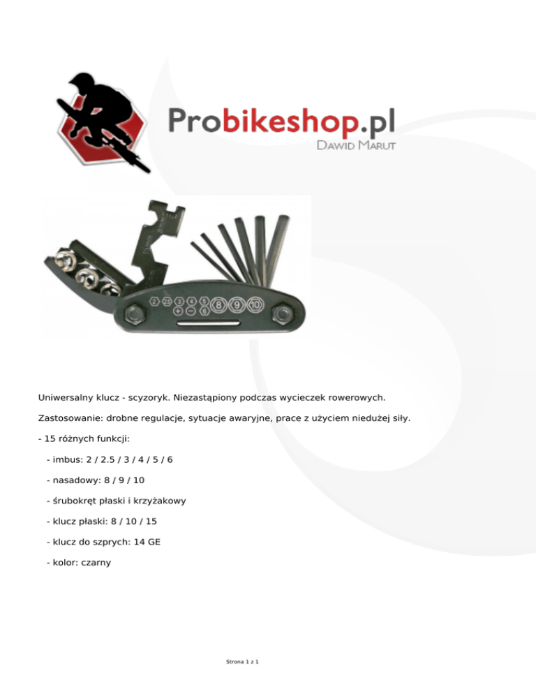 Uniwersalny klucz - scyzoryk. Niezastąpiony podczas wycieczek rowerowych. Zastosowanie: drobne regulacje, sytuacje awaryjne, prace z użyciem niedużej siły. - 15 różnych funkcji: - imbus: 2 / 2.5 / 3 / 4 / 5 / 6 - nasadowy: 8 / 9 / 10 - śrubokręt płaski i krzyżakowy - klucz płaski: 8 / 10 / 15 - klucz do szprych: 14 GE - kolor: czarny Strona 1 z 1