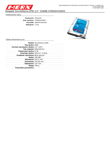 PRZEDSIĘBIORSTWO HANDLOWO USŁUGOWE MERX D. MIGACZ, K. PORĘBA SP.J. ul. Nawojowska 88B 33-330 NOWY SĄCZ Seagate Surveillance 8TB 3,5'' 256MB ST8000VX0002 Podstawowe Dane Producent: SEAGATE Kod vendora: ST8000VX0002 Kod EAN: ABEAN-DH42207 Rękojmia: 3 lata Tabela Parametryczna Model: Surveillance HDD Typ dysku: HDD Format szerokości dysku: 3,5'' (LFF) Typ napędu: Wewnętrzny Pojemność dysku: 8 TB Interfejs dysku: SATA III - 6 Gb/s Prędkość obrotowa: Brak danych Bufor: 256 MB Wysokość: 26.11 mm Szerokość: 101.85 mm Głębokość: 147 mm Waga: 780 g Pozostałe parametry: Powered by TCPDF (www.tcpdf.org)