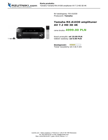 Karta produktu Yamaha Yamaha RX-A1030 amplituner AV 7.2 HD 3D 4K Nr katalogowy: RX-A1030 Producent: Yamaha Yamaha RX-A1030 amplituner AV 7.2 HD 3D 4K cena brutto: 4999.00 PLN Koszt przesyłki: od 19.00 PLN Odbiór osobisty: od 0.00 PLN Dostępność: Towar wysyłamy od 2 do 5 dni rzutniki.com - Salon projekcji ul. Pokorna 2 / U6,U7 00-199 Warszawa tel. (22) 530 63 50 | e-mail: [email protected] Stan z dnia 08-03-2017, godz. 20:20 | Strona 1 z 1
