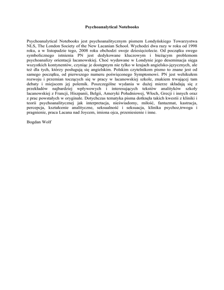 Psychoanalytical Notebooks Psychoanalytical Notebooks jest psychoanalitycznym pismem Londyńskiego Towarzystwa NLS, The London Society of the New Lacanian School. Wychodzi dwa razy w roku od 1998 roku, a w listopadzie tego, 2008 roku obchodzi swoje dziesięciolecie. Od początku swego symbolicznego istnienia PN jest dedykowane kluczowym i bieżącym problemom psychoanalizy orientacji lacanowskiej. Choć wydawane w Londynie jego deseminacja sięga wszystkich kontynentów, czyniąc je dostępnym nie tylko w krajach angielsko-języcznych, ale też dla tych, którzy posługują się angielskim. Polskim czytelnikom pismo to znane jest od samego początku, od pierwszego numeru poświęconego Symptomowi. PN jest wehikułem rozwoju i przemian toczących się w pracy w lacanowskiej szkole, znakiem trwającej tam debaty i miejscem jej polemik. Poszczególne wydania w dużej mierze składają się z przekładów najbardziej wpływowych i interesujących tekstów analityków szkoły lacanowskiej z Francji, Hiszpanii, Belgii, Ameryki Południowej, Włoch, Grecji i innych oraz z prac powstałych w oryginale. Dotychczas tematyka pisma dotknęła takich kwestii z kliniki i teorii psychoanalitycznej jak interpretacja, nieświadomy, miłość, fantazmat, kastracja, percepcja, kształcenie analityczne, seksualność i seksuacja, klinika psychoz,trwoga i pragnienie, praca Lacana nad Joycem, imiona ojca, przeniesienie i inne. Bogdan Wolf
