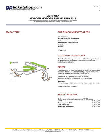 Strona 1 6 LISTY CEN MOTOGP MOTOGP SAN MARINO 2017 Ta lista została utworzona na 07.03.2017 (01:26) i pokazuje ceny i towar dostępny w tym momencie. Na aktualną listę cen proszę odwiedź naszą stronę na www.gpticketshop.com MAPA TORU PODSUMOWANIE WYDARZEń WYDARZENIE: MotoGP MotoGP San Marino TOR: Autodomo di Santamonica BLISKO: Misano DATA: 10.09.2017 SZCZEGółY ZAMóWIENIA Kontrola odbędzie się skanerem. Klienci są upoważnieni do wstępu i opuszczenia toru tylko 2 razy, potem bilet zostanie unieważniony! DZIECI Children under 12 years (born after 01/01/2005) are allowed to access the race, if accompanied by a paying adult until the circuit max capacity has not been reached. Meadow: € 1,00 per day or € 3,00 for 3 days Grandstand: € 5,00 per day or € 10,00 for 2 days Attention: The under age child ID card must be shown at the entrance. Except for Central Grid View KOSZTY WYSYłKI Bilety wysłane i ubezpieczone przez UPS Express w UE: EUR 15,00 Europe poza UE: EUR 21,00 USA i Kanada: EUR 21,00 wszystkie inne kraje: EUR 31,00 Alfred Ostermann GesmbH. | Heiligenstädterstr. 31, Stiege 1, Top 702 | A-1190 Wiedeń | Tel: + 43 1 796 94 90 | Fax: +43 1 796 94 90 88 | E-mail: [email protected] z Strona 2 6 PRZEDSPRZEDAż WAżNA DO: 2017-05-10 BILETY NA TRYBUNę Brutapela 2 Sob. EUR 77,00 Brutapela 2 Ndz. EUR 168,00 Brutapela 2 Sob./Ndz. EUR 192,00 Tribuna A Prio 2 Sob. EUR 77,00 Tribuna C Prio 2 Sob. EUR 77,00 Tribuna D-Top Prio 2 Sob. EUR 77,00 Tribuna Misanino Prio 2 Sob. EUR 77,00 Tribuna A Prio 2 Ndz. EUR 210,00 Tribuna C Prio 2 Ndz. EUR 210,00 Tribuna D-Top Prio 2 Ndz. EUR 186,00 Tribuna Misanino Prio 2 Ndz. EUR 216,00 Trib. A Prio 2 Sob./Ndz. EUR 234,00 Trib. C Prio 2 Sob./Ndz. EUR 234,00 Trib. D-Top Prio 2 Sob./Ndz. EUR 210,00 Tribuna Misaninio Prio 2 Sob./Ndz. EUR 240,00 Central Grid View Prio 2 Pt. EUR 43,00 Central Grid View Prio 2 Sob. EUR 106,00 Central Grid View Prio 2 Ndz. EUR 270,00 Central Grid View Prio 2 Sob./Ndz. EUR 294,00 Tribüne Child 0-12 J/day Dziecko Ndz. EUR 5,00 Tribüne Child 0-12 J/Sa+So Dziecko Sob./Ndz. EUR 10,00 Tribuna B Prio 2 Sob. EUR 77,00 wysprzedane Tribuna D Prio 2 Sob. EUR 77,00 wysprzedane Trib. Brutapela Prio 2 Sob. EUR 77,00 wysprzedane Tribuna B Prio 2 Ndz. EUR 210,00 wysprzedane Tribuna D Prio 2 Ndz. EUR 150,00 wysprzedane Trib. D ParkBike Prio 2 Ndz. EUR 150,00 wysprzedane Trib. Brutapela Prio 2 Ndz. EUR 156,00 wysprzedane Trib. D Prio 2 Sob./Ndz. EUR 174,00 wysprzedane D Park.Bike Prio 2 Sob./Ndz. EUR 174,00 wysprzedane Trib. B Prio 2 Sob./Ndz. EUR 234,00 wysprzedane Trib. Brutap. Prio 2 Sob./Ndz. EUR 180,00 wysprzedane Trib. Bruta GOLD Prio 2 Sob. EUR 77,00 wysprzedane Trib. Bruta GOLD Prio 2 Ndz. EUR 186,00 wysprzedane Trb. Bruta GOLD Prio 2 Sob./Ndz. EUR 210,00 wysprzedane Alfred Ostermann GesmbH. | Heiligenstädterstr. 31, Stiege 1, Top 702 | A-1190 Wiedeń | Tel: + 43 1 796 94 90 | Fax: +43 1 796 94 90 88 | E-mail: [email protected] z Strona 3 6 Wszystkie ceny dodatkowo 5% opłaty manipulacyjnej BILETY NA MIEJSCA STOJąCE GA + Stands Prio 2 Pt. EUR 31,00 GA+Stands Prio 2 Dziecko / Zniżka Pt. EUR 23,00 Prato 1+2 Prio 2 Sob. EUR 48,00 Prato 1+2 Prio 2 Dziecko / Zniżka Sob. EUR 39,00 Prato 1+2 Prio 2 Ndz. EUR 90,00 Prato 1+2 Prio 2 Dziecko / Zniżka Ndz. EUR 70,00 Prato 1+2 Prio 2 Weekend EUR 140,00 Prato 1+2+3 Child 0-12 J/day Dziecko Ndz. EUR 1,00 EUR 3,00 Prato 1+2+3 Child 0-12 J/Woe Dziecko Weekend Wszystkie ceny dodatkowo 5% opłaty manipulacyjnej MOTOGP VIP VILLAGE ™ VIP Village San Marino Ndz. EUR 1.150,00 VIP Village San Marino Sob./Ndz. EUR 1.315,00 Wszystkie ceny dodatkowo 5% opłaty manipulacyjnej Alfred Ostermann GesmbH. | Heiligenstädterstr. 31, Stiege 1, Top 702 | A-1190 Wiedeń | Tel: + 43 1 796 94 90 | Fax: +43 1 796 94 90 88 | E-mail: [email protected] z Strona 4 6 Wszystkie ceny dodatkowo 5% opłaty manipulacyjnej MOTOGP VIP VILLAGE ™ Przyjedź i zasmakuj szybkości, hałasu i emocji MotoGP z najlpeszych miejsc widokowych na wyścigi i akcje. Naljepsze miejsce, niepobity widok, wyłączne przywileje… Sytuacja w samym sercu VIP Village daje ci możliwość być tak blisko jak to tylko możliwe, aby kibicować motocyklowemu Grand Prix. Komfortowa i luksusowa atmosfera ekskluzywnego serwisu, oferująca unikalną i uprzywilejowaną lokację. Wyborowa kuchnia, darmowy bar, najlepsza jakość… Kluczem do sukcesu jest “nieporównywalna uwaga do szczególów”. Wyrafinowany catering z doskonałą kuchnią, zawste świeżo przygotowaną pomysłem na show z gotowania, da tobie i twoim gościom maksymalną satysfakcę cały dzień. Możesz zarezerwować VIP Village Private Area (obszar prywatny) z minimalną liczbą wejść na każde GP, włacznie z wszystkimi usługami i możliwością wybrania koloru dywanu, nakrycia stołu i kwiatów za dodatkową opłatą. Mniejsze grupy będą umiejscowione przy stole z nazwą firmy w obszarze loży VIP Village Lounge Area. OPIS WLICZONYCH USłUG Parking VIP Village Wyłączne miejsca parkingowe są ulokowane w pobliżu. Samochody: Ratio Parking Pass na gości 1:4 (parking 1 : bilety VIP Village 4) Doskonałe widoki Zależnie od ulokowania VIP Village, albo z tarasu na dachu Pitu albo z prywatnej trybuny. Luksusowe Markizy Markizy i suity VIP Village są wyposażone w pasujący dywan, pościel, komfortowe meble i klimatyzację. Buffet breakfast on Saturday & Sunday Szeroki wybów rogalików, pieczywa, płatków do mleka, zimnego mięsa, różnych dań jajecznych, kawy, herbaty i soków owocowych jest serwowanych w bufecie. Gourmet lunch on Saturday & Sunday Specjalnie wybrany starter będzie serwowany przy stołach. Wybór różnych gorących dań głównych jest przygotowany w trakcie pokazowego gotowania w postaci bufetu. Następnie podany do stołu zostanie smakowity deser. Wyśmietnity bufet popołudniowy Bufet owoców, ciast, Petit Fours i sera będzie przygotowany po lunchu. Darmowy bar z kawą i napojami Bar czynny jest cały dzień i oferuje doskonały wybór