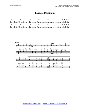 Laudate Dominum Schola młodzieżowa „In Te confido” przy parafii p.w. Zesłania Ducha Świętego Laudate Dominum a E a G C G a FdE Laudate Dominum, laudate Dominum, omnes gentes, alleluia ! a E a G C G a dE a Laudate Dominum, laudate Dominum, omnes gentes, alleluia ! www.duchswiety.org www.schola-mlodziezowa.pl