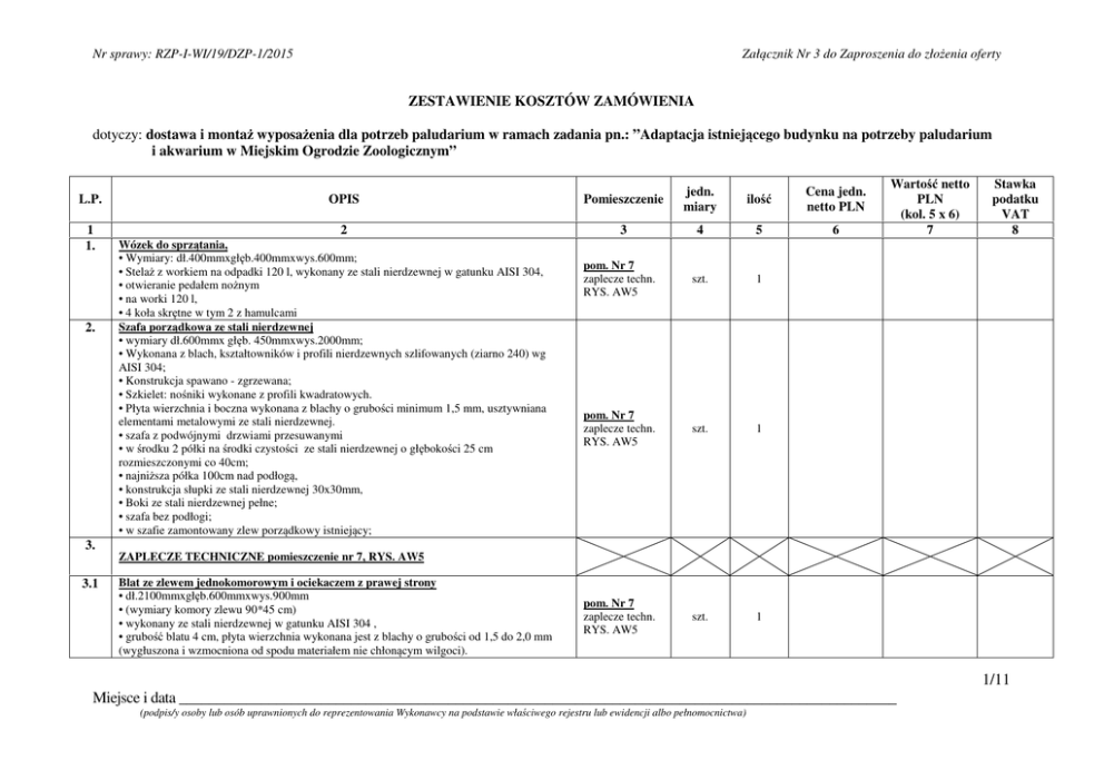 Nr sprawy: RZP-I-WI/19/DZP-1/2015 Załącznik Nr 3 do Zaproszenia do złożenia oferty ZESTAWIENIE KOSZTÓW ZAMÓWIENIA dotyczy: dostawa i montaż wyposażenia dla potrzeb paludarium w ramach zadania pn.: ”Adaptacja istniejącego budynku na potrzeby paludarium i akwarium w Miejskim Ogrodzie Zoologicznym” L.P. 1 1. 2. 3. 3.1 OPIS Pomieszczenie jedn. miary ilość Cena jedn. netto PLN 2 3 4 5 6 pom. Nr 7 zaplecze techn. RYS. AW5 szt. 1 pom. Nr 7 zaplecze techn. RYS. AW5 szt. 1 pom. Nr 7 zaplecze techn. RYS. AW5 szt. 1 Wózek do sprzątania, • Wymiary: dł.400mmxgłęb.400mmxwys.600mm; • Stelaż z workiem na odpadki 120 l, wykonany ze stali nierdzewnej w gatunku AISI 304, • otwieranie pedałem nożnym • na worki 120 l, • 4 koła skrętne w tym 2 z hamulcami Szafa porządkowa ze stali nierdzewnej • wymiary dł.600mmx głęb. 450mmxwys.2000mm; • Wykonana z blach, kształtowników i profili nierdzewnych szlifowanych (ziarno 240) wg AISI 304; • Konstrukcja spawano - zgrzewana; • Szkielet: nośniki wykonane z profili kwadratowych. • Płyta wierzchnia i boczna wykonana z blachy o grubości minimum 1,5 mm, usztywniana elementami metalowymi ze stali nierdzewnej. • szafa z podwójnymi drzwiami przesuwanymi • w środku 2 półki na środki czystości ze stali nierdzewnej o głębokości 25 cm rozmieszczonymi co 40cm; • najniższa półka 100cm nad podłogą, • konstrukcja słupki ze stali nierdzewnej 30x30mm, • Boki ze stali nierdzewnej pełne; • szafa bez podłogi; • w szafie zamontowany zlew porządkowy istniejący; Wartość netto PLN (kol. 5 x 6) 7 Stawka podatku VAT 8 ZAPLECZE TECHNICZNE pomieszczenie nr 7, RYS. AW5 Blat ze zlewem jednokomorowym i ociekaczem z prawej strony • dł.2100mmxgłęb.600mmxwys.900mm • (wymiary komory zlewu 90*45 cm) • wykonany ze stali nierdzewnej w gatunku AISI 304 , • grubość blatu 4 cm, płyta wierzchnia wykonana jest z blachy o grubości od 1,5 do 2,0 mm (wygłuszona i wzmocniona od spodu materiałem nie chłonącym wilgoci). 1/11 Miejsce i data ________________________________________________________________________________________________ (podpis/y osoby lub osób uprawnionych do reprezentowania Wykonawcy na podstawie właściwego rejestru lub ewidencji albo pełnomocnictwa) Nr sprawy: RZP-I-WI/19/DZP-1/2015 3.2 3.3 3.4 3.5 3.6 • rant z tyłu blatu h=15 cm, • bateria z elastyczną wylewką montowana do blatu. • Blat wykończony jest kołnierzem ochronnym o wysokości 200mm. • Blat z otworem pod baterię. Szafka ze stali nierdzewnej z podwójnymi drzwiami przesuwanymi, • wymiary: dł.1500mmxgłęb.600mmx wys. 850mm; • Konstrukcja spawana, wykonana ze stali nierdzewnej w gatunku AISI 304; • drzwi przesuwane na zespołach jezdnych; • półka wyjmowana, nieprzestawna; • uchwyt drzwi pionowy; • w szafce zamykany pojemnik na odpadki z tworzywa sztucznego z pokrywą zawieszany na drzwiach szafki 20x30x40cm; • nogi z profilu 40x40x1,2mm (+/-5mm) • stopki regulowane (+/- 15mm). Szafka z 4 szufladami • wymiary dł.600mmxgłęb.600mmxwys.850mm; • ( wysokość szuflad : 2*14 cm, 2*ok 20 cm ) • konstrukcja spawana, wykonana ze stali nierdzewnej w gatunku AISI 304; • korpus szafki na nogach ze stali nierdzewnej z możliwością regulacji wysokości; • nogi z profilu 40x40x1,2mm (+/-5mm) • stopki regulowane (+/- 15mm). Blat składany do dołu ze stali nierdzewnej, • wymiary: dł.1400mmxgłęb.400mmxgrubość 40mm; • zawiasy mocowane do ściany. • wysokość blatu po rozłożeniu h =100cm. • Wykonany ze stali nierdzewnej w gatunku AISI 304. • Płyta wierzchnia wykonana jest z blachy o grubości 1,5 lub 2,0 mm (wygłuszona i wzmocniona od spodu materiałem nie chłonącym wilgoci); • konstrukcja blatu po rozłożeniu – opierana na 2 rozkładanych wspornikach o wymiarach 350x70x10 mm, ze stali nierdzewnej, mocowanych do ściany, Zestaw półek wiszących nad blatem • wymiary: dł.1000mmxgłęb.300mmxgrub.600mm; • 3 półki wykonane ze stali nierdzewnej zawieszane na listwach; • listwy stalowe z otworami do montażu półek; • konstrukcja półek umożliwia regulację wysokości; • umocowania płaszczyzn półek co 50 mm; • Konstrukcja wykonana ze stali nierdzewnej w gatunku AISI 304; • Półka wisząca z rantem z tyłu wysokości min 4cm; • Możliwość demontażu półek do czyszczenia i zmiany ich rozstawu; Półka ze stali nierdzewnej montowana do ściany • wymiary: dł.3200mmxgłęb.400mmxgrub.40mm; Załącznik Nr 3 do Zaproszenia do złożenia oferty pom. Nr 7 zaplecze techn. RYS. AW5 szt. 1 pom. Nr 7 zaplecze techn. RYS. AW5 szt. 1 pom. Nr 7 zaplecze techn. RYS. AW5 szt. 1 pom. Nr 7 zaplecze techn. RYS. AW5 szt. 2 pom. Nr 7 zaplecze techn. szt. 2 2/11 Miejsce i data ________________________________________________________________________________________________ (podpis/y osoby lub osób uprawnionych do reprezentowania Wykonawcy na podstawie właściwego rejestru lub ewidencji albo pełnomocnictwa) Nr sprawy: RZP-I-WI/19/DZP-1/2015 3.7 3.8 3.9 • montowana za pomocą 5 stalowych wsporników. • konstrukcja wykonana ze stali nierdzewnej w gatunku AISI 304. • półka posiada z rant z tyłu o wysokości min 4cm Zamrażarka szufladowa • wymiary dł.600mmxgłęb.640mmxwys.min.1800mm; • front i obudowa ze stali nierdzewnej INOX; • poj. Min 300l; • drzwi otwierane na prawą stronę z samodomykaczem z zamkiem; • uchwyt drzwi wykonany z poszycia zewnętrznego drzwi; • sterowanie cyfrowe z wyświetlaczem temperatury, temp. wnętrza -2/+10°C; • przystosowana do pracy w temperaturze otoczenia +43°C; • obieg powietrza wymuszony za pomocą wentylatorów oraz kanałem nawiewnym na tylniej ścianie; • bezobsługowe usuwanie skroplin powstających w czasie rozmrażania; • nogi regulowane nierdzewne; • ekologiczny czynnik chłodniczy; • w wyposażeniu min. 5 rusztów metalowych plastifikowanych z kompletem prowadnic do szuflad zamrażarki; Chłodziar