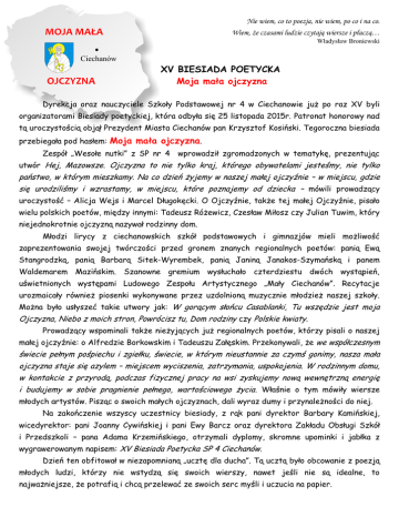 Nie wiem, co to poezja, nie wiem, po co i na co. MOJA MAŁA Wiem, że czasami ludzie czytają wiersze i płaczą… Władysław Broniewski Ciechanów OJCZYZNA XV BIESIADA POETYCKA Moja mała ojczyzna Dyrekcja oraz nauczyciele Szkoły Podstawowej nr 4 w Ciechanowie już po raz XV byli organizatorami Biesiady poetyckiej, która odbyła się 25 listopada 2015r. Patronat honorowy nad tą uroczystością objął Prezydent Miasta Ciechanów pan Krzysztof Kosiński. Tegoroczna biesiada przebiegała pod hasłem: Moja mała ojczyzna. Zespół „Wesołe nutki” z SP nr 4 wprowadził zgromadzonych w tematykę, prezentując utwór Hej, Mazowsze. Ojczyzna to nie tylko kraj, którego obywatelami jesteśmy, nie tylko państwo, w którym mieszkamy. Na co dzień żyjemy w naszej małej ojczyźnie – w miejscu, gdzie się urodziliśmy i wzrastamy, w miejscu, które poznajemy od dziecka – mówili prowadzący uroczystość – Alicja Wejs i Marcel Długokęcki. O Ojczyźnie, także tej małej Ojczyźnie, pisało wielu polskich poetów, między innymi: Tadeusz Różewicz, Czesław Miłosz czy Julian Tuwim, który niejednokrotnie ojczyzną nazywał rodzinny dom. Młodzi lirycy z ciechanowskich szkół podstawowych i gimnazjów mieli możliwość zaprezentowania swojej twórczości przed gronem znanych regionalnych poetów: panią Ewą Stangrodzką, panią Barbarą Sitek-Wyrembek, panią Janiną Janakos-Szymańską i panem Waldemarem Mazińskim. Szanowne gremium wysłuchało czterdziestu dwóch wystąpień, uświetnionych występami Ludowego Zespołu Artystycznego „Mały Ciechanów”. Recytacje urozmaicały również piosenki wykonywane przez uzdolnioną muzycznie młodzież naszej szkoły. Można było usłyszeć takie utwory jak: W gorącym słońcu Casablanki, Tu wszędzie jest moja Ojczyzna, Niebo z moich stron, Powrócisz tu, Dom rodziny czy Polskie kwiaty. Prowadzący wspominali także nieżyjących już regionalnych poetów, którzy pisali o naszej małej ojczyźnie: o Alfredzie Borkowskim i Tadeuszu Załęskim. Przekonywali, że we współczesnym świecie pełnym pośpiechu i zgiełku, świecie, w którym nieustannie za czymś gonimy, nasza mała ojczyzna staje się azylem – miejscem wyciszenia, zatrzymania, uspokojenia. W rodzinnym domu, w kontakcie z przyrodą, podczas fizycznej pracy na wsi zyskujemy nową wewnętrzną energię i budujemy w sobie pragnienie pełnego, wartościowego życia. Właśnie o tym mówiły wiersze młodych artystów. Pisząc o swoich małych ojczyznach, dali wyraz dumy i przynależności do niej. Na zakończenie wszyscy uczestnicy biesiady, z rąk pani dyrektor Barbary Kamińskiej, wicedyrektor: pani Joanny Cywińskiej i pani Ewy Barcz oraz dyrektora Zakładu Obsługi Szkół i Przedszkoli – pana Adama Krzemińskiego, otrzymali dyplomy, skromne upominki i jabłka z wygrawerowanym napisem: XV Biesiada Poetycka SP 4 Ciechanów. Dzień ten obfitował w niezapomnianą „ucztę dla ducha”. Tą ucztą było obcowanie z poezją młodych ludzi, którzy nie wstydzą się swoich wierszy, nawet jeśli nie są idealne, to najważniejsze, że potrafią i chcą przelewać ze swoich serc myśli i uczucia na papier.