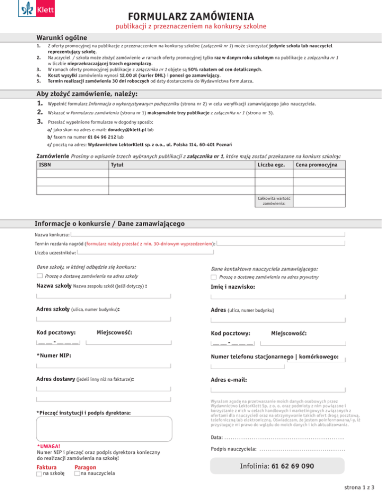 FORMULARZ ZAMÓWIENIA publikacji z przeznaczeniem na konkursy szkolne Warunki ogólne 1. 2. 3. 4. 5. Z oferty promocyjnej na publikacje z przeznaczeniem na konkursy szkolne (załącznik nr 1) może skorzystać jedynie szkoła lub nauczyciel reprezentujący szkołę. Nauczyciel / szkoła może złożyć zamówienie w ramach oferty promocyjnej tylko raz w danym roku szkolnym na publikacje z załącznika nr 1 w liczbie nieprzekraczającej trzech egzemplarzy. W ramach oferty promocyjnej publikacje z załącznika nr 1 objęte są 50% rabatem od cen detalicznych. Koszt wysyłki zamówienia wynosi 12,00 zł (kurier DHL) i ponosi go zamawiający. Termin realizacji zamówienia 30 dni roboczych od daty dostarczenia do Wydawnictwa formularza. Aby złożyć zamówienie, należy: 1. Wypełnić formularz Informacja o wykorzystywanym podręczniku (strona nr 2) w celu weryfikacji zamawiającego jako nauczyciela. 2. Wskazać w Formularzu zamówienia (strona nr 1) maksymalnie trzy publikacje z załącznika nr 1 (strona nr 3). 3. Przesłać wypełnione formularze w dogodny sposób: a/ jako skan na adres e-mail: [email protected] lub b/ faxem na numer 61 84 96 212 lub c/ pocztą na adres: Wydawnictwo LektorKlett sp. z o.o., ul. Polska 114, 60-401 Poznań Zamówienie Prosimy o wpisanie trzech wybranych publikacji z załącznika nr 1, które mają zostać przekazane na konkurs szkolny: ISBN Tytuł Liczba egz. Cena promocyjna Całkowita wartość zamówienia: Informacje o konkursie / Dane zamawiającego Nazwa konkursu: Termin rozdania nagród (formularz należy przesłać z min. 30-dniowym wyprzedzeniem): Liczba uczestników: Dane szkoły, w której odbędzie się konkurs: Proszę o dostawę zamówienia na adres szkoły Dane kontaktowe nauczyciela zamawiającego: Proszę o dostawę zamówienia na adres prywatny Nazwa szkoły Nazwa zespołu szkół (jeśli dotyczy) : Imię i nazwisko: Adres szkoły (ulica, numer budynku): Adres (ulica, numer budynku) Kod pocztowy: Kod pocztowy: Miejscowość: __ __ - __ __ __ Miejscowość: __ __ - __ __ __ *Numer NIP: Numer telefonu stacjonarnego | komórkowego: Adres dostawy (jeżeli inny niż na fakturze): Adres e-mail: *Pieczęć instytucji i podpis dyrektora: Wyrażam zgodę na przetwarzanie moich danych osobowych przez Wydawnictwo LektorKlett Sp. z o. o. oraz podmioty z nim powiązane i korzystanie z nich w celach handlowych i marketingowych związanych z ofertami dla nauczycieli oraz na otrzymywanie takich ofert drogą pocztową, telefoniczną lub elektroniczną. Oświadczam, że jestem poinformowana/-y, iż przysługuje mi prawo do wglądu do moich danych i ich aktualizowania. Data: ......................................................... *UWAGA! Numer NIP i pieczęć oraz podpis dyrektora konieczny do realizacji zamówienia na szkołę! Faktura na szkołę Paragon Podpis nauczyciela: ......................................... Infolinia: 61 62 69 090 na nauczyciela strona 1 z 3 Formularz można przesłać: – pocztą na adres: Wydawnictwo LektorKlett, ul. Polska 114, 60-401 Poznań 61 84 96 212 – faxem: – e-mail (skan): [email protected] Informacja o wykorzystywanym podręczniku w roku szkolnym 2014/2015 Typ szkoły*: Potwierdzam, że w roku szkolnym 2014/2015 moi uczniowie będą korzystać z podręczników: w klasie 1 (4): w klasie 2 (5): w klasie 3 (6): w klasie 4**: Tytuł: Tom: Liczba moich klas na danym poziomie: Szacunkowa liczba moich uczniów na danym poziomie: * Szkoła podstawowa klasy 1-3, Szkoła podstawowa klasy 4-6, Gimnazjum, Liceum, Technikum, Zasadnicza Szkoła Zawodowa, Uczelnia Wyższa, Szkoła Językowa. ** Dotyczy nauczycieli techników. Podpis i pieczątka dyrektora szkoły Imię i nazwisko: Dane kontaktowe nauczyciela zamawiającego: Adres (ulica, numer budynku): Dane szkoły: Nazwa zespołu szkół (jeśli dotyczy): Kod pocztowy: Nazwa szkoły: Numer telefonu stacjonarnego: Adres szkoły (ulica, numer budynku): Numer telefonu komórkowego: Kod pocztowy: Adres e-mail: Miejscowość: Miejscowość: Wyrażam zgodę na przetwarzanie moich danych osobowych przez Wydawnictwo LektorKlett Sp. z o. o. oraz podmioty z nim powiązane i korzystanie z nich w celach handlowych i marketingowych związanych z ofertami dla nauczycieli oraz na otrzymywanie takich ofert drogą pocztową, telefoniczną lub elektroniczną. Oświadczam, że jestem poinformowana/-y, iż przysługuje mi prawo do wglądu do moich danych i ich aktualizowania. Data Podpis nauczyciela: Infolinia 61 62 69 090 strona 2 z 3 Załącznik nr 1 Publikacje z przeznaczeniem na konkursy szkolne* Język niemiecki ISBN cena detaliczna cena z rabatem 50% Wielki słowniki niemiecko-polski 978-83-7429-384-6 179,00 zł 89,50 zł Słownik tematyczny niemiecki 978-83-7429-233-7 29,90 zł 14,95 zł Słuchaj i mów. Niemiecki. Podstawy 978-83-7608-554-8 24,90 zł 12,45 zł Czasy i czasowniki błyskawicznie - niemiecki /Tabela gramatyczna 978-83-7429-031-9 10,99 zł 5,50 zł Błyskawiczna gramatyka pons / Tabela gramatyczna 5,50 zł 978-83-7429-021-0 10,99 zł 5,50 zł Direkt - Gramatyka języka niemieckiego z ćwiczeniami 978-83-7608-038-3 35,00 zł 17,50 zł Hallo - ćwiczenia leksykalne dla szkoły podstawowej 978-83-7429-018-0 17,00 zł 8,50 zł Repetytorium maturalne Direkt - poziom podstawowy matura 2015 978-83-7715-599-8 41,00 zł 20,50 zł Zadania i arkusze maturalne - język niemiecki. Poziom podstawowy i rozszerzony 978-83-7715-659-9 19,00 zł 9,50 zł Gramatyka z ćwiczeniami - niemiecki / początkujący i średniozaawansowani 978-83-7608-102-1 35,90 zł 17,95 zł Podręczny słownik obrazkowy. Niemiecki 978-83-7715-570-7 39,90 zł 19,95 zł Repetytorium leksykalne. Niemiecki 978-83-7608-524-1 29,90 zł 14,95 zł Niemiecki dla całkiem zielonych 978-83-7715-133-4 34,90 zł 17,45 zł Repetytorium maturalne. Słownictwo krok po kroku 978-83-7608-752-8 34,90 zł 17,45 zł Repetytorium gimnazjalne Magnet 978-83-7715-236-2 36,00 zł 18,00 zł cena detaliczna cena z rabatem 50% Język francuski ISBN 