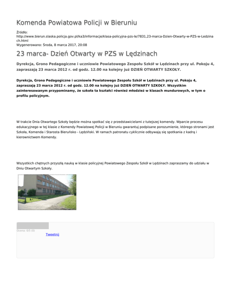 Komenda Powiatowa Policji w Bieruniu Źródło: http://www.bierun.slaska.policja.gov.pl/ka3/informacje/klasa-policyjna-pzs-le/7831,23-marca-Dzien-Otwarty-w-PZS-w-Ledzina ch.html Wygenerowano: Środa, 8 marca 2017, 20:08 23 marca- Dzień Otwarty w PZS w Lędzinach Dyrekcja, Grono Pedagogiczne i uczniowie Powiatowego Zespołu Szkół w Lędzinach przy ul. Pokoju 4, zapraszają 23 marca 2012 r. od godz. 12.00 na kolejny już DZIEŃ OTWARTY SZKOŁY. Dyrekcja, Grono Pedagogiczne i uczniowie Powiatowego Zespołu Szkół w Lędzinach przy ul. Pokoju 4, zapraszają 23 marca 2012 r. od godz. 12.00 na kolejny już DZIEŃ OTWARTY SZKOŁY. Wszystkim zainteresowanym przypominamy, że szkoła ta kształci również młodzież w klasach mundurowych, w tym o profilu policyjnym. W trakcie Dnia Otwartego Szkoły będzie można spotkać się z przedstawicielami z tutejszej komendy. Wparcie procesu edukacyjnego w tej klasie z Komendy Powiatowej Policji w Bieruniu gwarantuj podpisane porozumienie, którego stronami jest Szkoła, Komenda i Starosta Bieruńsko - Lędziński. W ramach patronatu cyklicznie odbywają się spotkania z kadrą i kierownictwem Komendy. Wszystkich chętnych przyszłą nauką w klasie policyjnej Powiatowego Zespołu Szkół w Lędzinach zapraszamy do udziału w Dniu Otwartym Szkoły. Ocena: 0/5 (0) Tweetnij