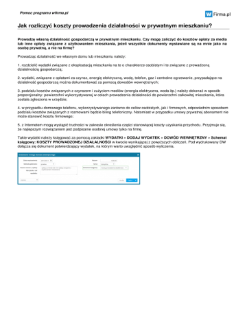 Pomoc programu wfirma.pl Jak rozliczyć koszty prowadzenia działalności w prywatnym mieszkaniu? Prowadzę własną działalność gospodarczą w prywatnym mieszkaniu. Czy mogę zaliczyć do kosztów opłaty za media lub inne opłaty związane z użytkowaniem mieszkania, jeżeli wszystkie dokumenty wystawiane są na mnie jako na osobę prywatną, a nie na firmę? Prowadząc działalność we własnym domu lub mieszkaniu należy: 1. rozdzielić wydatki związane z eksploatacją mieszkania na te o charakterze osobistym i te związane z prowadzoną działalnością gospodarczą; 2. wydatki, związane z opłatami za czynsz, energię elektryczną, wodę, telefon, gaz i centralne ogrzewanie, przypadające na działalność gospodarczą można dokumentować za pomocą dowodów wewnętrznych; 3. podziału kosztów związanych z czynszem i zużyciem mediów (energia elektryczna, woda itp.) należy dokonać w sposób proporcjonalny: powierzchni wykorzystywanej w celach prowadzenia działalności do powierzchni całkowitej mieszkania, która została zgłoszona w urzędzie; 4. w przypadku domowego telefonu, wykorzystywanego zarówno do celów osobistych, jak i firmowych, odpowiednim sposobem podziału kosztów związanych z rozmowami będzie biling telefoniczny. Natomiast w przypadku umowy prywatnej abonament nie może stanowić kosztu firmowego; 5. z Internetem mogą wystąpić trudności w zakresie określenia części stanowiącej koszty uzyskania przychodu. Przyjmuje się, że najlepszym rozwiązaniem jest podpisanie osobnej umowy tylko na firmę. Takie wydatki należy księgować za pomocą zakładki WYDATKI » DODAJ WYDATEK » DOWÓD WEWNĘTRZNY » Schemat księgowy: KOSZTY PROWADZONEJ DZIAŁALNOŚCI w kwocie wynikającej z powyższych obliczeń. Pod wydrukowany DW dołącza się dokument potwierdzający wydatek, na którym warto uwzględnić sposób wyliczenia. Powered by TCPDF (www.tcpdf.org)