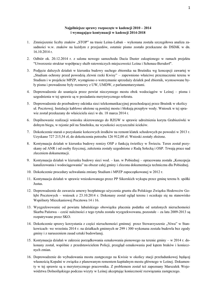 1 Najpilniejsze sprawy rozpoczęte w kadencji 2010 – 2014 i wymagające kontynuacji w kadencji 2014-2018 1. Zmniejszenie liczby znaków „STOP” na trasie Leśna-Lubań – wykonana została szczegółowa analiza zasadności w.w. znaków na każdym z przejazdów, ostatnie pismo zostało przekazane do DSDiK w dn. 16.10.2014 r. 2. Odbiór ok. 20.12.2014 r. z salonu nowego samochodu Dacia Duster zakupionego w ramach projektu "Utworzenie struktur współpracy służb ratowniczych miejscowości Leśna i Schonau-Bersdorf". 3. Podjęcie dalszych działań w kierunku budowy suchego zbiornika na Bruśniku wg koncepcji zawartej w „Studium ochrony przed powodzią zlewni rzeki Kwisy” – zapewniono właściwe przeznaczenie terenu w Studium i w projekcie MPZP, wystąpiono o wstrzymanie sprzedaży działek pod zbiornik, wystosowane były pisma i prowadzone były rozmowy z UW, UMDW, z parlamentarzystami. 4. Doprowadzenie do usunięcia przez powiat nieczynnego mostu obok wodociągów w Leśnej – pisma i uzgodnienia w tej sprawie są w posiadaniu merytorycznego referatu. 5. Doprowadzenie do przebudowy odcinka sieci telekomunikacyjnej przechodzącej przez Bruśnik w okolicy ul. Pocztowej. Instalacje kablowe ułożone są poniżej mostu i blokują przepływ wody. Wniosek w tej sprawie został przekazany do właściciela sieci w dn. 18 marca 2014 r. 6. Dopilnowanie realizacji wniosku skierowanego do RZGW w sprawie udrożnienia koryta Grabiszówki w dolnym biegu, w rejonie pól na Smolniku, na wysokości oczyszczalni ścieków. 7. Dokończenie starań o pozyskanie końcowych środków na remont klatek schodowych po powodzi w 2013 r. Uzyskano 727 215,54 zł, do dokończenia potrzeba 126 912,00 zł. Wnioski zostały złożone. 8. Kontynuacja działań w kierunku budowy remizy OSP z funkcją świetlicy w Świeciu. Teren został pozyskany od ANR i od osoby fizycznej, założenia zostały uzgodnione z Radą Sołecką i OSP. Trwają prace nad zleceniem dokumentacji. 9. Kontynuacja działań w kierunku budowy sieci wod. – kan. w Pobiednej – opracowana została „Koncepcja kanalizowania i wodociągowania” na obszar całej gminy i zlecona dokumentacja techniczna dla Pobiednej. 10. Dokończenie procedury uchwalania zmiany Studium i MPZP zapoczątkowanej w 2012 r. 11. Kontynuacja działań w sprawie wnioskowanego przez PP Sikorskich wykupu przez gminę terenu b. spółki Justas. 12. Doprowadzenie do zawarcia umowy bezpłatnego użyczenia gruntu dla Polskiego Związku Hodowców Gołębi Pocztowych – wniosek z 23.10.2014 r. Dokonany został ogląd terenu i oczekuje się na stanowisko Wspólnoty Mieszkaniowej Pocztowa 14 i 16. 13. Wyegzekwowanie od powiatu lubańskiego obowiązku płacenia podatku od ustalonych nieruchomości Skarbu Państwa – cześć należności z tego tytułu została wyegzekwowana, pozostałe – za lata 2009-2013 są rozpatrywane przez SKO. 14. Dokończenie sprawy korzystania z części nieruchomości gminnej przez Stowarzyszenie „Niwa” w Stankowicach- we wrześniu 2014 r. na działkach gminnych nr 299 i 300 wykonana została budowla bez zgody gminy i z naruszeniem zasad sztuki budowlanej. 15. Kontynuacja działań w zakresie porządkowania oznakowania pionowego na terenie gminy – w 2014 r. dokonany został, wspólnie z przedstawicielem Policji, przegląd oznakowania pod kątem braków i koniecznych zmian. 16. Doprowadzenie do wybudowania mostu zastępczego na Kwisie w okolicy stacji przeładunkowej będącej własnością Kopalni w związku z planowanym remontem kapitalnym mostu głównego w Leśnej. Dokumenty w tej sprawie są u merytorycznego pracownika. Z problemem został też zapoznany Marszałek Województwa Dolnośląskiego podczas wizyty w Leśnej akceptując konieczność rozwiązania zastępczego. 2 17. Realizacja wniosku Dolnośląskiego Wojewódzkiego Inspektora Nadzoru Geodezyjnego i Kartograficznego we Wrocławiu o sprawdzenie przez Radę Miejską prawidłowości działań w 1983 r. dotyczących nadania nr nieruchomości usytuowanej na działce 381/3 w Leśnej. 18. Kontynuacja działań w celu budowy 150 m odcinka drogi gminnej nr 265/1 i 265/2 o nawierzchni asfaltowej – wykonana została dokumentacja techniczna i prowadzone były uzgodnienia z Kopalnią Grabiszyce. 19. Kontynuacja działań w celu utworzenia miejsca pamięci narodowej w miejscu b. filii obozu Gross - Rosen w Miłoszowie – zaplanowano właściwe przeznaczenie terenu na ten cel w Studium i w projekcie MPZP, podjęte zostały rozmowy z właścicielem terenu w celu ustalenia warunków przejęcia działki przez gminę. 20. Usuniecie przez wykonawcę w ramach gwarancji nieszczelności instalacji chłodzącej na lodowisku. Próba szczelności została wykonana w dn. 29.10.2014 r., wykonawca został wezwany do usunięcia usterki. 21. Kontynuacja działań w celu utworzenia drogi gminnej umożliwiającej dojazd do Hotelu Czocha od drogi Leśna - Bożkowice wzdłuż Zalewu (przedłużenie drogi gminnej). Prowadzone były negocjacje, aby przejęcie niezbędnych gruntów na rzecz Gminy odbyło się na zasadzie zamiany. Dokumentacja znajduje się w merytorycznym referacie. 22. Udzielenie niezbędnej i zgodnej z kompetencjami Urzędu pomocy potencjalnemu inwestorowi, który nabył działkę nr 698/1 w Leśnej (za targowiskiem) w celu budowy obiektu handlowego. 23. Kontynuacja działań w zakresie pozyskania środków na rewitalizację i zagospodarowanie budynku b. dworca PKP w Leśnej – budynek z przynależnym placem parkingowym został przejęty przez Gminę w grudniu 2013 r., wykonane zostały roboty zabezpieczające (dach, rynny), uporządkowano sprawy meldunkowe osób w znajdującym się tam lokalu mieszkalnym, przygotowane jest przeniesienie lokatora, prowadzone były dyskusje nad możliwym sposobem wykorzystania obiektu (gastronomia, turystyka, muzeum, handel, MGOPS – w zależności od możliwych do pozyskania środków). 24. Realizacja w ramach porozumienia międzygminnego z dnia 14 sierpni