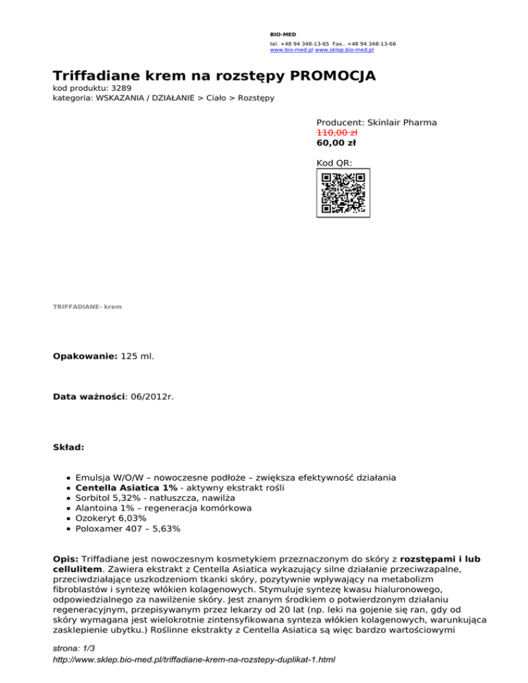 BIO-MED tel. +48 94 348-13-65 Fax.. +48 94 348-13-66 www.bio-med.pl www.sklep.bio-med.pl Triffadiane krem na rozstępy PROMOCJA kod produktu: 3289 kategoria: WSKAZANIA / DZIAŁANIE > Ciało > Rozstępy Producent: Skinlair Pharma 110,00 zł 60,00 zł Kod QR: TRIFFADIANE- krem Opakowanie: 125 ml. Data ważności: 06/2012r. Skład: Emulsja W/O/W – nowoczesne podłoże – zwiększa efektywność działania Centella Asiatica 1% - aktywny ekstrakt rośli Sorbitol 5,32% - natłuszcza, nawilża Alantoina 1% – regeneracja komórkowa Ozokeryt 6,03% Poloxamer 407 – 5,63% Opis: Triffadiane jest nowoczesnym kosmetykiem przeznaczonym do skóry z rozstępami i lub cellulitem. Zawiera ekstrakt z Centella Asiatica wykazujący silne działanie przeciwzapalne, przeciwdziałające uszkodzeniom tkanki skóry, pozytywnie wpływający na metabolizm fibroblastów i syntezę włókien kolagenowych. Stymuluje syntezę kwasu hialuronowego, odpowiedzialnego za nawilżenie skóry. Jest znanym środkiem o potwierdzonym działaniu regeneracyjnym, przepisywanym przez lekarzy od 20 lat (np. leki na gojenie się ran, gdy od skóry wymagana jest wielokrotnie zintensyfikowana synteza włókien kolagenowych, warunkująca zasklepienie ubytku.) Roślinne ekstrakty z Centella Asiatica są więc bardzo wartościowymi strona: 1/3 http://www.sklep.bio-med.pl/triffadiane-krem-na-rozstepy-duplikat-1.html składnikami kosmetyków przeciwdziałających rozstępom skóry. Triffadiane posiada kompleksową recepturę, o poliwalentnym (wielokierunkowym) silnym działaniu na naskórek i głębsze warstwy skóry, prowadzącym do poprawy ich elastyczności, nawilżenia i kondycji. Skuteczność i bezpieczeństwo zawartych w kremie składników została naukowo potwierdzona. Zarówno badania kliniczne (przeprowadzane również na kobietach w ciąży), jak i praktyka dowodzą, że Triffadiane jest sprawdzającym się kosmeceutykiem w zapobieganiu i leczeniu rozstępów. Triffadiane posiada skuteczność leku o dużej akceptowalności kosmetycznej, dzięki aktywnym składnikom i nowatorskiemu podłożu (podłoże kremu jest równie ważne jak składniki aktywne, ponieważ skóra dobrze nawilżona łatwiej się regeneruje) - trójfazowej emulsji - O/W/O, zawierającej obok siebie dwie fazy tłuszczowe rozdzielone fazą wodną. Dzięki tej technologii uzyskano: - bardzo wysoką użytkową wartość kremu, który wydaje się być mniej tłusty niż jest w rzeczywistości - biodostępność aktywnych składników “przenoszonych” w wewnętrznej fazie oleistej - trwałe (ponad 18 godzin) działanie ochronne i nawilżające kremu, który tworząc na skórze strefę na wpół okluzyjną optymalnie hamuje ucieczkę wody z naskórka. Właściwości: Leczy-zapobiega powiększaniu się rozstępów, zmniejsza już istniejące. Zapobiega – chroni przed pojawieniem się rozstępów. Zabezpiecza przed szkodliwym wpływem kortyzolu, powodującego „kruchość” skóry. Wskazania: Jako profilaktyka lub leczenie rozstępów u kobiet ciężarnych, nastolatek w okresie dojrzewania, przy otyłości - Podczas diety niskokalorycznej Osoby z genetyczną predyspozycją polegającą na „kruchości” skóry, związaną ze słabiej rozwiniętą siecią kolagenowych włókien podporowych Kulturyści (szybki, niekontrolowany przyrost masy mięśniowej, przyjmowanie sterydów) Sposób użycia: Stosować raz dziennie na miejsca objęte zmianami przez okres 3 miesięcy. Ważne: Powodem tworzenia się rozstępów jest „niewspółmierność” pomiędzy wytrzymałością skóry i siłami rozciągającymi ją (np. w wyniku szybkiego przytycia, wyczynowego sportu, itp.) Za wytrzymałość mechaniczną skóry odpowiedzialne są włókna kolagenowe. U wielu osób rozstępy tworzą się w wyniku pewnej genetycznej predyspozycji. Okresem sprzyjającym jest ciąża, okres dojrzewania, otyłość, menopauza. Dochodzi wówczas do zwiększonej produkcji kortyzolu – hormonu kory nadnerczy, który upośledza funkcje fibroblastów, co z kolei spowalnia odnowę komórkową i syntezę kolagenu. Efektem wtórnym jest atrofia (zanik) skóry i rozstępy. Pojawienie się rozstępów na skórze zawsze wskazuje na patologię fibroblastu, a w konsekwencji: pękanie kolagenu. Gdy fibroblast „choruje” dwa podstawowe białka strukturalne (kolagen i elastyna), odpowiedzialne za elastyczność, nawilżenie i kondycję skóry są zmienione, co powoduje jej kruchość. Wzmocnienie tej sieci np. poprzez stosowanie kosmetyku stymulującego powstawanie kolagenu w fibroblastach korzystnie wpływa na tendencję do rozstępów u osób predysponowanych, a więc ludzi otyłych, nastolatek w okresie dojrzewania, kobiet w ciąży, w okresie okołomenopauzalnym i menopauzy, u kulturystów, w czasie przyjmowania kortykoidów, w trakcie diety niskokalorycznej, przy skłonnościach genetycznych. strona: 2/3 http://www.sklep.bio-med.pl/triffadiane-krem-na-rozstepy-duplikat-1.html Obecnie problem rozstępów dotyczy coraz większej populacji zarówno bardzo młodych, jak i dojrzałych ludzi. Niepokojące są statystyki, wykazujące wzrastającą liczbę mężczyzn, zgłaszających się do lekarzy właśnie z rozstępami. Dziesięć lat temu na 10 leczonych z powodu rozstępów kobiet przypadał statystycznie jeden mężczyzna. Obecnie stosunek ten wynosi 2,5: 1 (2,5 kobiet na 1 mężczyznę). Jak wyglądają rozstępy? Są to równoległe wrzecionowate pasma najczęściej występujące na pośladkach, brzuchu, piersiach. Rozwijają się dwuetapowo. Pierwsze stadium jest fazą zapalną. Zmiany są czerwone, hypertroficzne (ubytki w tkance miękkiej). Jest to ostatni moment, kiedy stosowanie odpowiednich środków medyczno-kosmetycznych może przynieść zadowalające efekty. W drugim stadium – fazie zanikowej, następuje ich zbielenie, zmniejszenie, a nawet czasem zanikanie, co niestety jest bardzo mylące. Sądzimy wówczas, że problem mija samoistnie, podczas, gdy on się tylko konstytuuje w p