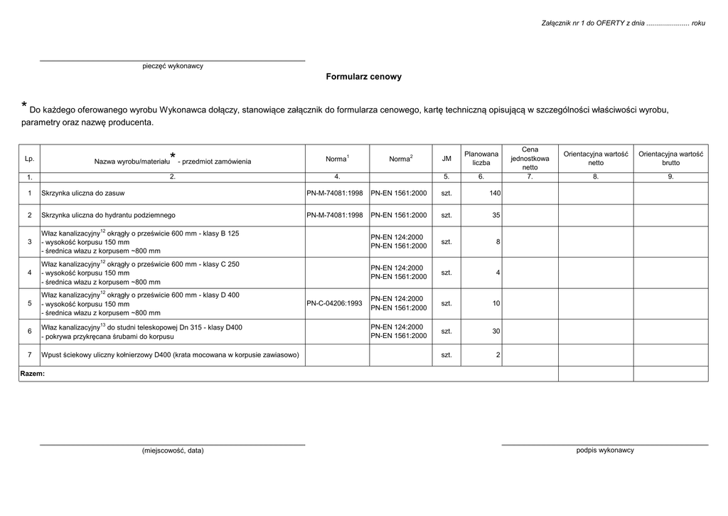 Załącznik nr 1 do OFERTY z dnia ...................... roku pieczęć wykonawcy Formularz cenowy * Do każdego oferowanego wyrobu Wykonawca dołączy, stanowiące załącznik do formularza cenowego, kartę techniczną opisującą w szczególności właściwości wyrobu, parametry oraz nazwę producenta. Lp. Nazwa wyrobu/materiału * - przedmiot zamówienia 2. 1. Norma1 Norma2 4. JM Planowana liczba 5. 6. 1 Skrzynka uliczna do zasuw PN-M-74081:1998 PN-EN 1561:2000 szt. 140 2 Skrzynka uliczna do hydrantu podziemnego PN-M-74081:1998 PN-EN 1561:2000 szt. 35 3 Właz kanalizacyjny12 okrągły o prześwicie 600 mm - klasy B 125 - wysokość korpusu 150 mm - średnica włazu z korpusem ~800 mm PN-EN 124:2000 PN-EN 1561:2000 szt. 8 4 Właz kanalizacyjny12 okrągły o prześwicie 600 mm - klasy C 250 - wysokość korpusu 150 mm - średnica włazu z korpusem ~800 mm PN-EN 124:2000 PN-EN 1561:2000 szt. 4 5 Właz kanalizacyjny12 okrągły o prześwicie 600 mm - klasy D 400 - wysokość korpusu 150 mm - średnica włazu z korpusem ~800 mm PN-EN 124:2000 PN-EN 1561:2000 szt. 10 6 Właz kanalizacyjny13 do studni teleskopowej Dn 315 - klasy D400 - pokrywa przykręcana śrubami do korpusu PN-EN 124:2000 PN-EN 1561:2000 szt. 30 7 Wpust ściekowy uliczny kołnierzowy D400 (krata mocowana w korpusie zawiasowo) szt. 2 PN-C-04206:1993 Cena jednostkowa netto 7. Orientacyjna wartość netto Orientacyjna wartość brutto 8. 9. Razem: (miejscowość, data) podpis wykonawcy 1 Polskie Normy. 2 Polskie Normy przenoszące europejskie normy zharmonizowane. 12 Właz kanalizacyjny - korpus włazu – pełen odlew, pokrywa przykręcana do korpusu śrubami ze stali nierdzewnej, blokada pokrywy przed jej obrotem w celu uniknięcia ścięcia śrub. Na wyrobie oznaczenie producenta (odlew). 13 Właz kanalizacyjny - korpus włazu – pełen odlew, pokrywa przykręcana do korpusu śrubami ze stali nierdzewnej. Na wyrobie oznaczenie producenta (odlew).